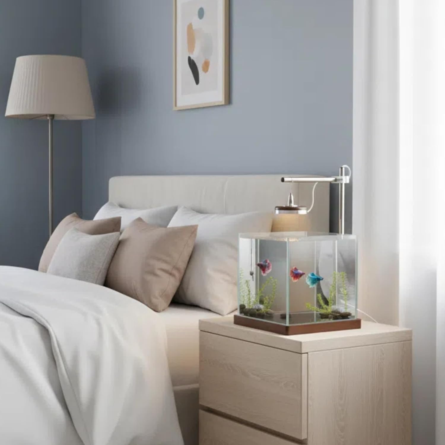 Transform your workspace or living area into a serene oasis with the 8-Inch Nano Aquarium. Crafted for clarity and longevity, the tank is constructed from premium, thickened glass that resists scratching and ensures a brilliantly clear view of your underwater world from every angle. It rests securely on a handsome, minimalist wood base that adds a touch of warm, natural elegance to any setting. The integrated LED lighting system is mounted on a adjustable stainless-steel stand, bathing your aquarium in a bright, shimmering glow. It's perfect for highlighting the magnificent colors of your betta fish or creating a calming ambiance in the evening. We believe in providing a complete experience. That’s why this kit includes essential accessories: a handy water change and fish waste cleaning tool, a ultra-soft microfiber glass cloth for streak-free cleaning, and a protective non-slip mat to safeguard your furniture and ensure tank stability
