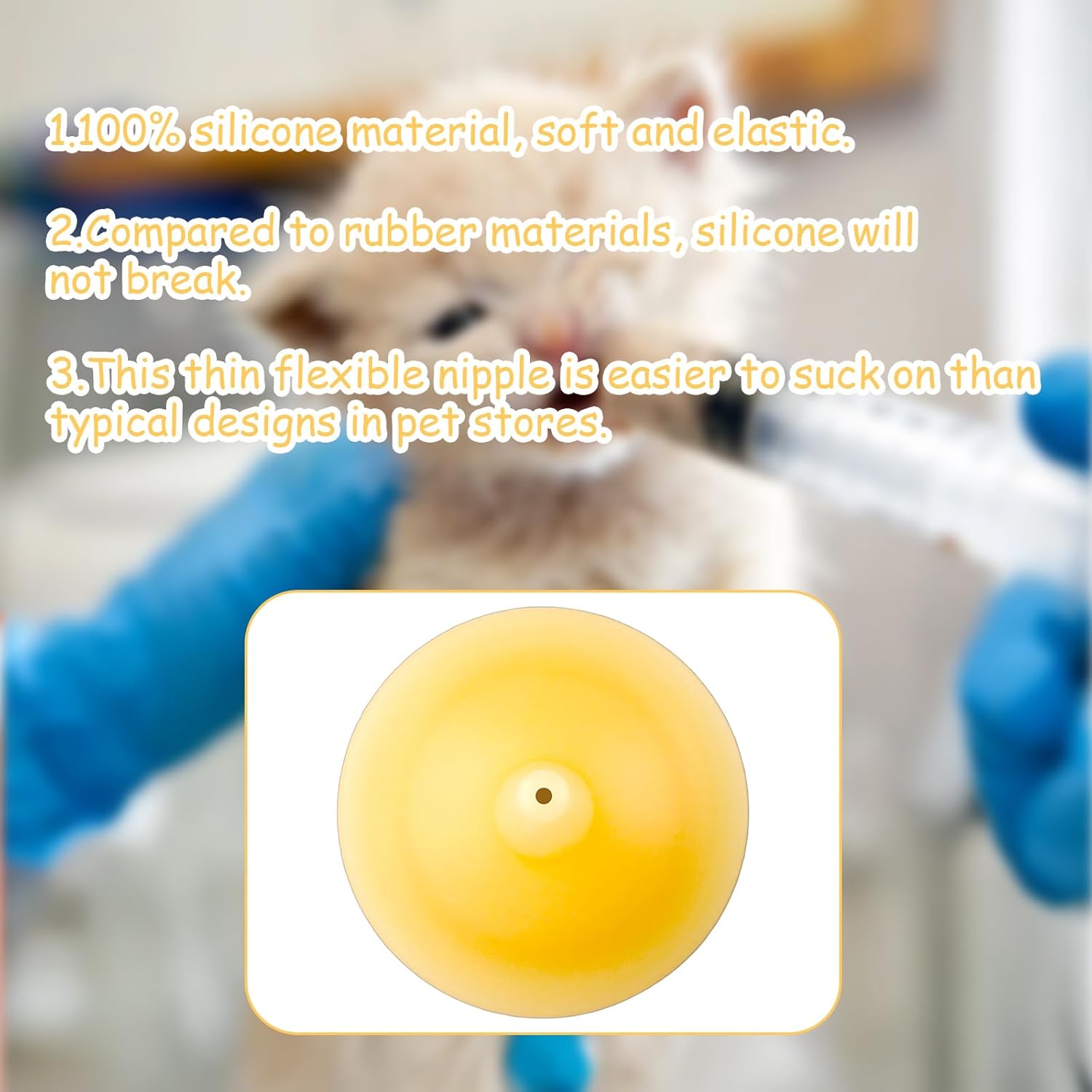 About this item Silicone Material:Our kitten pacifier are made of food grade silicone material, ensuring that there are no strange chemical odors when feeding small animals.The unified opening of the original machine ensures that the nipple has a small opening, allowing liquid food to flow smoothly without any blockage or milk choking. Clear and Legible Scale:The kitten syringe for feeding includes easy-to-read scales to ensure you get the exact dose for each feed, to suit the needs of pets of different ages and sizes. Designed for Pets:The kitten nipple duplicate the milking action of the mother's nipple,designed by the professional veterinarians for natural feeding action.To create a natural and comfortable feeding experience for small animals. Widely Applicable:Kitten bottle feeding kit nipples are suitable for all mammals,including puppies,mice,rabbits,and squirrels.This soft nipple is easier to suck than typical designs found in pet stores. Customer Service: If you have any questions about our products,please feel free to contact us at any time.We are committed to providing you with a satisfactory solution. › See more product details
