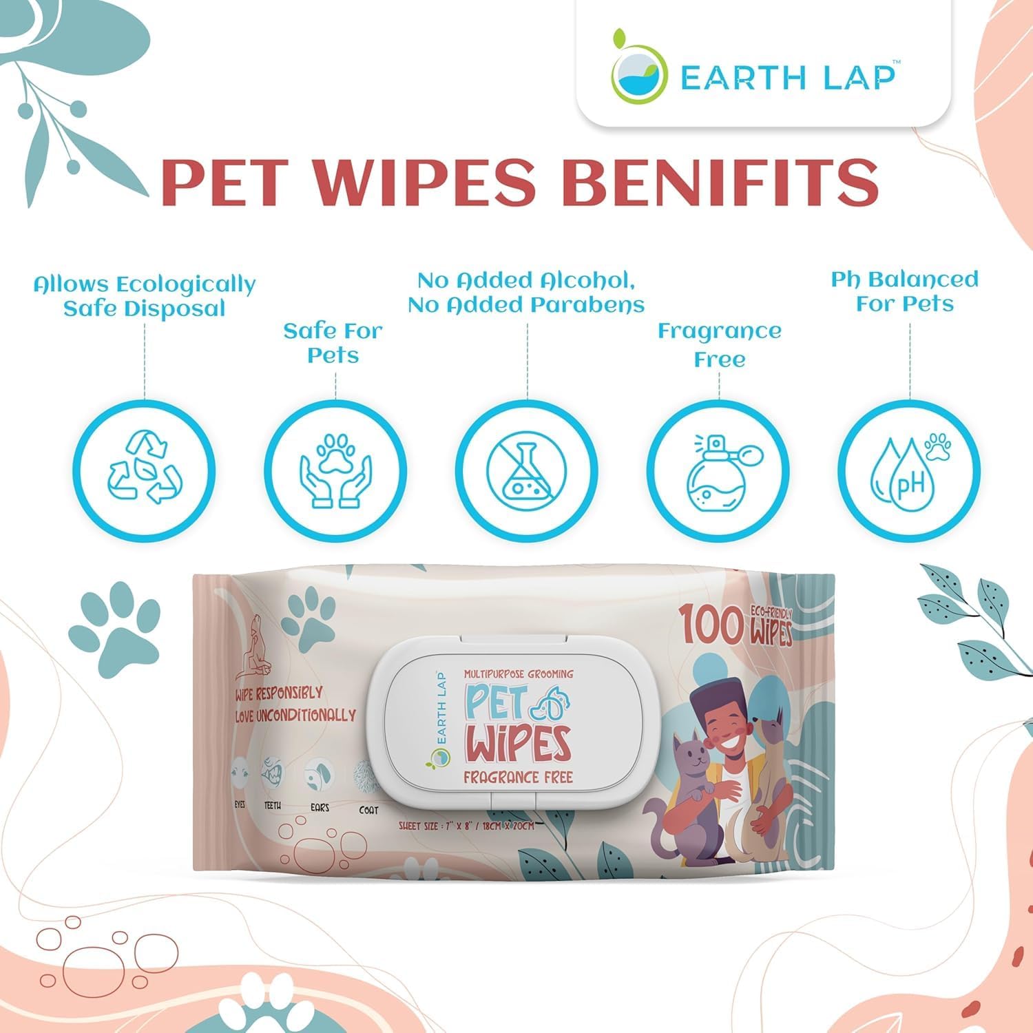 --Plant-based biodegradable dog wipes and cat wipes for safe, gentle cleaning. Perfect paw wipes and grooming wipes for puppies, kittens, and small pets. Eco-friendly daily hygiene solution. --Infused with aloe vera, chamomile, and vitamin E for mild cleansing and conditioning. Hypoallergenic, fragrance-free, alcohol-free pet wipes, safe for sensitive skin on dogs, cats, and rabbits. --Multipurpose pet wipes for dogs, puppies, cats, kittens, and other small pets. Removes dirt, dander, and odor for a fresh, soft coat. Ideal wipes for dogs between baths or outdoor adventures. --Compact resealable pack of 100 wet pet wipes, 7"x8", easy to carry for travel, dog park visits, or hikes. Keeps wipes moist and fresh for quick clean-ups anytime, anywhere. --No parabens, alcohol, sulfates, or harsh chemicals. Gentle puppy wipes and kitten wipes for everyday use on paws, fur, and face. Maintain your pet’s hygiene with confidence and peace of mind. › See more product details