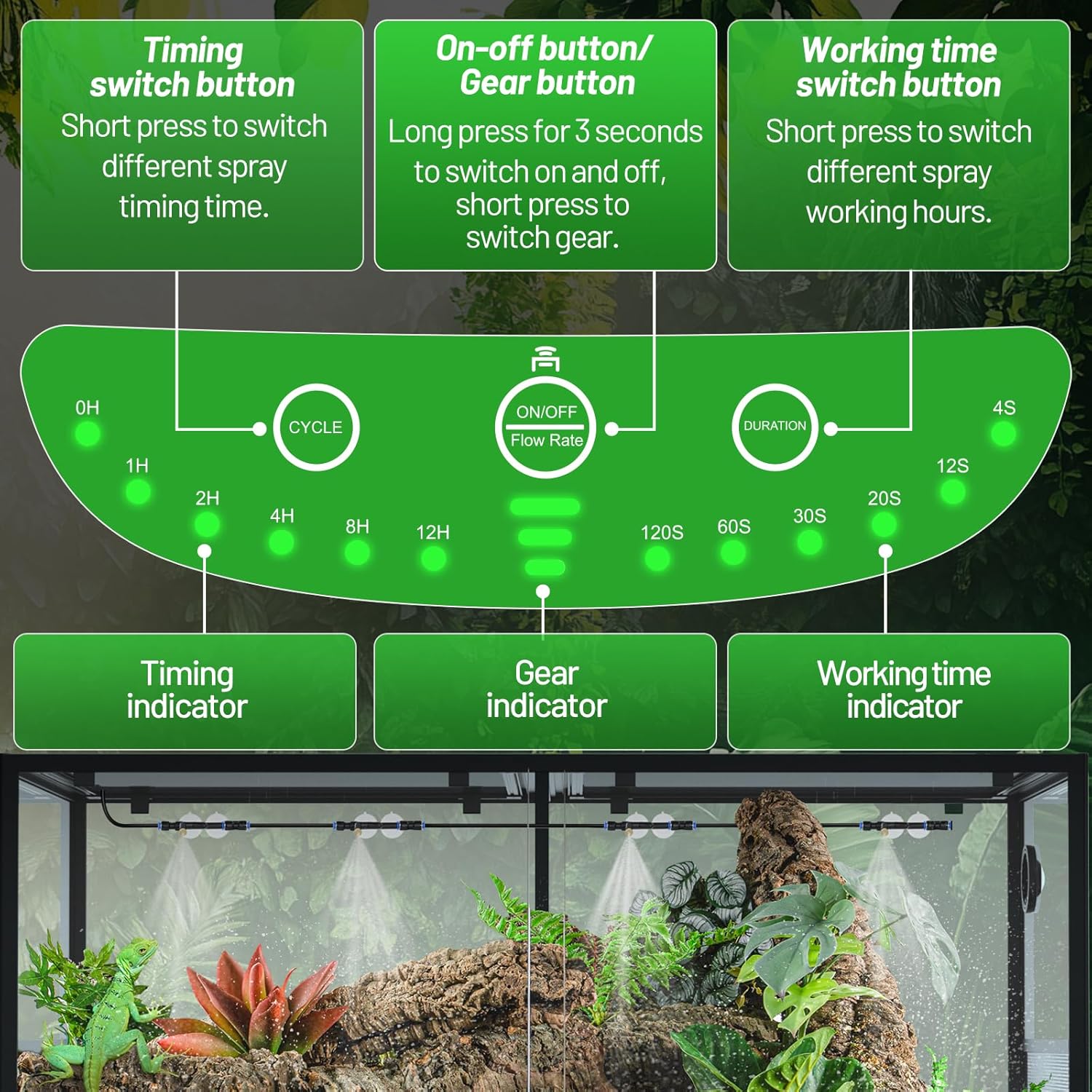 About this item Large 10L Tank & Top Fill Design:Features a large 10L water tank with a convenient top-fill design and integrated visual water level indicator. Prevents leaks and simulates natural rainfall, ideal for tropical reptiles and plants like tree frogs, chameleons, orchids, and moss High Pressure & Ultra-Quiet Pump:Equipped with an upgraded high-pressure pump operating below 55dB. Supports up to 8 nozzles simultaneously (4 included), each with 360° adjustable spray. Flow rate: 0.18L/M (with 2 nozzles) Adjustable Misting & Timer Function:Offers 3 misting modes and customizable timer/cycle settings. Once configured, the system retains your settings automatically—no need to reset after power cycles. Perfect for tailoring humidity to your reptile’s habitat or rainforest landscape Easy Setup & Expandable System:Simple installation with quick-disconnect hoses and suction cups—no glass cutting or plumbing skills required. Supports up to 10 nozzles for larger setups. Backed by a 12-month warranty for peace of mind Quality Assured & Reliable Support:Every unit undergoes strict pre-shipment testing and AQL inspection. Besides, If you find that some products have been used, it is due to a misunderstanding caused by product inspection, and we can assure you that it is absolutely new › See more product details