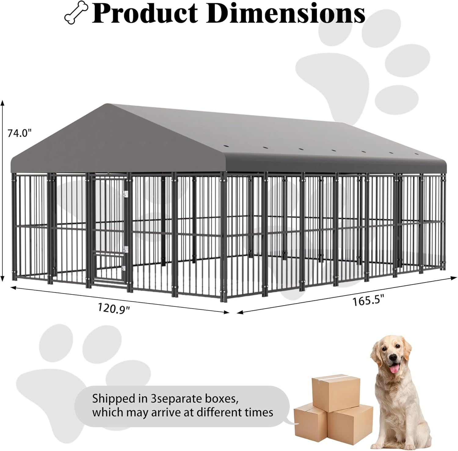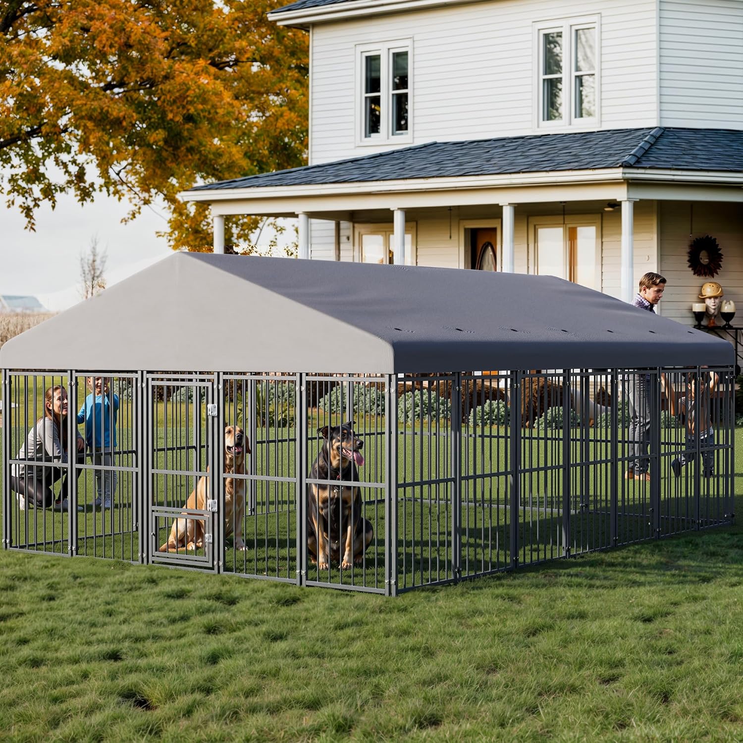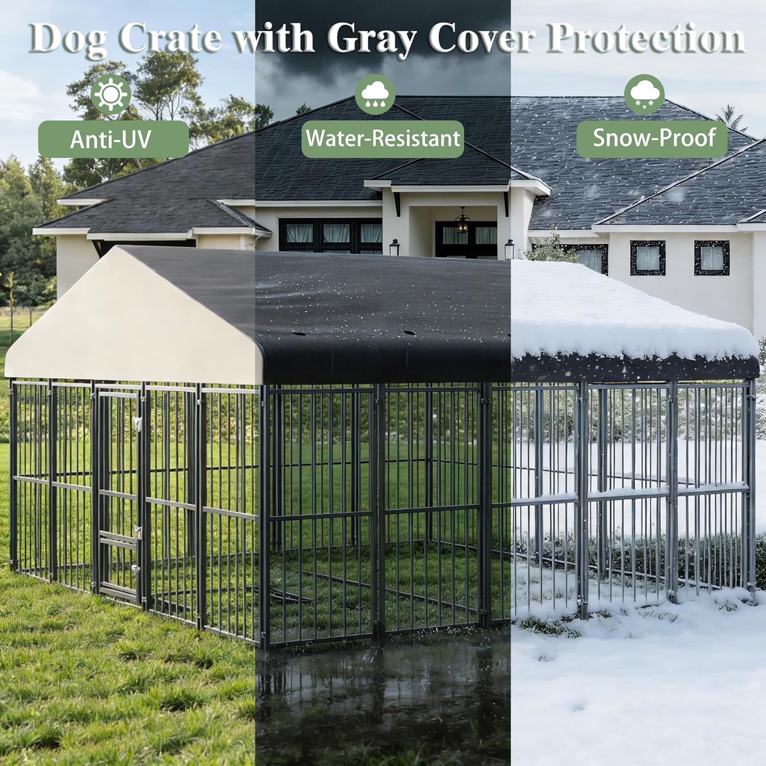 • Unbeatable Strength & Chew-Proof Security This outdoor dog kennel is built with welded galvanized iron pipe—stronger than traditional wire mesh—to resist bending, chewing, and escape. Reinforced with ground stakes and a heavy-duty frame, it provides a fortress-like enclosure that keeps large breeds safely contained and protected