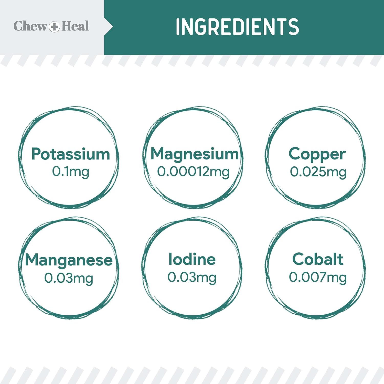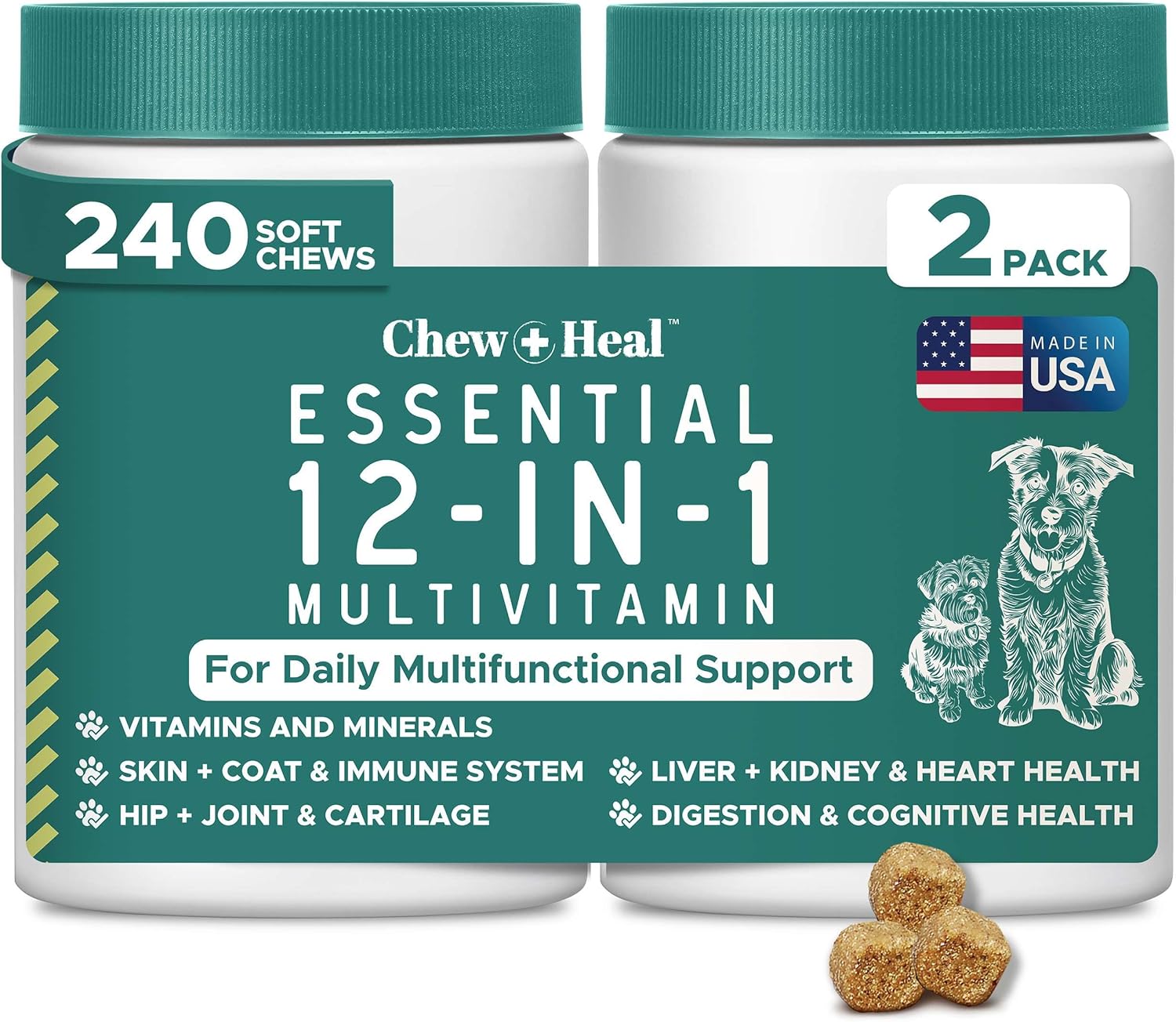 About this item Chew + Heal's dog multivitamin is a soft chew supplement packed with vitamins, minerals, and probiotics to help your dog feel his best! Our senior dog supplements for hip and joint are crafted with glucosamine HCl, chondroitin sulfate, and calcium. it also helps maintain healthy cartilage and joint flexibility, supporting your dog’s mobility. Our immune support for dogs includes a canine-specific probiotic blend, vitamin B-complex (B1, B2, B6, B12), and vitamin C to help maintain gut health, aid nutrient absorption, support daily digestive comfort, and bolster immune health.. These dog vitamins for itchy skin features omegas 3, 6, and 9, flaxseed, vitamin E, biotin, and zinc to help promote a glossy coat and support healthy skin, reducing itching and common signs of dryness or dullness in aging dogs. Our multi vitamin for dogs hip and joint health is crafted with a high level of glucosamine HCl, chondroitin sulfate, and calcium. It also helps maintain healthy cartilage and joint flexibility, supporting your dog’s mobility through their golden years. There are 240 of our pet vitamin and supplement soft chews per bottle, each one has a delicious chicken flavor. Good for all breeds and for small, medium, and large dogs. See the packaging for serving recommendations. › See more product details