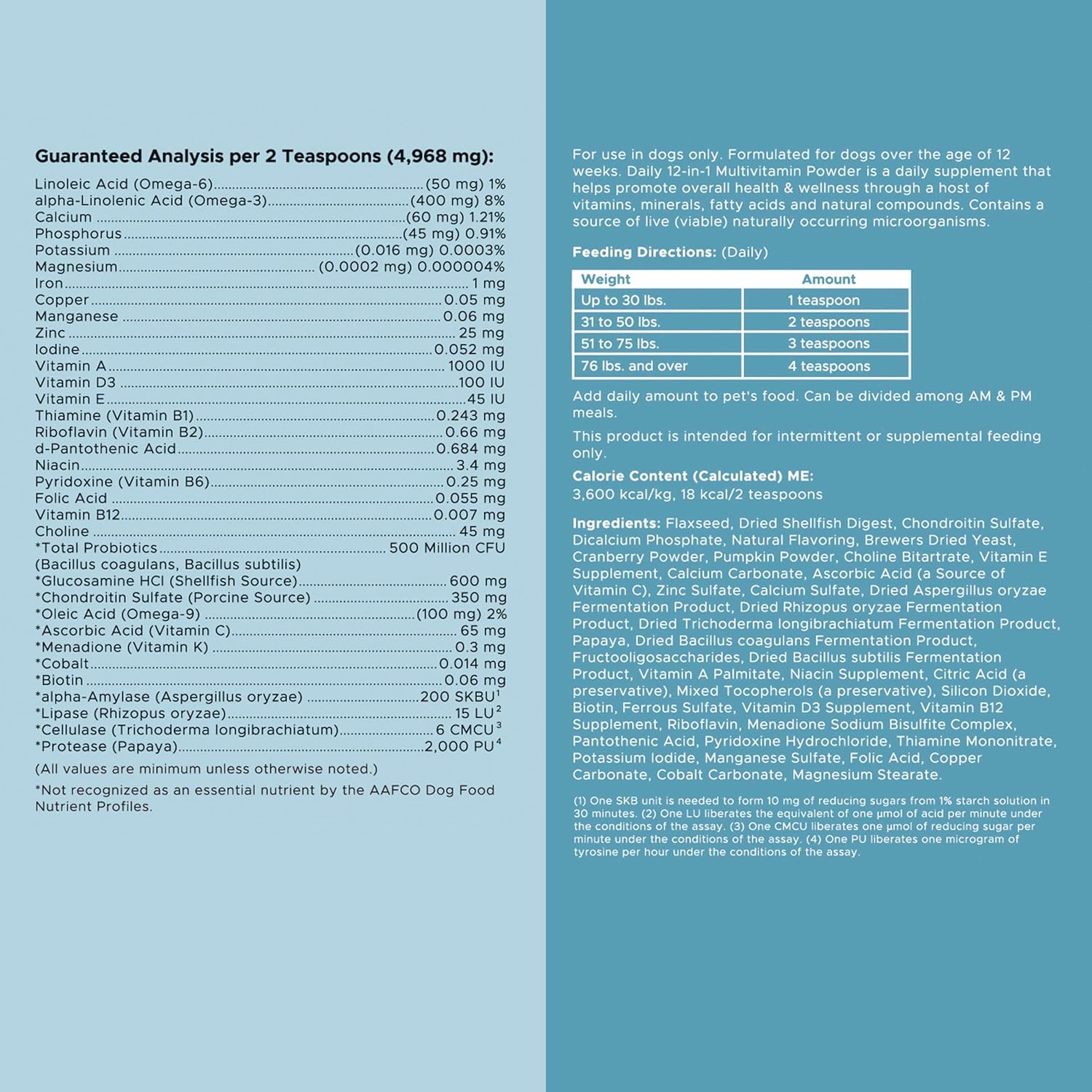 About this item Chew + Heal's dog multivitamin is a powder supplement packed with vitamins, minerals, and probiotics to help your dog feel his best, whether he's a puppy or a senior dog. Our senior dog supplements for hip and joint are crafted with glucosamine HCl, chondroitin sulfate, and calcium. it also helps maintain healthy cartilage and joint flexibility, supporting your dogβs mobility. Our immune support for dogs includes a canine-specific probiotic blend, vitamin B-complex (B1, B2, B6, B12), and vitamin C to help maintain gut health, aid nutrient absorption, support daily digestive comfort, and bolster immune health.. These dog vitamins for itchy skin features omegas 3, 6, and 9, flaxseed, vitamin E, biotin, and zinc to help promote a glossy coat and support healthy skin, reducing itching and common signs of dryness or dullness in aging dogs. Calcium helps to bind to excess phosphorus (also important for kidney health), so the body can maintain healthy kidney function. Vitamins A, B9, D, E, and K all help optimize liver and kidney health. There are 14 ounces of our pet vitamin and supplement powder per jar, and it's easy to mix into dry or wet food. Good for all breeds and for small, medium, and large dogs. See the packaging for serving recommendations. βΊ See more product details