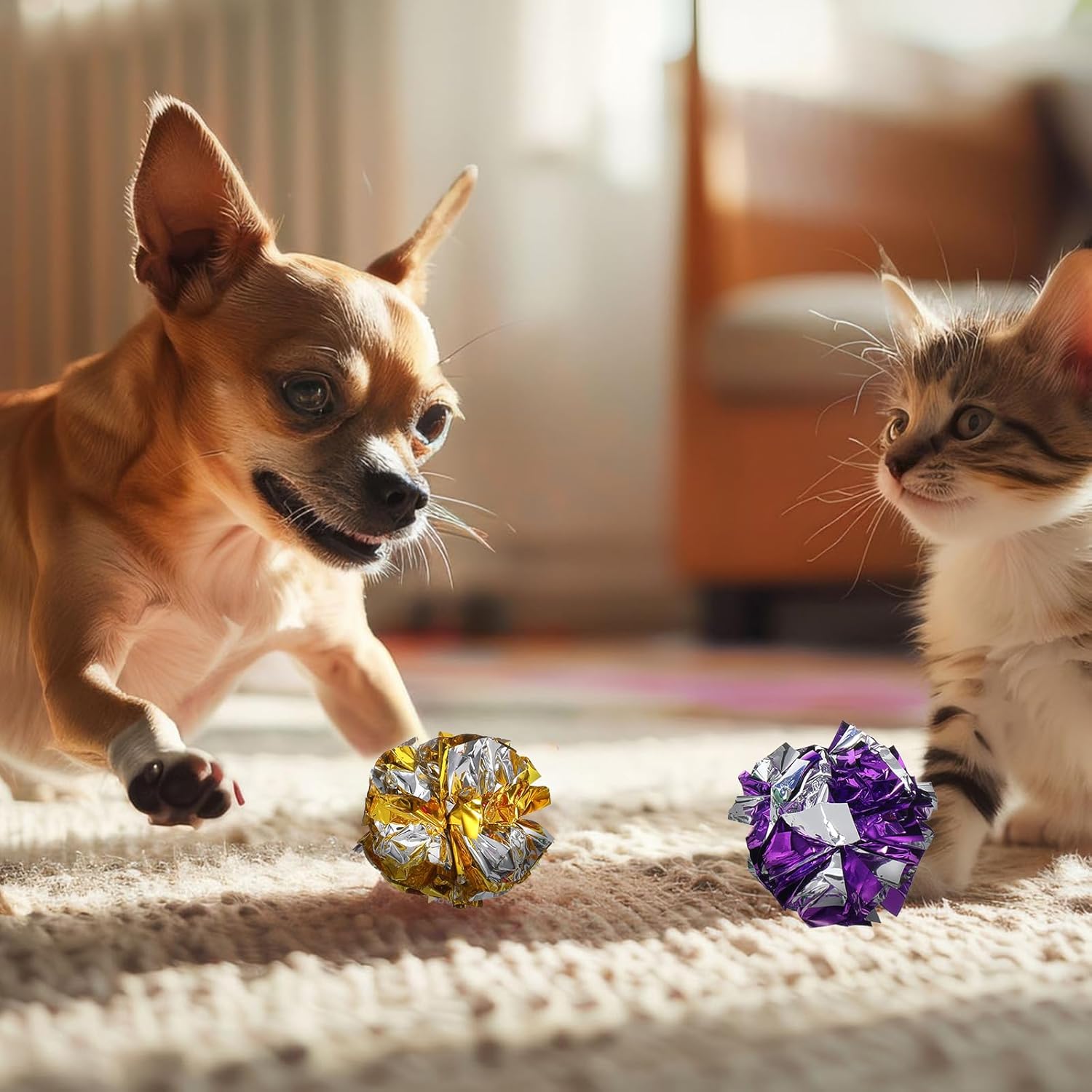 Welcome to our store!Features:150 Pcs Crinkle Balls Cat Toys - Interactive Play for Active CatsEngage your feline friends with this bulk set of 150 vibrant crinkle balls. Each 1.96-inch toy features lightweight polyester film that produces irresistible crackling sounds to trigger cats’ natural hunting instincts. Perfect for chasing, batting, chewing, and solo play, these colorful balls promote exercise and mental stimulation—ideal for keeping indoor cats and kittens active and entertained. The durable material withstands playful bites while assorted bright colors (randomly mixed) maintain curiosity. A great choice for daily interactive sessions, training rewards, or enrichment. Keep your pets engaged and happy with these budget-friendly, motion-activated toys. Specifications:Material: Polyester FilmColor: Random ColorProduct Size: 1.96 InchesPackage Includes:150 Pcs x Polyester Film Crinkle Balls Notes:Manual measurement, please allow slight errors on size.The color may exist a slight difference due to different screen displays.