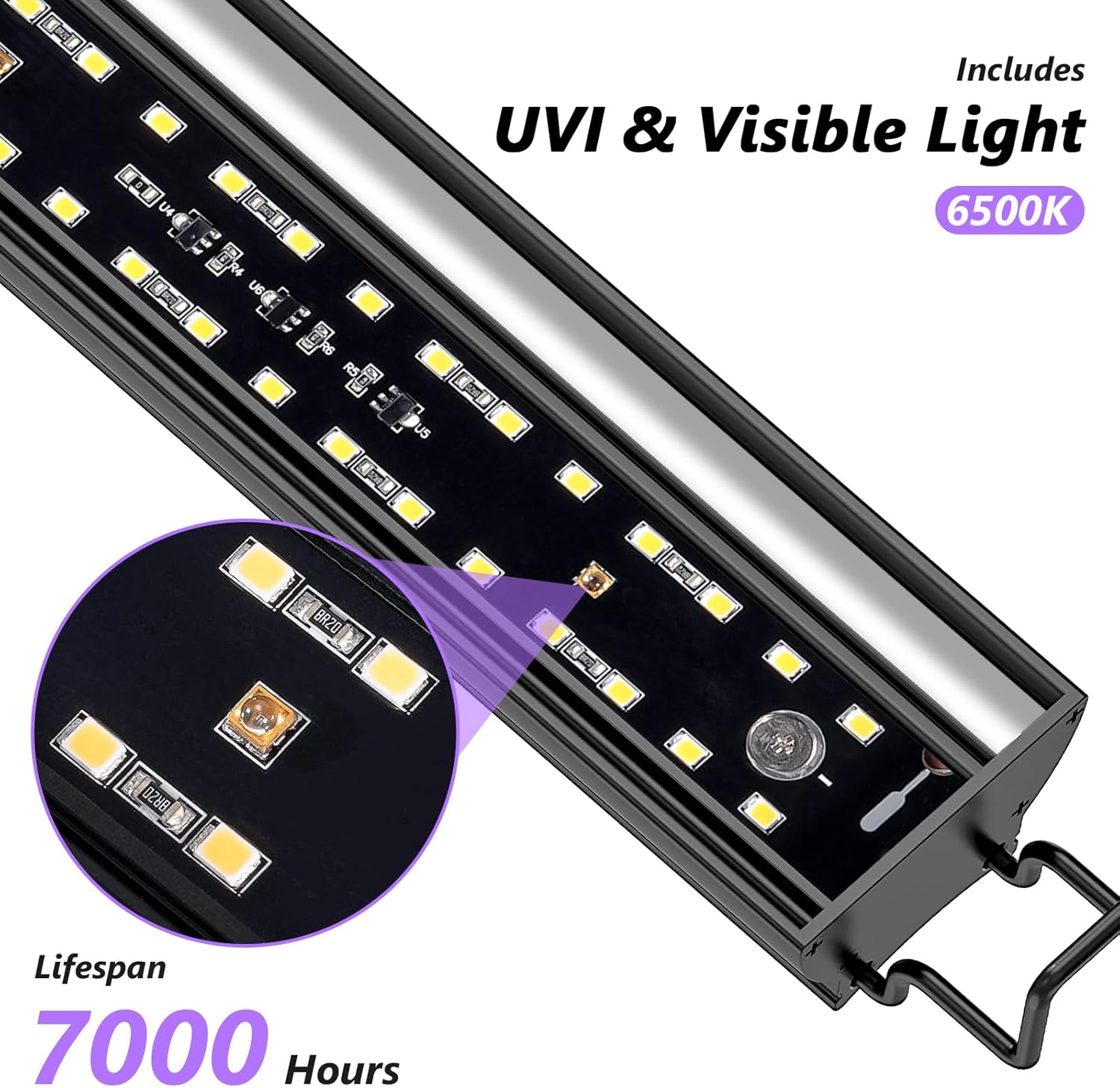 About this item Please use professional equipment to test UVB data, UVB card results are not accurate Reptile-Friendly Lighting: This 14W LED UVB reptile light provides UVB and UVA similar to sunlight, without harmful ultraviolet rays. UVB is essential for reptiles to absorb calcium and prevent bone deformities Energy Efficient: Using high-efficiency LED and UV beads, our lights have low power consumption and high luminous efficiency. Save on electricity bills while providing premium lighting for your pets and protecting the environment, LEDs provide a cool white light of 6500K to keep animals appetizing and energized Multi-Mode Options to Meet Different Needs: The controller offers four light modes (M1/M2/M3/M4) to adapt to various environmental needs, covering Ferguson zones 1-4. The manual mode (M0) allows you to customize the light intensity based on your pet’s specific needs, ensuring the most comfortable lighting environment Efficient and Durable: UVB lamps are made of aluminum alloy material, offering better texture and faster heat dissipation than plastic lamps, ensuring high-efficiency output and a service life of more than 7,000 hours. Your reptiles will always have reliable lighting Versatile Installation: The light can be easily mounted on the tank's mesh, hung inside using the included brackets, or suspended from a wooden board, providing flexible setup options to suit your reptile's enclosure Helpful Reminders: The LED light emits cool white light and does not generate physical heat. If heating is required, it can be used in conjunction with a reptile heating pad or heating lamp Update: The night light brightness can be set to 0. In M1/M2/M3/M4 modes, press and hold both the "+" and "-" buttons simultaneously › See more product details