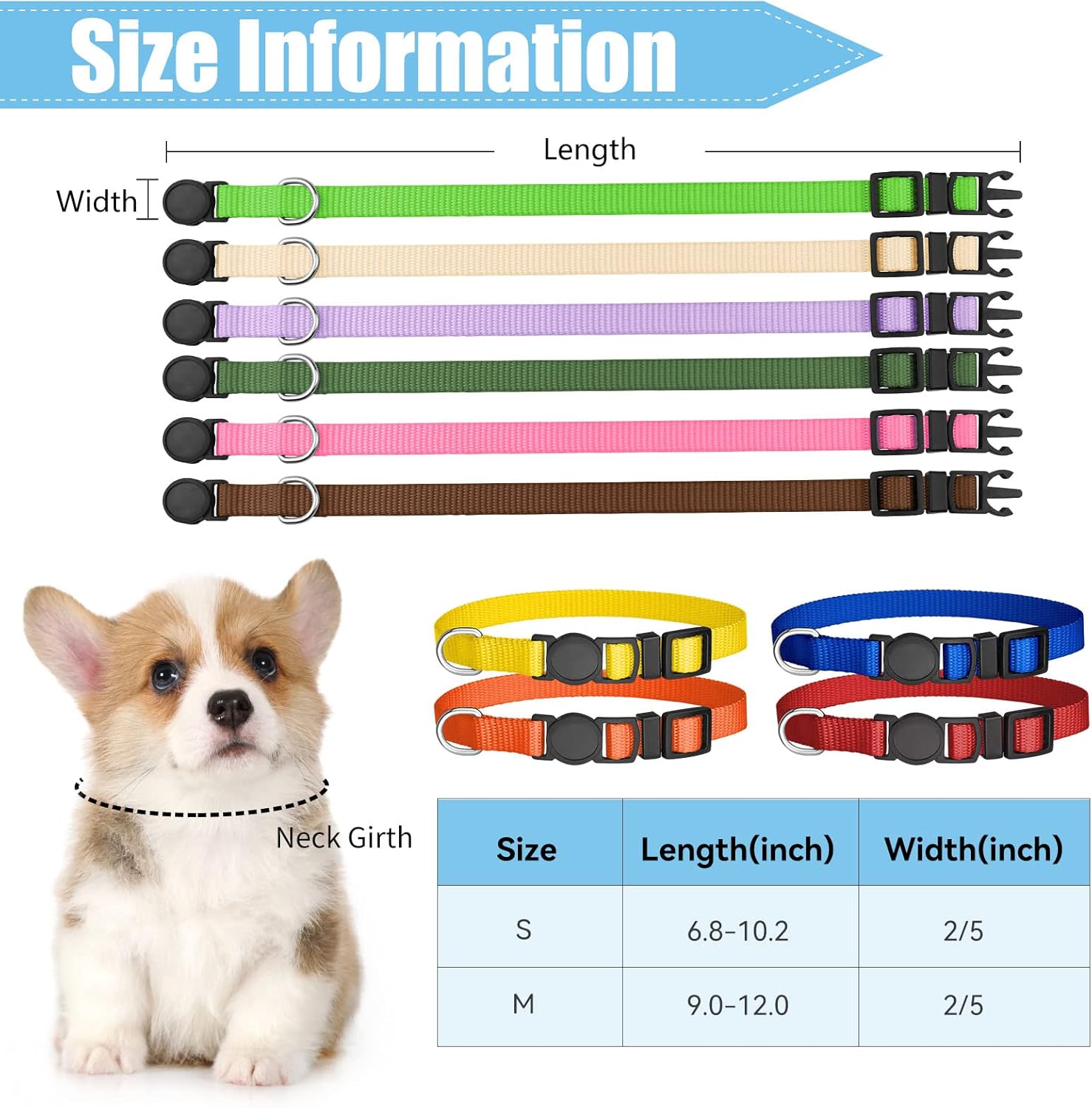 About this item 【VALUE PACK 16 COLLARS】Our puppy collars come with 16 different colors, bright solid colors, They are distinct which makes you easier to identify similar puppies. These will be the most cost-effective puppy collars you have ever bought. 【INCREDIBLE QUALITY】Our puppy collars are made of soft high-quality nylon material, is washable, colorfast and reusable. you never have to worry about them getting torn or being bitten, and doesn’t irritate your pet’s necks. 【SAFETY BUCKLE】BREAK-AWAY CLASP will quick release under pressure if your puppy get stuck up in something. It has just enough resistance in the break away part, not breakaway easily. Your pet's body weight would break it, but it will not come off from just scratching at it. Supervise to prevent swallowing. 【FULLY ADJUSTABLE】Our puppy collars can fit pets whose neck girth is 6.8-10.2 inches. So other small animals whose neck girth is within this size can wear. The metal D ring is great for you to attach a ID tag but not for leash. 【After-Sales Service Excellence】We take pride in delivering unparalleled post-sales support, guaranteeing swift resolutions to any issues or questions related to our puppy collars, to ensure utmost customer satisfaction. › See more product details