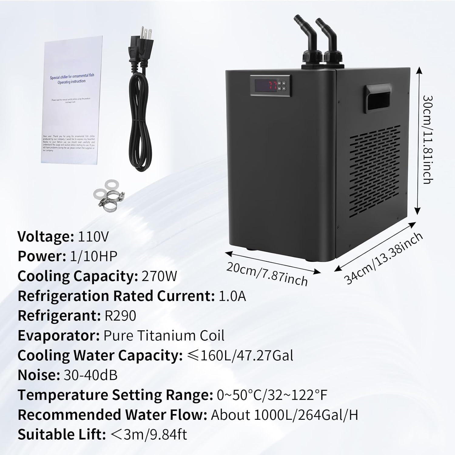 HIGH EFFICIENCY: Powerful 1/10HP, cooling capacity (270W) ensures efficient cooling with less consumption. In addition, 47.27 gallons of cooling water capacity can meet your needs. THOUGHTFUL DESIGN: One-touch switch for quick startup, temperature probe can effectively monitor the water temperature in real time, clear display shows the real-time temperature, and sensitive buttons can conveniently adjust the temperature (32-122℉) to provide a more stable and comfortable living environment for aquatic organisms. GOOD HEAT DISSIPATION: Built-in cooling fan and vents around the housing dissipate heat effectively, ensuring stable product operation and increasing safety in use. EASY TO CARRY AND STORE: The small size of 7.87*13.39*11.81 inches and the recessed side handles make it easy to store and carry around. DURABLE: High-quality metal with baked enamel process and pure titanium vaporizer make this product highly durable, hard and wear-resistant. Smooth surface and simple structure make you can easily clean the stains on this product with soft towel. › See more product details