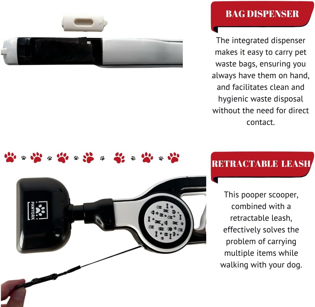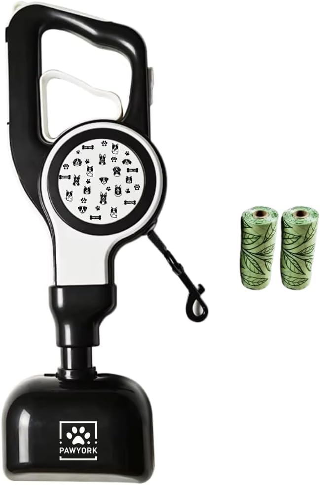MULTIFUNCTIONAL DESIGN: Combines a poop scooper for dogs and retractable leash in one convenient tool for walking and cleaning up after your dog EASY OPERATION: One-handed pickup mechanism allows for swift waste collection while maintaining control of your pet on the leash RETRACTABLE LEASH: Built-in leash system provides freedom of movement for your dog while keeping them under control PRACTICAL FEATURES: Includes waste collection bags storage compartment and quick-release waste disposal mechanism PORTABLE SOLUTION: Lightweight construction makes it easy to carry during walks, perfect for daily use in parks and neighborhoods › See more product details