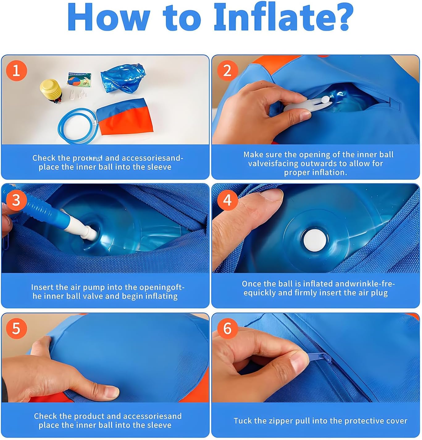- Directions: Put the ball into the ball sleeve from thezipper, with the infation hole facing outward. Insert the infiation tube into the air holeof the ball. Press the pump persistently to inflate untilthe ball is fully expanded inside the outer. After infating the ball, insert the Airlock.When not in use, you can quickly defate andstore by pulling out the Airlock. Let your pet play happily!