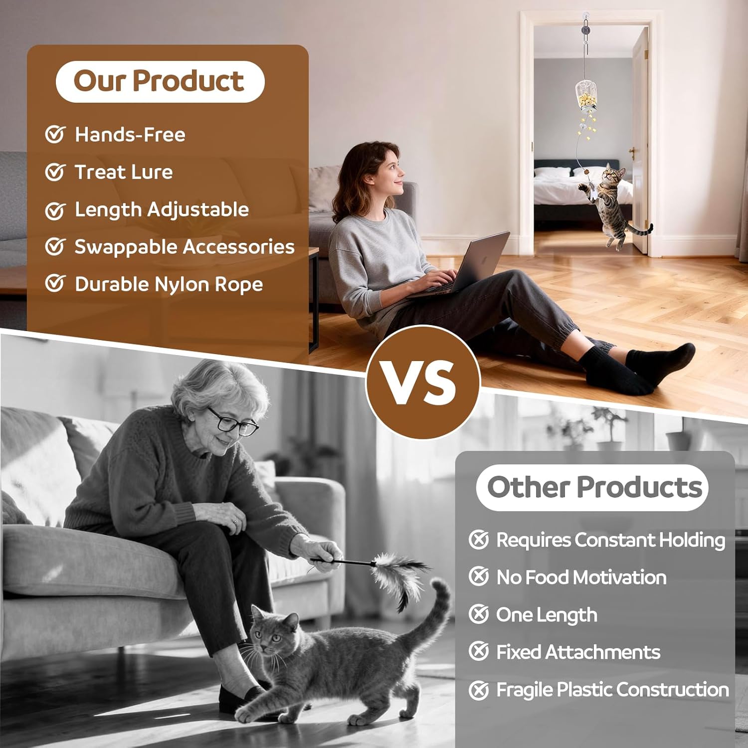 š± 2-in-1 Hanging Cat Toy: Teaser & Feeder! -Trigger your cat's hunting instincts! This interactive cat toy combines a feather teaser with a puzzle feeder. The 360° spinning rope with feather, bell, and silvervineāplus a treat rewardākeeps cats engaged for hours. Enjoy watching them pounce, chase, and play! It's a fantastic boredom buster to reduce anxiety, keeping indoor cats active and entertained. š± Adjustable Difficulty - Challenge Your Cat! -Customize the fun! Lightly fill the clear bottle with dry treats (<0.78 inches). Shorten the rope or move the knot closer to the treat opening to increase difficulty. Teach them easily: tug the rope to drop a treatāthey'll be a pro in no time! š± Endless Fun with 6 Attachments! -Includes a feather teaser, 2 wiggly caterpillar toys, AND 4 bouncing springs! Easily swap them to create a ānewā toy, re-sparking their curiosity. The unpredictable spring cat toy keep them thrilled with joy! (Ideal for single or multi-cat homes). š± Smart Play = Happy Cat, Happy You! -Designed for supervised play with your pet. (Not for children. Always replace worn-out parts for safety.) When youāre away, shorten the rope and offer the cat spring toys instead. They'll love chasing the random bouncing movements, burning off extra energy, and helping you both sleep better. It's a win-win! š± Mental Stimulation & Healthy Fun -This 2-in-1 amazing design uses treat motivation to get your cats excited and do more exercise, encouraging lounging cats to get up, jump, and play hard for snacksāpromoting healthy weight management. It's great for celebrating holidays! Think Christmas surprises, birthday joys, or spontaneous "I love you" moments. Surprise your fur baby! āŗ See more product details