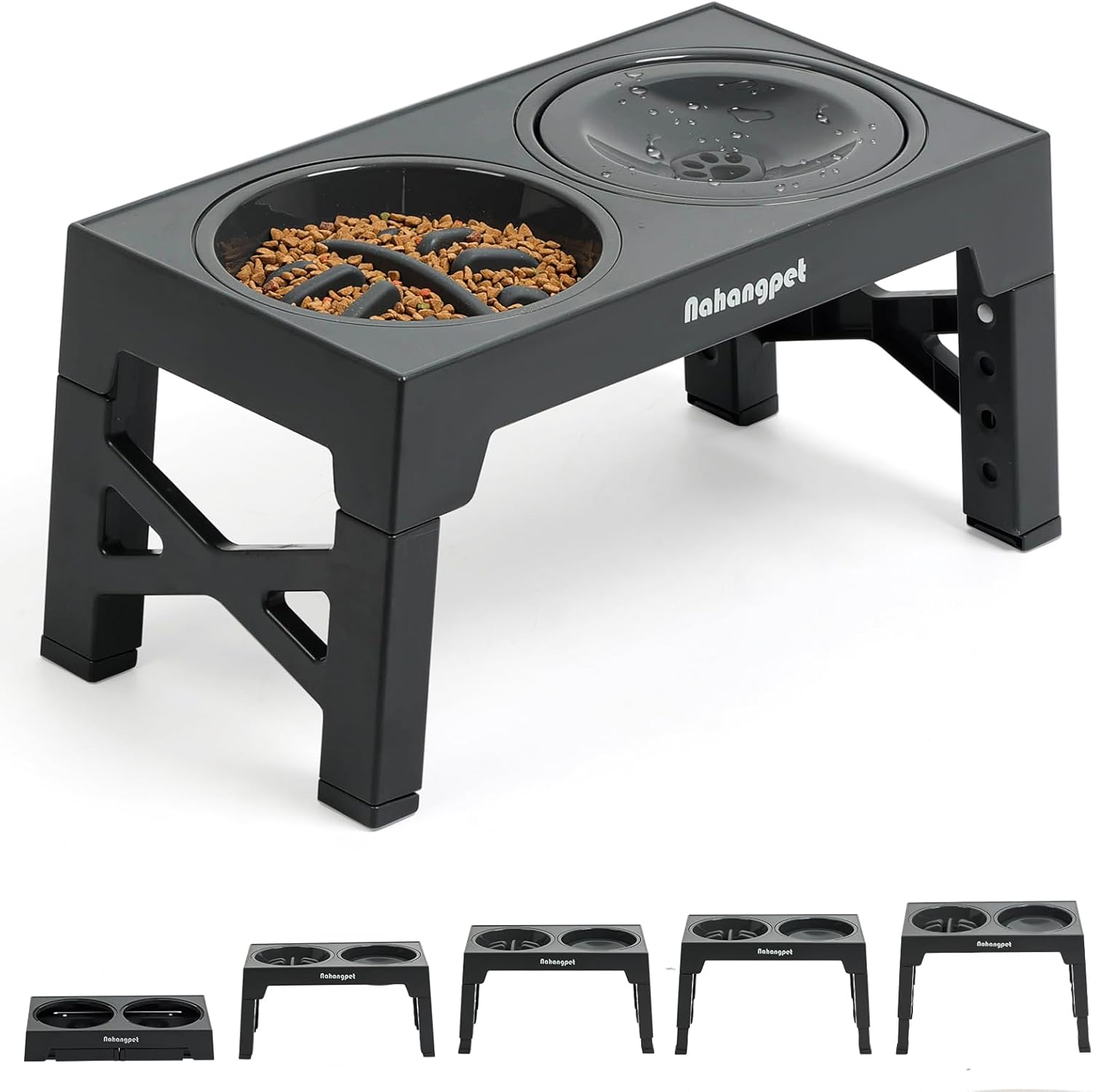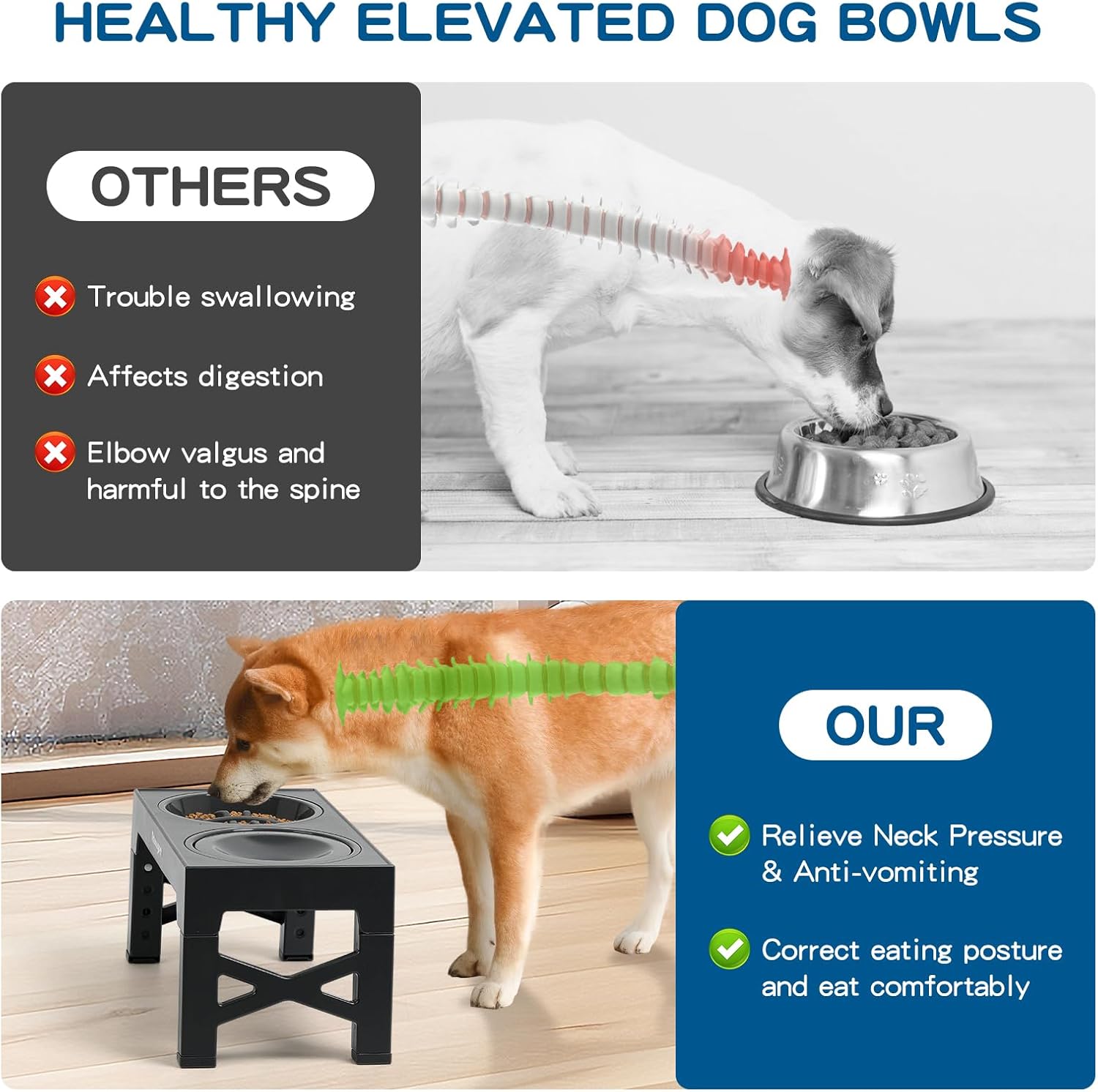 About this item 5 Adjustable Height Dog Bowl Stand for Dogs of All Sizes: No need to bend down anymore. Our elevated dog bowls are designed to accommodate dogs of all sizes and stages of life. With 5 different height options, you can easily adjust the bowl stand to suit your puppy or senior dog’s needs. Choose from heights of 3.43-inch, 8.17-inch, 9.69-inch, 11.27-inch and 14.30-inch. Protect Your Dog's Neck and Joint: Our raised dog bowl helps alleviate strain on your pet’s neck, joints, and spine. By providing a comfortable height for access to food and water, it promotes a healthy eating posture and reduces the risk of discomfort or pain. Slow Eating and Drinking: Our slow feeder dog bowl is specially designed to slow down your pet’s eating speed, improving digestion and reducing the risk of obesity. By prolonging the feeding time, the bowl helps your dog better absorb nutrients and prevents gulping or overeating.Featuring a unique floating disk, our no spill water bowl slows down your pet’s drinking speed. This prevents choking and splashing, ensuring your pet stays hydrated while keeping their fur dry and clean. No assembly required & Folds Up Nice for Traveling: Our dog bowl with stand is designed with convenience in mind. The detachable design and foldable legs make it incredibly easy to pack and save space, whether you’re at home or on the go. No assembly required, simply unfold the legs and press down to use. 1 Year Warranty: We are always committed to providing the best shopping experience, including your satisfaction with the items you purchase. So we have put in place a one-year return and exchange guarantee. › See more product details