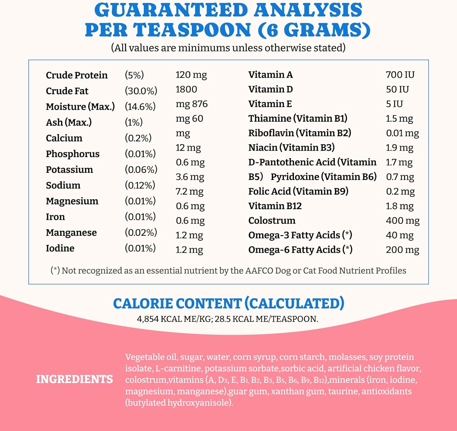 About this item 2-in-1 Nutritional Gel: Our nutritional gel is fortified with colostrum, a natural source of immunoglobulins, growth factors and essential nutrients. These high-calorie ingredients work together to help cats and dogs regain energy, support recovery after surgery, and better cope with environmental stressors High-Calorie Energy Boost: This high-calorie gel is packed with calorie-dense nutrients to provide your dog with the extra energy they need. Ideal for senior cats, senior dogs, or pets needing weight gain support, this helps maintain energy levels and supports recovery from illness or fatigue Easy to Accept for Senior Pets: Formulated with high-quality ingredients and a naturally appealing flavor, our colostrum nutritional gel helps encourage appetite β especially in older pets who may eat less with age Ideal for All Pets: Suitable for dogs and cats of all ages, breeds, and sizes, this gel provides essential nutrients for overall health. Whether your pet is a puppy or kitten or a large dog, this supplement supports their vitality and well-being Special Care Tips: Our gel contains a higher level of colostrum protein. If unsure about your petβs tolerance, start with 1/3 of the suggested amount, monitor closely, and gradually increase to 2/3, then to the full amount if well tolerated. Not recommended for pets diagnosed with diabetes. Please consult your veterinarian if your pet has a medical condition. Trusted Ingredients: Crafted with only the high-quality, natural ingredients, our gel is free from artificial additives, fillers. Every batch is carefully formulated to ensure purity, giving you peace of mind that your pet is receiving a premium, trustworthy supplement. βΊ See more product details