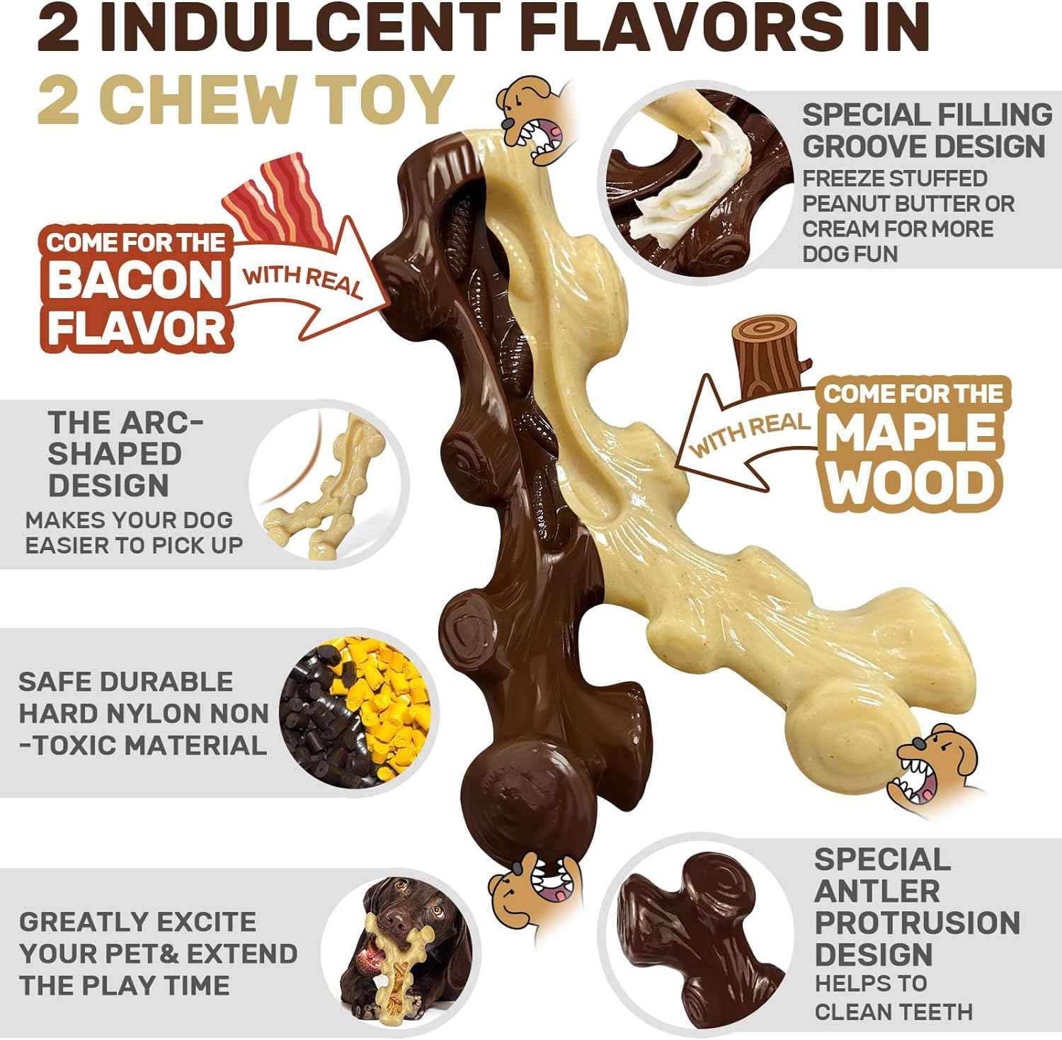 Long-lasting,This sturdy chewing toy is designed to promote the health of dogs' teeth and gums,Reduce bad breath. not only satisfies a dog's innate chewing instincts but also prevents them from causing damage to your furniture,shoes,or fingers. Specially designed for aggressive chewers,Suitable for medium to large dogs with intense chewing.Treat your dog to the enduring,entertaining play time they deserve with this robust and reliable nylon chew toy.Please note: Old dogs,and dogs with sensitive teeth should not use nylon toys Truly tempting taste-this dog toy has a unique smoking process,infused with 100% authentic taste;brown toys exude the aroma of crispy bacon,while beige toys have an elegant woody scent. Trust us,these enticing scents will tempt your dog to chew.Charming and chewy,your furry companion will never be able to resist.Not only does it reduce anxiety and prevent destructive chewing,but it also teaches your precious dog healthy chewing habits-perfect for training,teething,weight control and much more Innovative chew toy design for avid chewers! boasts an easy to grasp design,ideal for dogs who tend to chew through everything.If your puppy relentlessly destroys every "indestructible"toy you buy or not interested in other toys,Then this chew toy is worth a try,Unique tree fork design both eye-catching and entertaining,satisfy the dog's chewing desire.Your dog will enjoy hours of safe and engaging chewing entertainment.Please note: This toy is made of sturdy nylon,which is a hard material rather than soft rubber Easy to pick up and chew-The unique branch design is our original creation,uniquely designed for a paw-friendly grip so your pup can quickly grab them and get a good chew going.Think about it:Dogs don't have thumbs.excellent choice for dog gift whether you are looking to celebrate a birthday or christmas with your furry friend.The 7.4 inch dog chew toy is ideal for medium and large dogs.It is also suitable for the growth stage of dogs,ensuring that your furry friends are happy and healthy.Please refer to the toy size to determine if your dog's body type is suitable for this toy Safety is our top priority when it comes to beloved pets.Our nylon stick chew toy features robust heavy-duty design,Our dog chews have undergone rigorous testing to ensure the safety of their materials and structure,Will not break in half during use.It's been extensively tested on a variety of varieties,including powerful chewers such as pitbulls,golden-doodles,german shepherds,rottweilers,malinois,labradors,poodles,many more.suitable for dog chewing.for safety reasons,and dogs should always be supervised by their owners while chewing Happiness guaranteed-We recommend regular checking and supervision during the use of dog chew toys.We highly value the customer experience and welcome your suggestions for our indestructible dog toy.If you have any issues with the aggressive dog chew toys,please reach out to us directly and we will provide you with after-sales service within 24 hours.Our primary goal is to ensure the happiness of you and your furry friends.Please check the Product guides and documents on this page before you purchase › See more product details