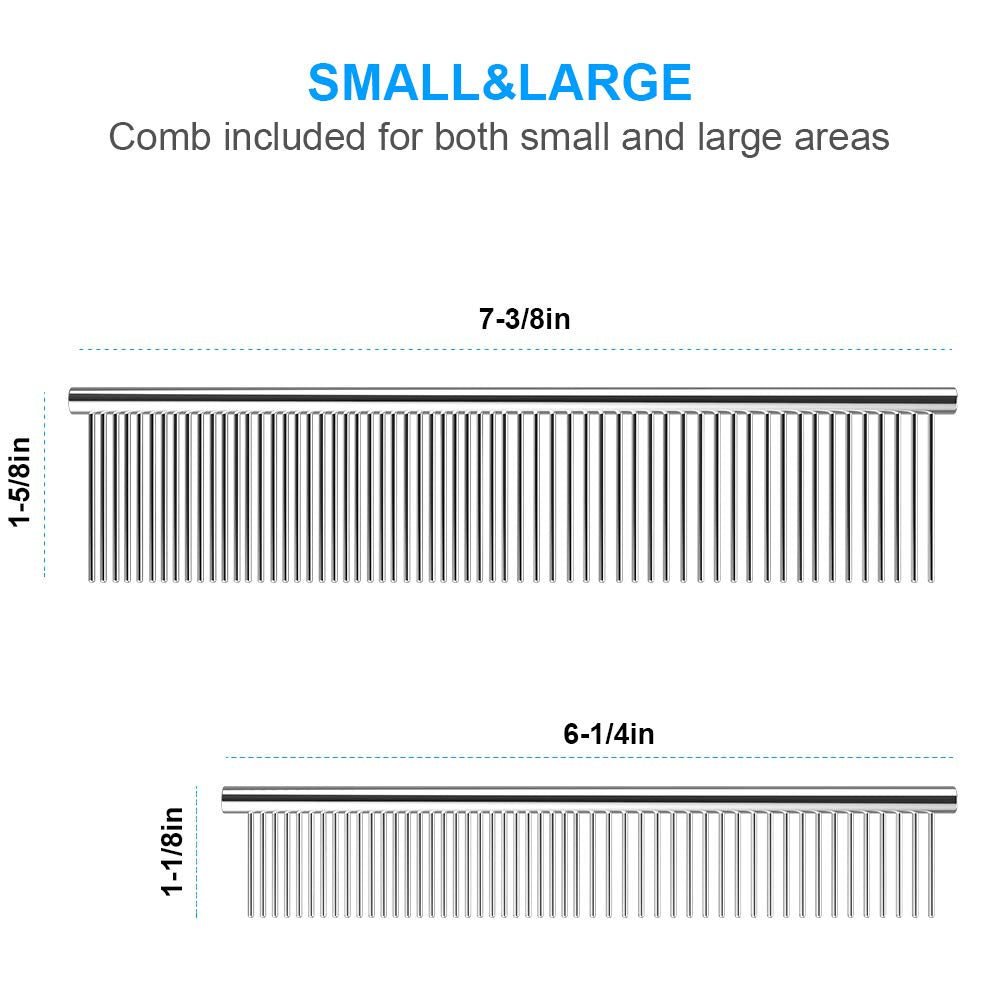 About this item ✅ FUNCTION -This dematting tool for dogs can removes tangles, mats, loose hair, besides, it’s perfect to promote blood circulation and massage skin. ✅ PREMIUM MATERIAL - Made of high quality stainless steel, this comb is durable, corrosion resistant and will not fade, good for avoiding static electricity. ✅ COMFORTABLE & SAFE - Rounded pin ends are gentle to the skin. This comb grooms and massages for a healthy coat, prevent snagging and pet injury. ✅ WHAT YOU GET- 2 Pack combs for removes both small & large areas tangles, knots. Large comb size: 7.4 x 1.65 IN, small comb size: 6.3 x 1.2 IN. ✅ RISK-FREE LIFETIME GUARANTEE - We firmly stand by the lasting quality of our pet grooming tool. If for any reason you're not 100% happy with it, reach out to us to receive a refund or replacement. › See more product details