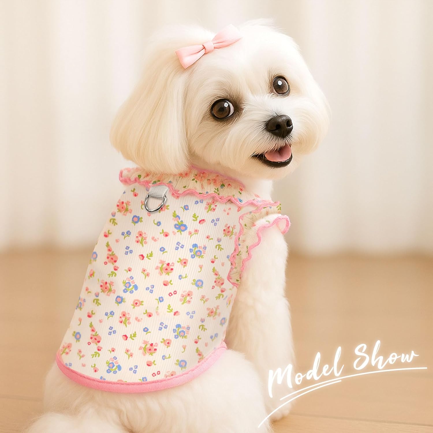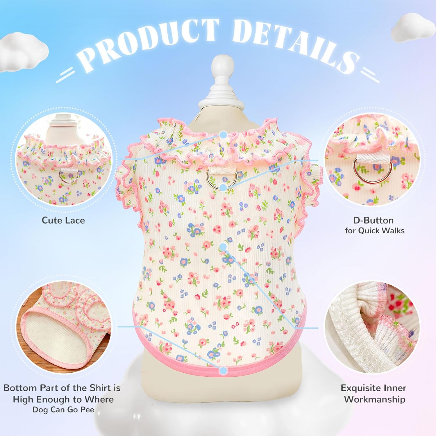 About this item Floral Design & Breathable Comfort : Lightweight, stretch-knit fabric with vibrant floral prints keeps pets stylish and cool in summer. Enhanced airflow prevents overheating, making it ideal as dog summer clothes or a lightweight alternative to cooling vest for dogs Sweet Ruffled Neckline & Sleeves : Delicate ruffles along the neck and sleeves add a cute, girly touch – perfect for dog outfits for small dogs girl and puppy clothes girl. The refined lace-like trim elevates any pet's style without sacrificing comfort Toilet-Friendly Design &D Ring Design: bottom part of the shirt is high enough to where he can go pee while wearing the shirt, keeping the tee clean and dry. The D Ring makes it more convenient for going out for a walk Ultra-Stretchy & Non-Restrictive Fit : stretch fabric adapts to your pet's movements, providing maximum freedom for running and play. Fits small dogs, kittens (like sphynx cat clothes), and puppies (XXS-L) Size-Inclusive & Easy Care : Available in XS, S, M, L for small dog and cats clothes. Machine-washable fabric retains softness and elasticity after multiple washes – a durable staple for dog clothing year-round › See more product details