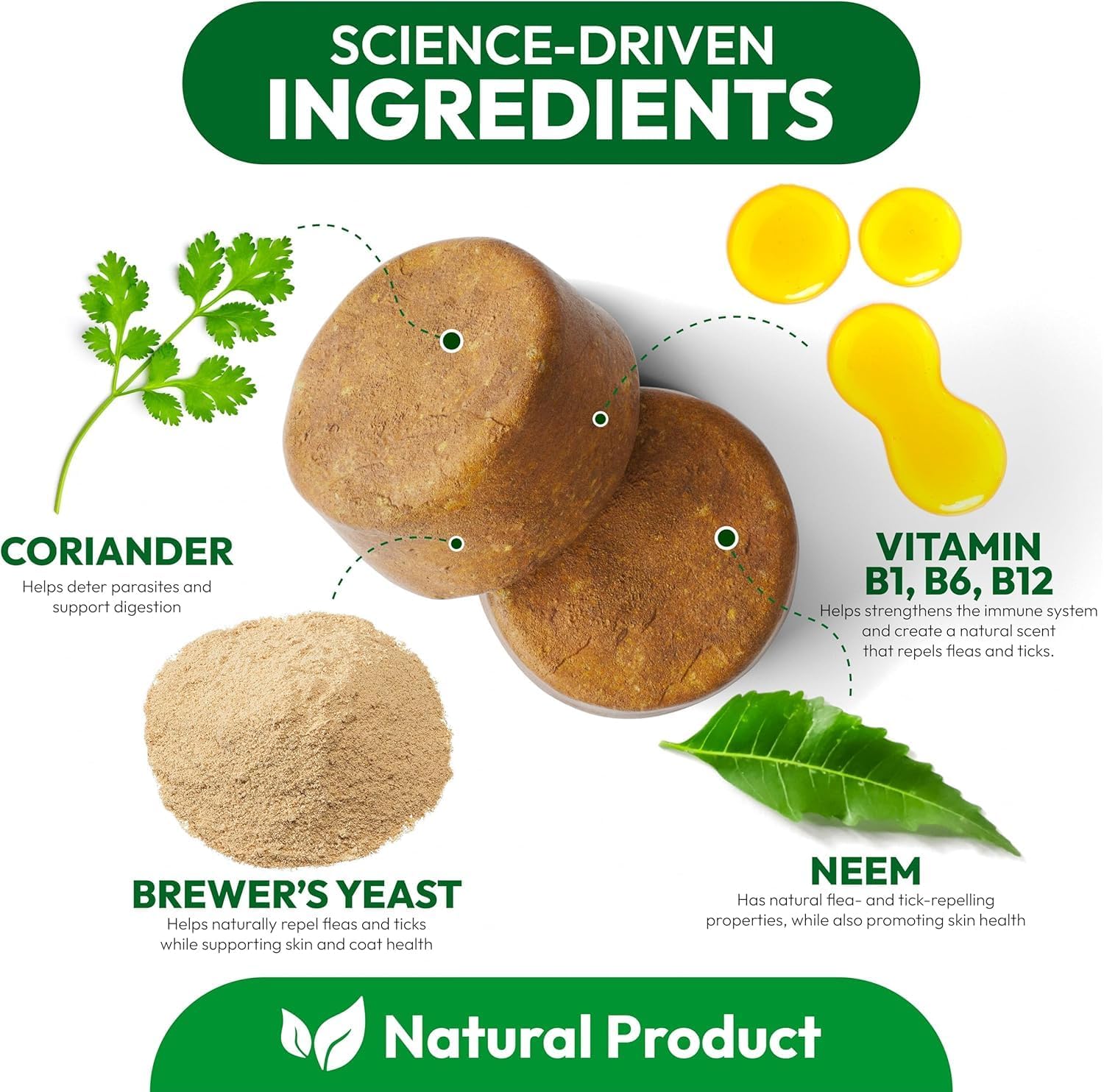 Effective Flea & Tick Protection: These flea pills for dogs provide lasting defense against pests, protecting your dog from infestations and discomfort while keeping them healthy and itch-free. Easy & Tasty Chewable Formula: Our dog flea and tick treatment chewable is a hassle-free alternative to sprays and collars, providing essential protection in a delicious chew dogs love. Natural & Safe Ingredients: Manufactured with carefully selected natural ingredients, our flea and tick prevention for dogs chewable helps protect your dog's health without harsh chemicals. Vet-Recommended for All Breeds & Sizes: This dog tick and flea treatment provides reliable protection for small, medium, and large dogs, ensuring year-round defense for all breeds, sizes, and ages. Made in the USA in an FDA-Registered Facility: Our best flea and tick chews for dogs are made under strict quality control standards to ensure safety, purity, effectiveness for dependable protection. › See more product details