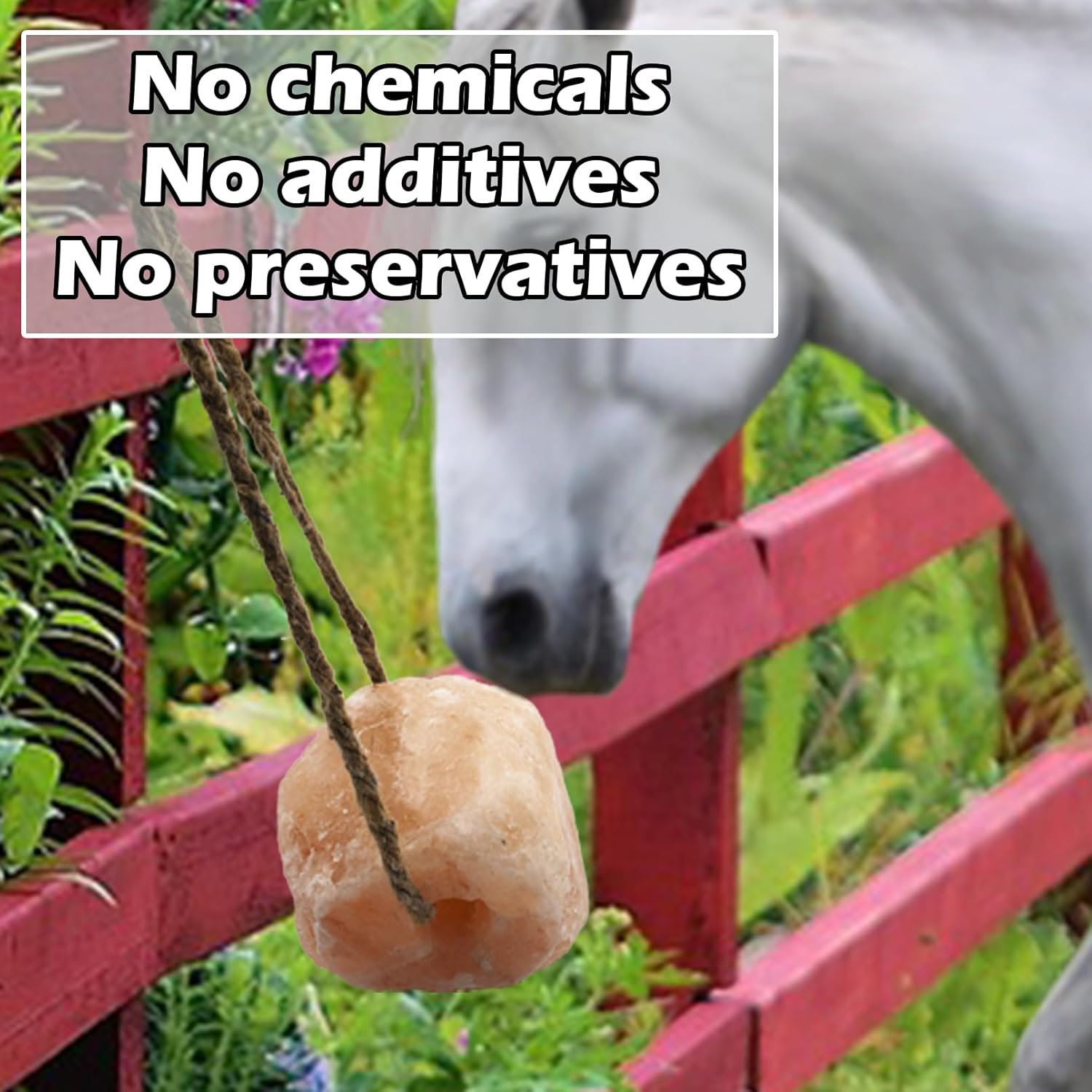 About this item Rich mineral Elements:Natural himalayan salt Lick contains up to 84 minerals, including phosphorus, sodium, calcium, iron, zinc, etc, and does not contain preservatives or additives. It provides a natural source of essential minerals and supplements trace elements for the health of horses, deer, goats, cattle, livestock, cats and dogs Keep Animals Healthy:Himalayan salt lick contains 98% sodium chloride and 84 kinds of trace minerals, without additives. Compared with ordinary salt, horses prefer the taste of Himalayan salt to provide nutrition supplement, promote strong bones, healthy digestion, improve hydration, stimulate them to drink more water and maintain water Adjustable Rope:Salt rope is characterized by a sturdy long rope that can be adjusted to the appropriate height according to the size of the animal, providing the best positioning as a natural mineral. Our salt licking lasts for a long time, ensuring a reliable and long-lasting salt licking experience Multi Functional Salt Lick:Salt licking provides hours of entertainment for horses, deer, goats, cows, and all other livestock, relieving boredom and satisfying your animals. A salt lick may be between 2.4 and 3.3 pounds in size Pure Natural:Mineral salt licking is made of 100% pure natural Himalayan salt. Hand mining in the the Himalayas of Pakistan, and natural handcrafting make each one unique. Each size, detail, and color will vary. Ensure the health and quality of your animals › See more product details