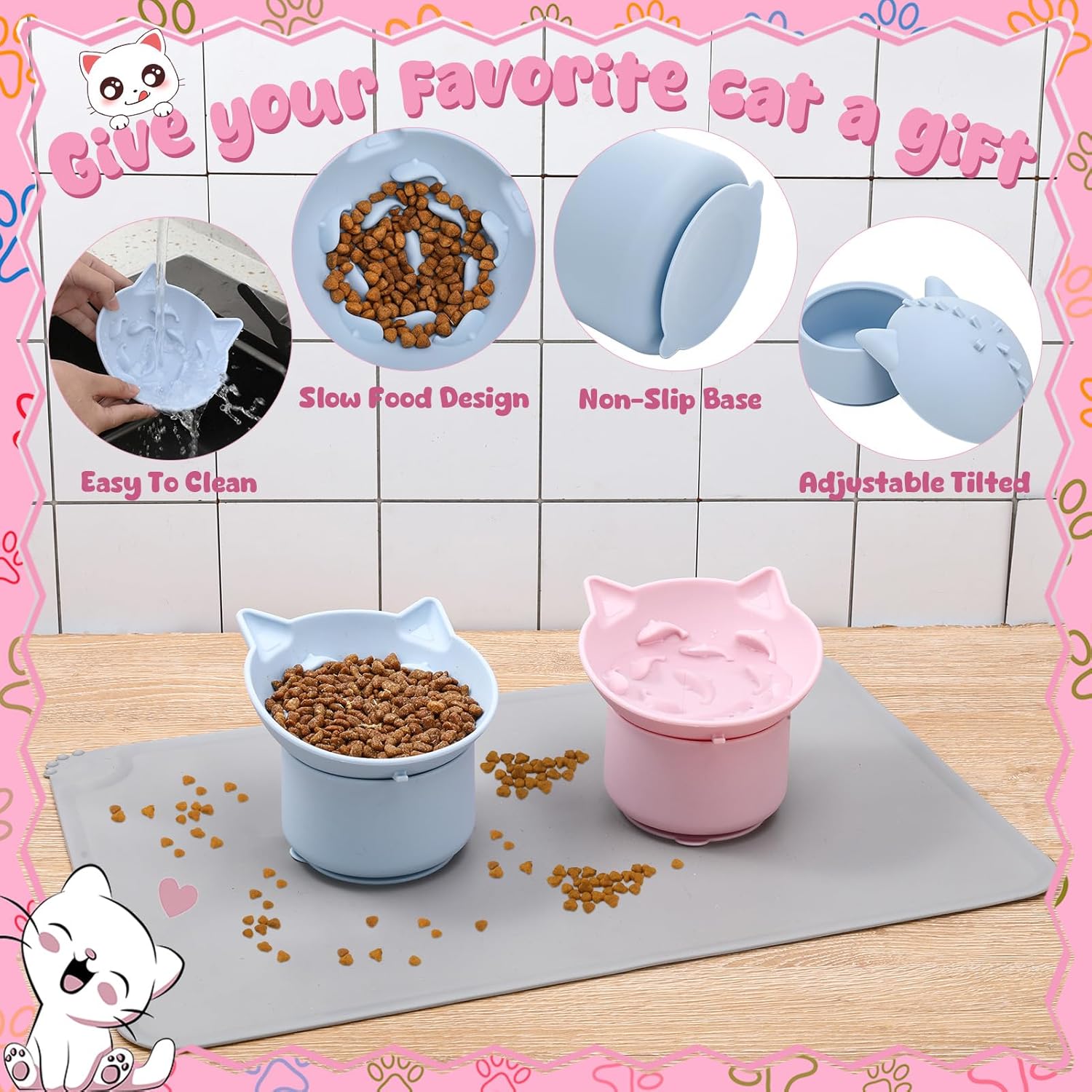 About this item Dual Elevated Slow Feeder Bowls for Healthy Cat Eating: Two raised slow cat feeder (pink and blue) with slow feeder design to prevent vomiting silicone material for daily use dishwasher for convenient cleaning Non Slip Silicone Pet Mat for Mess Free Feeding: Large 48x30cm waterproof pet dining mat in light gray Provides stable grip to prevent spills Easy-wipe surface for quick maintenance Ideal for food and water bowl placement Adjustable Raised Feeding Angle for Digestion Support: Two part elevated cat bowl design with removable slow feeder top Customizable tilt angle (15°/30°) to reduce neck strain Yoga style base ensures stability Suction Base for Slip Proof Mealtime: Built in strong silicone suction pads keep cat food bowl slow feeder fixed in place Prevents tipping and sliding even with active cats pet silicone material that’s chew-resistant Perfect Gift for Cat Owners, Easy Storage Portability: Compact 22.5x15x15cm packaging fits most cabinets Great for home or travel use Stylish pink and blue colors enhance any kitchen decor Includes food mat for complete feeding solution › See more product details
