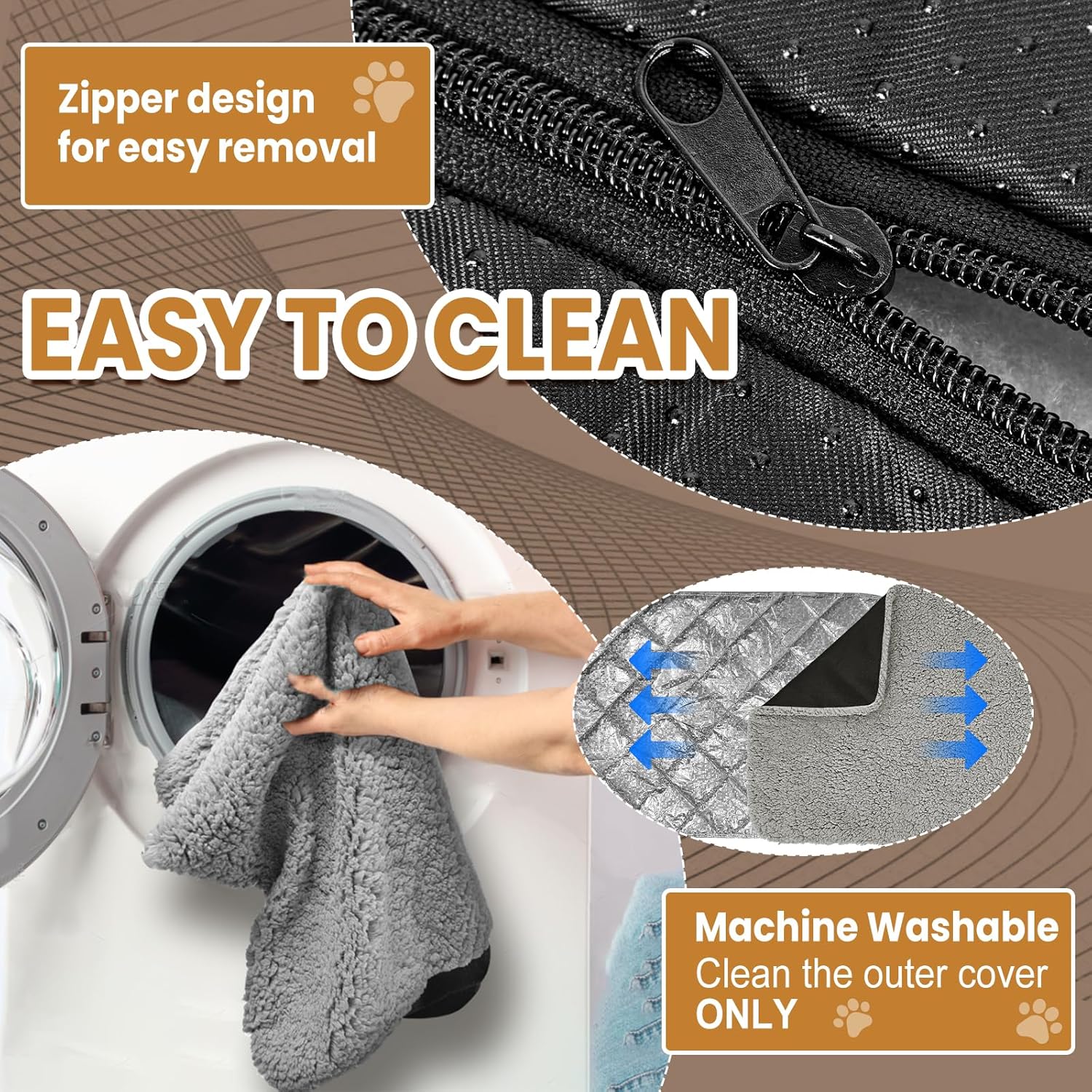 About this item Cozy Heat, No Electricity Needed – This innovative self-heating dog mat captures and radiates your pet’s own body warmth, creating a naturally snug environment without the need for plugs or batteries. The heat-reflective layer delivers gentle, steady warmth while eliminating any electrical hazards. Ideal for use in crates, on cold floors, or when traveling during chilly seasons. Quiet Heat-Reflective Layer & Anti-Slip Base – Designed with a noise-free thermal reflective layer that captures and radiates your pet’s body warmth without crinkling sounds, allowing for peaceful, uninterrupted rest. The upgraded non-slip backing keeps the mat securely in place on any surface, preventing sliding and bunching. Durable stitching and sturdy, wear-resistant fabric provide reliable performance for everyday use in crates or at home. Plush Warmth & Lasting Support – Designed with a premium sherpa fleece top and thick, high-density cushioning, this dog mat delivers exceptional softness and durable comfort. The fluffy surface soothes tired joints and muscles, helping medium to large dogs rest deeply. Its resilient filling keeps the bed lofty and inviting, maintaining shape and warmth even after repeated use or washing. Easy to Clean & Maintain – Designed for convenience, this dog mat comes with a detachable cover that’s both machine washable and dryer-friendly. The durable outer fabric keeps its shape and freshness after every wash, while the internal self-heating layer stays safely enclosed. Cleaning takes just minutes—remove the cover, wash, dry, and reattach—so your pet always has a warm, comfortable, and hygienic place to relax. 2-Pack Versatile Warmth Solution – Includes two 36"×24" large self-heating dog mats, perfect for use in multiple spaces—place one in the crate, another on the couch, bed, or in the car. Designed for medium to large dogs up to 65 lbs, this dual set provides cozy warmth and flexibility for homes with more than one pet, ensuring comfort wherever your dog loves to lounge or nap. › See more product details