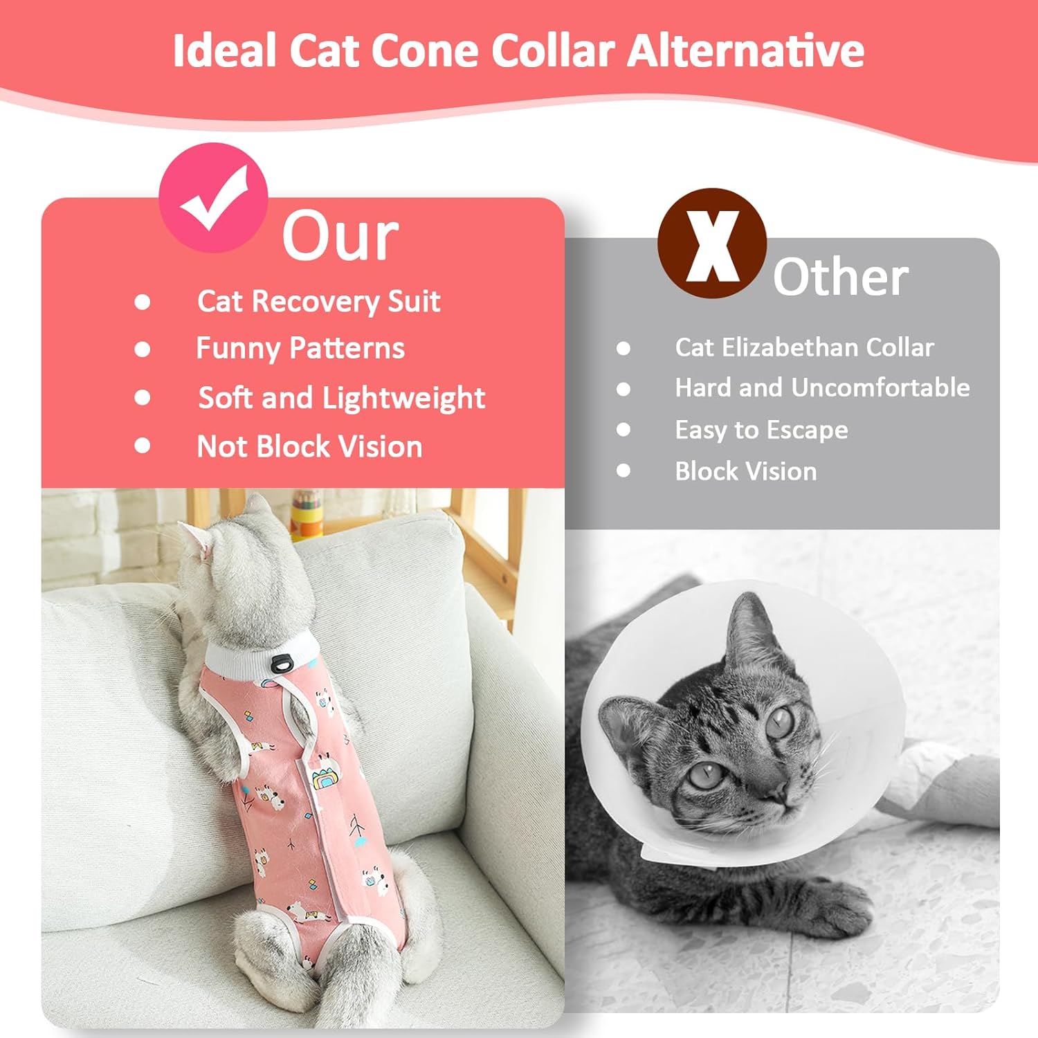 About this item 2 PCS Cat Recovery Suit for Spay: You want your cat to recover quickly, so find the ideal cat surgical recovery suit for your lovely cat. Our cat surgery suit stops your cat from licking its wounds and provide protection after surgery. 2 pcs cat body suit post surgery is the perfect choice for most pet owners Easy to Put on & Adjust: Thanks to the adjustable neck elastic band, you can adjust it to the right position based on your cat's neck girth. Back straps allow the recovery suit for cats to fit nicely to your cat’s body, reducing the risk of cats escaping. Your cat can eat, sleep and take walks normally Premium Breathable Material: Our cat onesie for cats are made from soft materials, comfortable and breathable for all pets. Cat surgical recovery suit female with funny patterns ensures your cat is stylish and cute while recovering Solve Many Cat Problems: Every pet owner needs cat recovery suits. Kitten recovery suit reduce anxiety during recovery and weaning period, helping your cat heal faster. cat surgical suit is an ideal solution for skin issues, abdominal wounds, weaning, and shaving. Kitten onesie for cats is the perfect gift for your cat during its recovery period Reusable & Easy to Clean: Soft cat recovery suit after surgery is machine or hand-washable. Reusable 2-piece kitten recovery suit female is perfect for multi-pet cat owners. With our cat body suit, your cat will no longer be ashamed and all anxiety will vanish › See more product details
