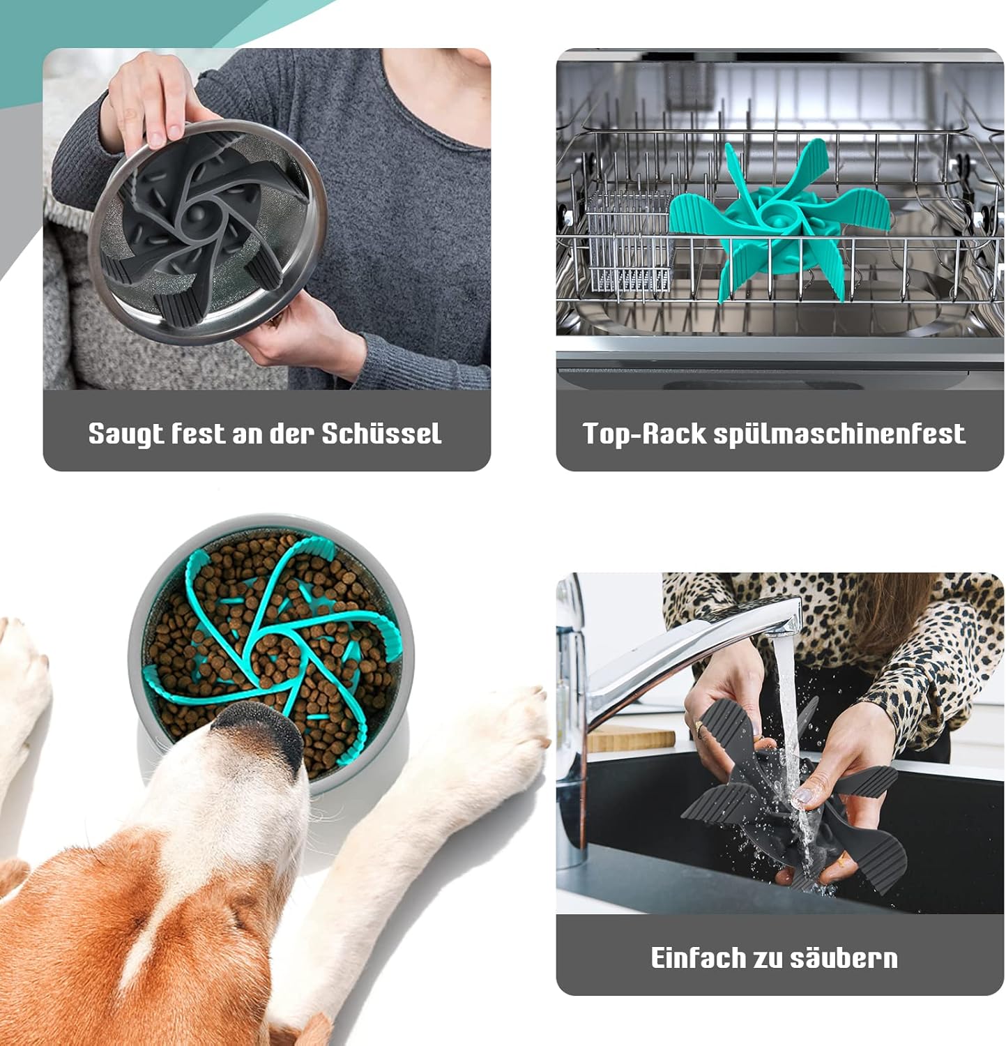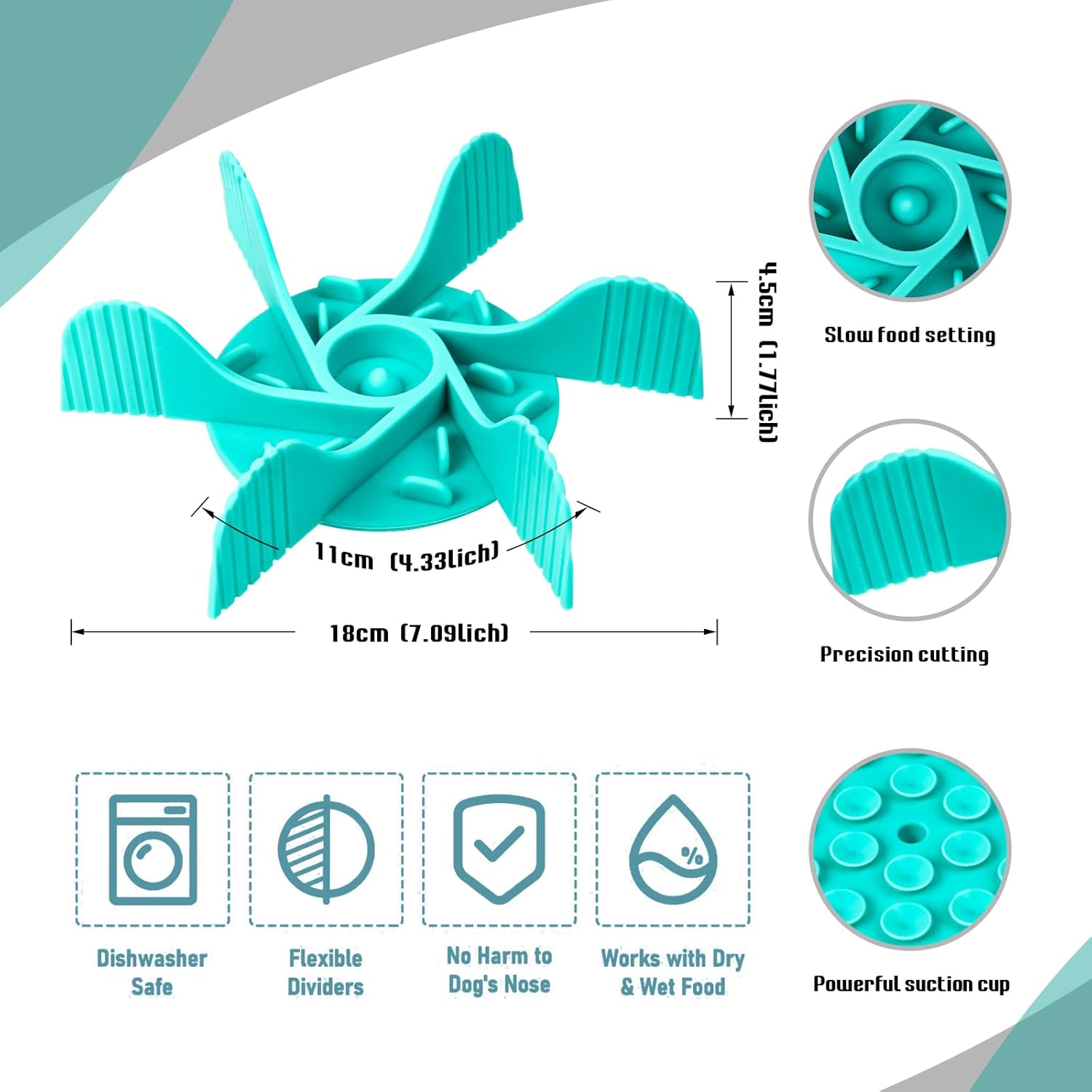 About this item Slow feeder insert - protect your pets' health: Does your dog gulp down food, then promptly get sick – choking, gagging, even vomiting? Just use this slow feeder insert to the bottom of the dog bowl, its unique design allows dogs to effectively slow down their eating which in turn can help aid in proper digestion, choking, and overeating. It is flexible and easy to secure to most dog food bowls, this slow feeder obveriously can feet all your daily dog feeding needs Safe is necessary: Made of a food safe silicone material that is BPA, PVC, and phthalate free, our durable slow feeder dog bowl insert has 5 flexible silicone dividers with 4mm thick. It is soft enough for safety that can avoid scratching the dog mouth, noise and tougue. Suitable for wet dog food, dry dog food, and dog treats. We suggest that when the food has been eaten, remove and store dog bowl to slow down eating elsewhere to avoid chewing One insert meet all your needs: This dog bowl slow feeder insert can easily fit into most sized dog bowls, but the ideal sized dog dishes is 4.5" - 7" in diameter, you can trim it along clearly marked cut lines to custom fit the smaller bowls. Please Note this is not a chew toy and should not be left in dog bowls especially with aggressive chewers. Please always supervise your pet while in use Convenient and easy to clean: Simple but effective construction of our slow feeder dog bowls allows you to easily remove food residue whether by hand washing or machine washing. Besides, with its powerful suction cups, our premium Slow Dog Feeder Insert adheres to any bowl – metal, ceramic, or plastic, without coming loose or sliding around, you don't worry about your dog will pull the dog slow feeder out of the bowl For a better exprience: 1) Clean dog food dish or food bowl; 2) Rinse the inside of the suction cup on the slow feeder dog bowl insert under warm water and shake off all excess water; 3) Press the suction cup firmly in place on the base of your clean dog dish, making sure there are no air bubbles. A good dog bowl slow feeder insert is safe for your dog, convenient for you › See more product details