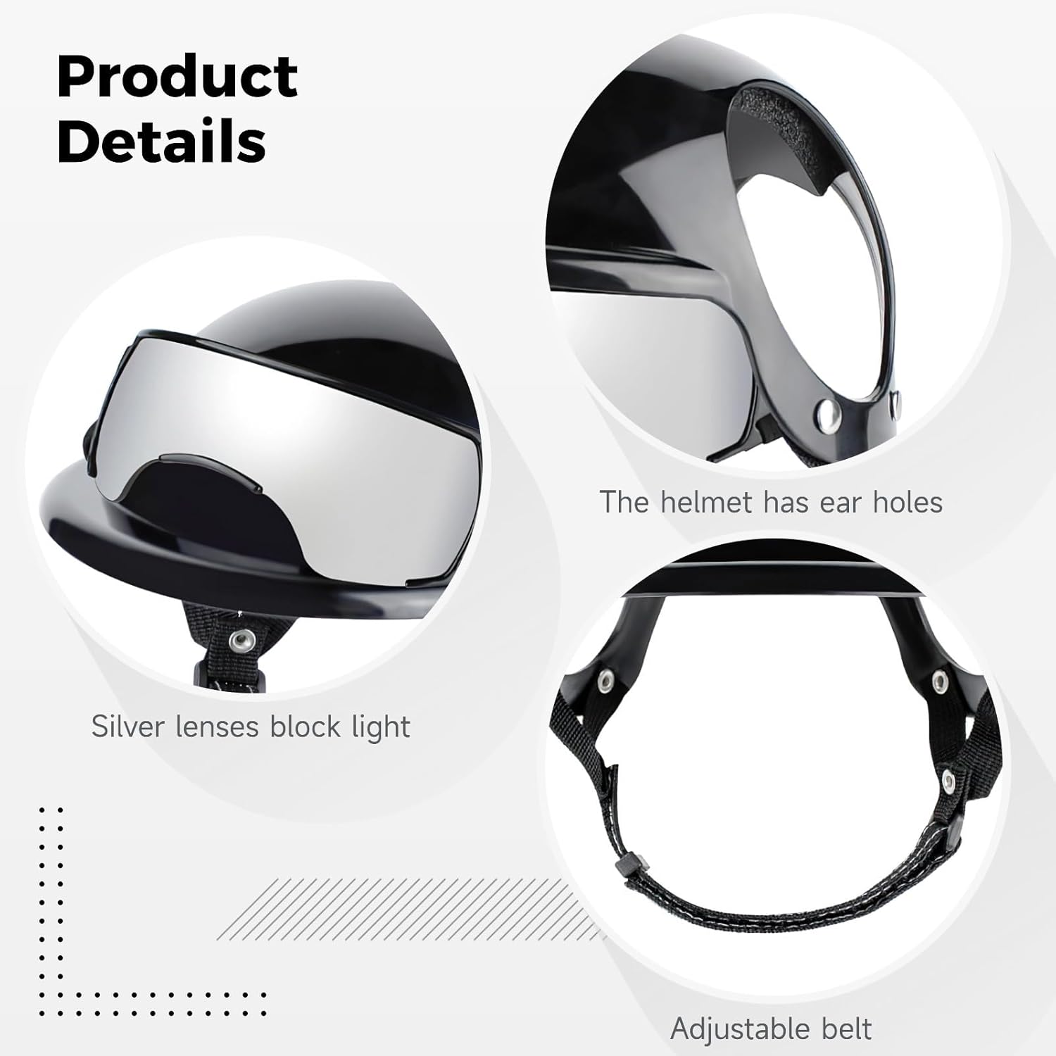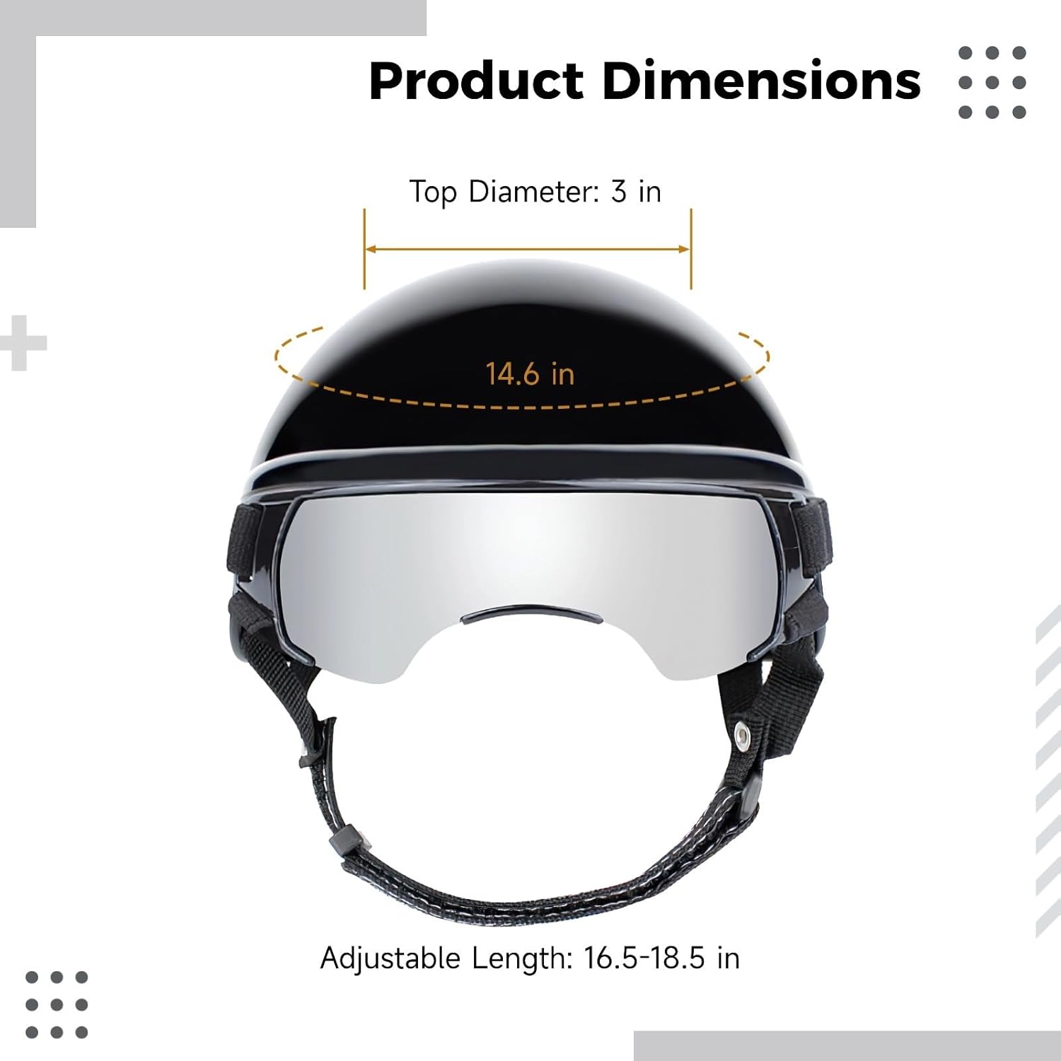 About this item Complete the Look with One Purchase: Our 2 pcs set includes both a stylish dog helmet and goggles, offering a convenient, one-stop solution to make your pet stand out with a fashionable and unique style Ultimate Protection for Your Furry Friend: The pet motorcycle helmet is designed to provide anti-collision protection for your dog's head, while the silver lens sunglasses shield their eyes from sun glare, ensuring safety and comfort Secure & Comfortable Fit: Designed with ear holes, our helmet ensures a snug and stable fit, so your dog can enjoy their adventures without the helmet slipping or causing discomfort; head circumference: 14.6 in / 37 cm Lightweight & Burden-Free: Crafted from plastic, this helmet won't weigh your pet down; enjoy peace of mind knowing your dog is protected without added stress, as the top diameter is just 3 in / 7.5 cm Perfectly Sized for Small Breeds: Specifically designed in S size, our dog helmets for small dogs are ideal for breeds with a head circumference of 14.6 in / 37 cm and adjustable length of 16.5-18.5 in / 42-47 cm › See more product details
