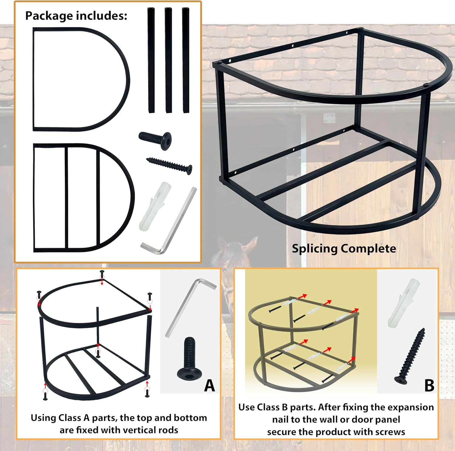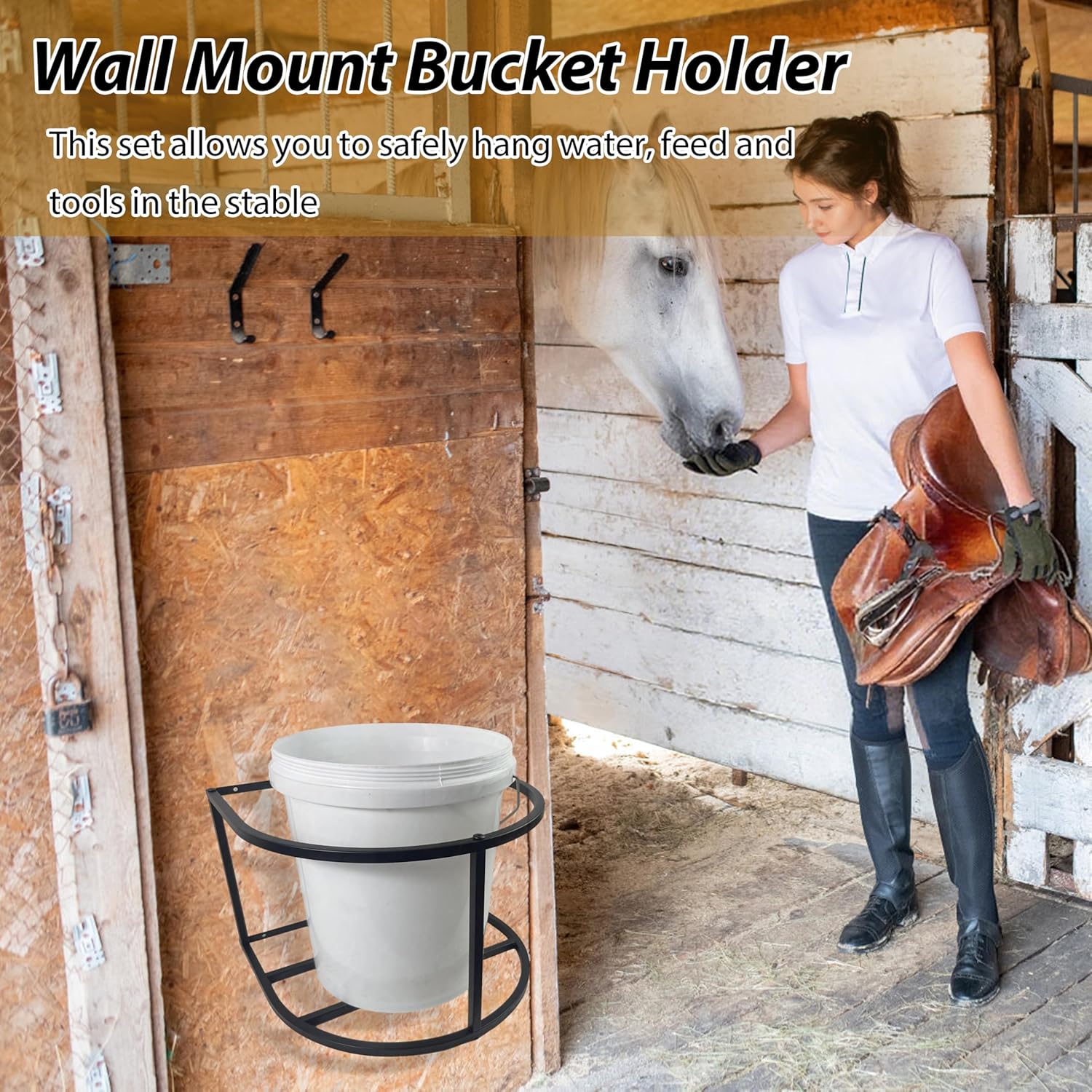 5-Gallon Horse Water Bucket Holder – A practical tool designed for stables, barns, and outdoor equestrian activities. Stable Water Supply: Secures a 5-gallon large-capacity bucket to prevent tipping or spilling during drinking, ensuring clean water access. Efficient Feeding: Holds feed buckets for concentrated hay or pellet distribution, minimizing waste. Multi-Horse Use: Suitable for group feeding with an ergonomic height that matches horses' natural grazing posture. Hygienic Design: Wall-mounted or elevated construction prevents ground contact with dirt/waste, reducing bacterial contamination. Safe Edges: Smooth rounded contours and curved structure protect horses' lips and legs from injuries. Versatile Placement: Adaptable for indoor (stalls, stables) or outdoor (pastures, training grounds) installation. Package Includes: Bucket holder + Wall-mount screws Dimensions: 15.5" (L) × 14.5" (W) × 10" (H)