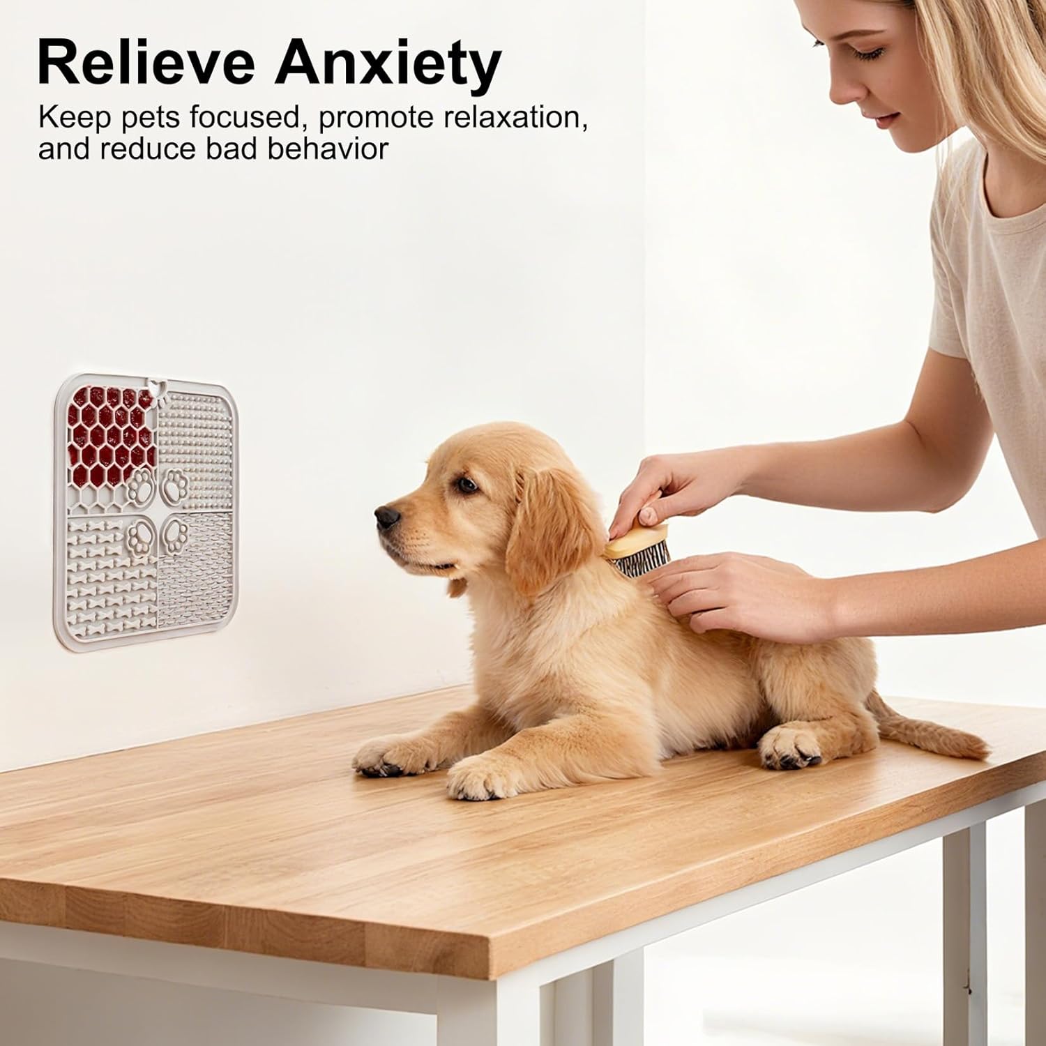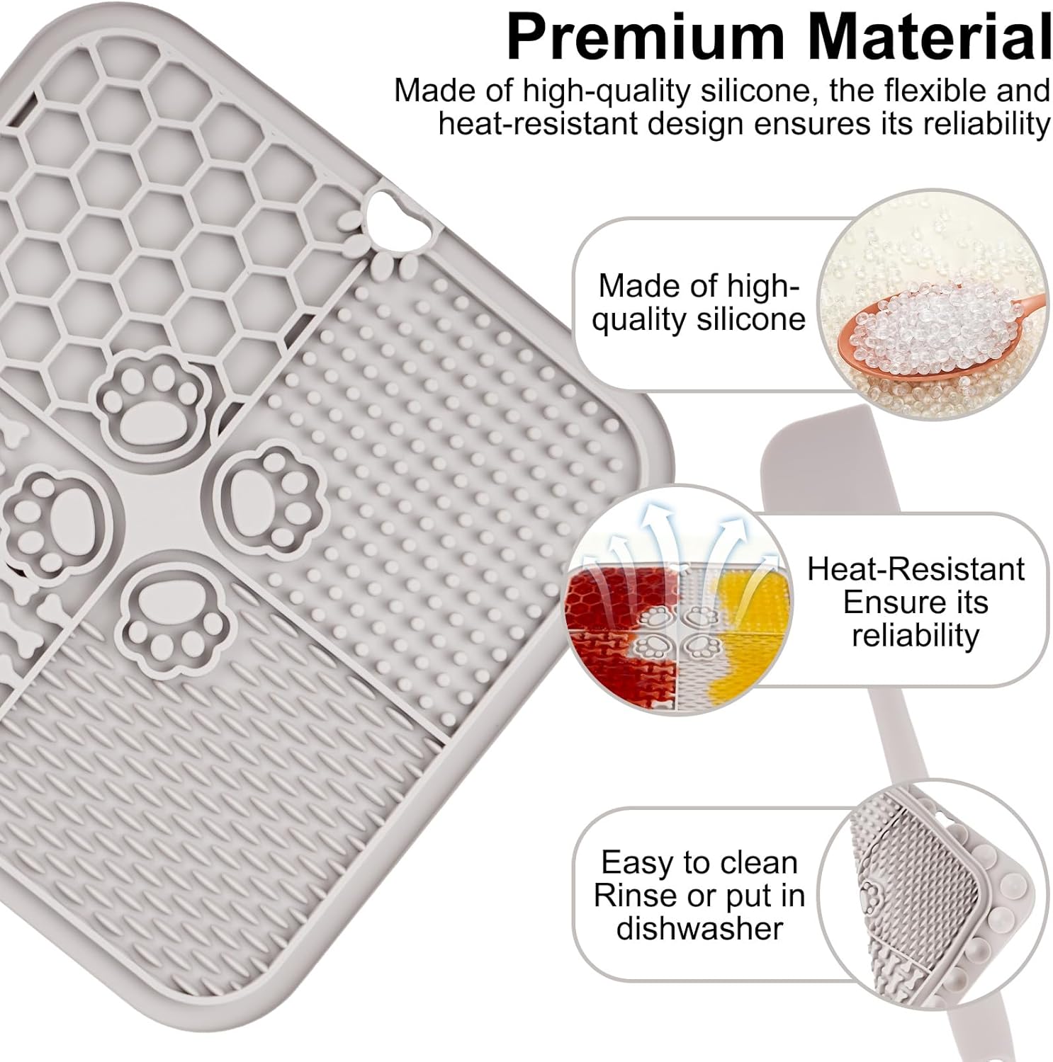 What are the advantages of our licking matt for dogs? 1. High-Quality Materials: Made from durable silicone, the lick mat for cats are heat-resistant and dishwasher-safe, making cleanup effortless after meals. 2. Enrich the Mealtime Experience - puppy lick mat enriches the mealtime experience by slowing down eating, promoting digestion, and reducing overeating. 3. Relaxing Effect - lick pads for dogs helps keep your pet calm and engaged. The textured surface encourages licking and helps remove food particles from the tongue, promoting oral hygiene. 4. Suction Cups Provide Flexible Placement - lick mats for dogs features 47 strong suction cups that securely attach to the bathtub, wall, or floor. 5. Promote Oral Care and Positive Behavior - licky mats for dogs also helps remove food particles from your pet's tongue and provides fresh breath. Features: Material: Silicone Color: Gray, Black Dimensions: 20 x 20 x 1 cm / 7.87 x 7.87 x 0.39 inch Scope of delivery: 2 x Dog Licking Pads 2 x Scrapers Note: Dimensions are measured manually. Please allow for slight deviations. Due to monitor settings, actual colors may vary slightly from online images. Please refer to the actual product for accuracy. Thank you for your understanding.