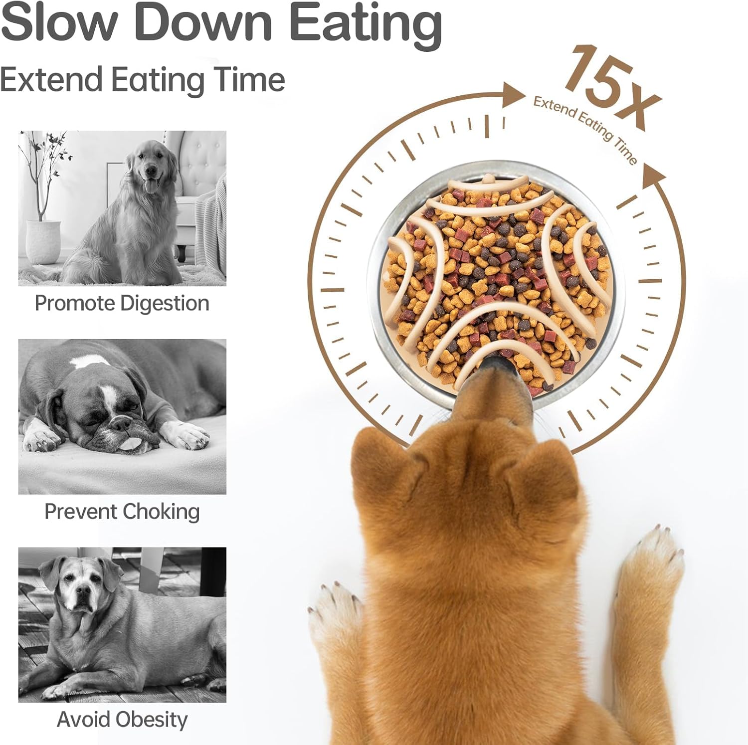 About this item 【Slow Down Eating/Feeding Time】If you want to slow down your dog's eating speed and let your dog avoid these problems of digestion, choking, and vomiting after eating, you need this slow feeder insert which can perfectly solve these problems.Using this dog bowl slow feeder can increase your dog's feeding time by up to 10x their speed with a traditional bowl to ensure your dog has more time to digest food. 【26 Octopus Suction Cup】Dog slow feeder has 26 octopus suction cups, can firmly work on most of the material dog bowls bottom such as glass, plastic, ceramic, stainless steel. Strong suction can keeps your dog from pulling out the slow feeder insert. You can easily install this slow feeder insert in your dog bowls without adding water. 【Safe For Pets】 Made of food safe silicone material that is BPA, PVC, and Phthalate free.It is soft enough for safety that can avoid scratching the dog mouth, nose and tongue. 【Easy to Clean】Suitable for wet dog food, dry dog food, and dog treats. Easy to remove and clean,dishwasher safe. 【NOTE】Not a chew toy, please keep pets from chewing it. May not for flat faced dogs › See more product details