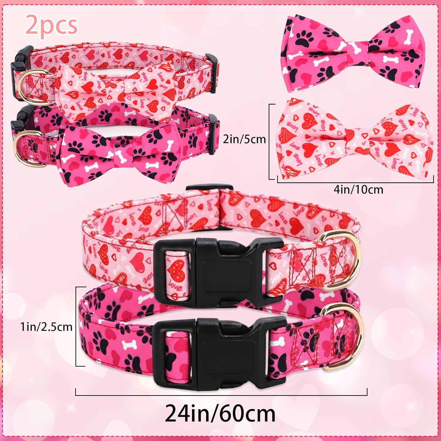 Our adorable Valentine's Day dog collar is expertly crafted for both comfort and durability. and includes 2pcs distinct collars .Made with a soft cotton-polyester blend, it’s gentle on the skin and perfect for all-day wear. This dog collar features X-cross heavy-duty stitching reinforced at the buckle attachment points for enhanced tear resistance, a heavy-duty quick-release buckle, and an adjustable fit ranging from 0.98" to 23.62". Complete with a charming removable dog bows featuring hearts and paw prints, it’s an ideal festive accessory for walks, photos, or special occasions—keeping your pet safe, stylish, and ready to shine!