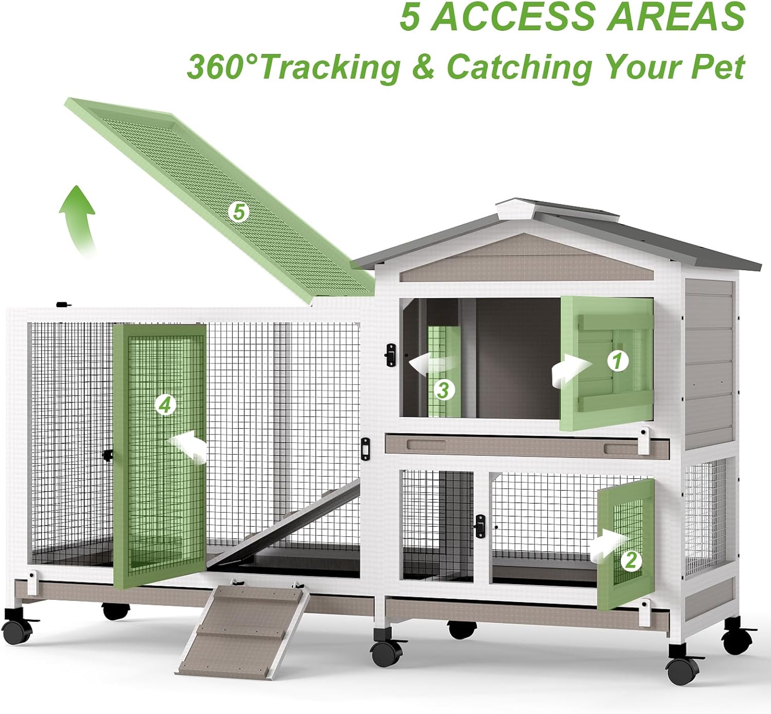 About this item 【3 Leak-Proof Pull-Out Trays】 Includes 3 separate deep trays that are completely waterproof. Designed with seamless one-piece molding to prevent any leaks. The smooth plastic surface can be wiped clean in seconds for ultimate ease. 【Chew-Resistant Ramp with Dual Metal Guards】 Reinforced with metal edges on both sides to prevent destruction from gnawing. Engineered to last twice as long as standard wooden ramps! 【All-Weather Indoor & Outdoor Use】 Engineered with an asphalt-coated roof to ensure a 100% dry interior, combined with a solid waterproof cedar frame. The elevated design is perfectly sized for 1-2 rabbits with no weight limits! 【Hutch-on-the-Move】 6 locking casters make it easy. Roll your pet outside for fresh air or to a new spot for cleaning—effortlessly. Rolls with Ease, Locks in Place!” 【Spacious 2-Story Design】 Measuring 57"L x 22"W x 32"H, this extra-large habitat provides ample room for your bunny, guinea pig, or ferret to play and relax. A true palace for your beloved pets! › See more product details