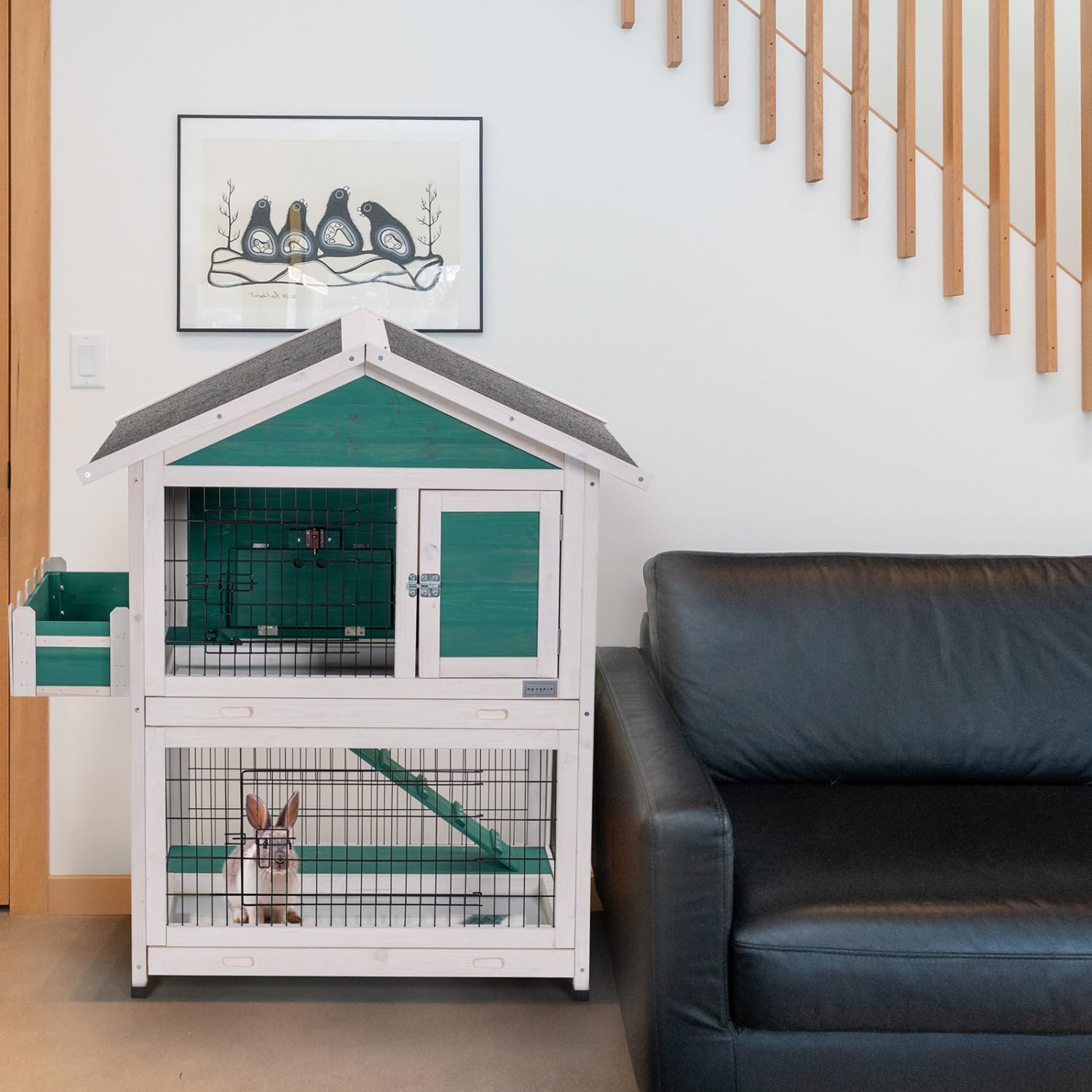 Material: Solid WoodColor: GreenWood Type: Finnish SprucePaint Type: Water-BasedRoof Material: AsphaltPull Out Tray Material: GalvanizedProduct Feature1: 2-StoryProduct Feature2: Pull Out TrayProduct Feature3: RoofProduct Feature4: Easy to CleanSpacious Space: The two-story rabbit cage is ideal for 1-2 rabbits and similar-sized pets, offering ample room to run up and down with a solid non-slip wood ramp. Practical Design: 2 pull-out trays on each level simplify cleaning, while the roof can be opened for easy access. Three front doors allow interaction with pets from any side, and the top floor can be closed with a vertical door for separation. A sliding slope ensures pets can easily enter the raised area. Sturdy & Safe: Made from Finnish spruce timber and treated with water-based paint, this hutch is safe for pets. Thicker panels and mesh wire enhance sturdiness, while galvanized trays and an asphalt-covered roof ensure durability and weather resistance. Adorable & Stylish: The classic cottage design with a flower balcony adds a charming, retro aesthetic to both indoor and outdoor spaces. The top floor is divided into two rooms, offering excellent ventilation and visibility with three open doors and metal mesh surrounds.