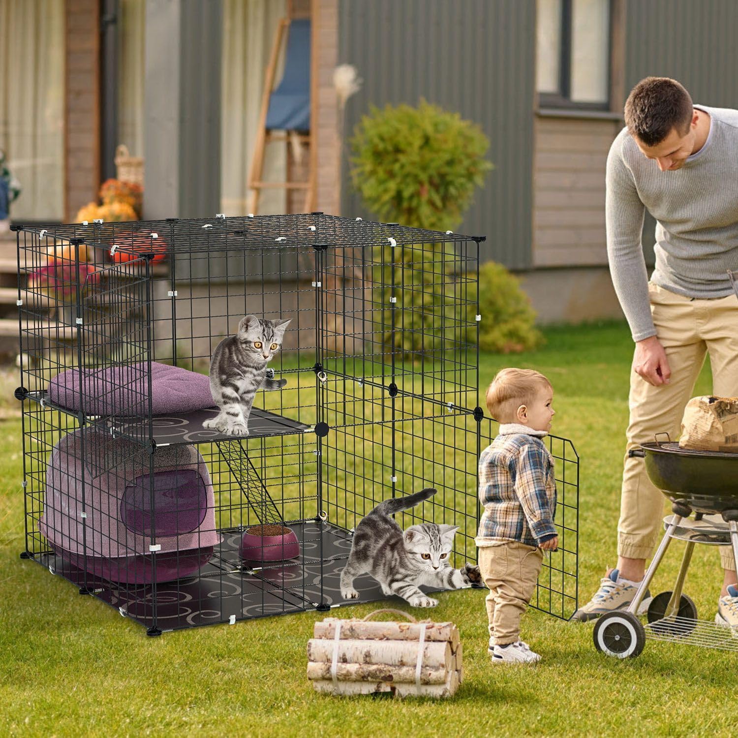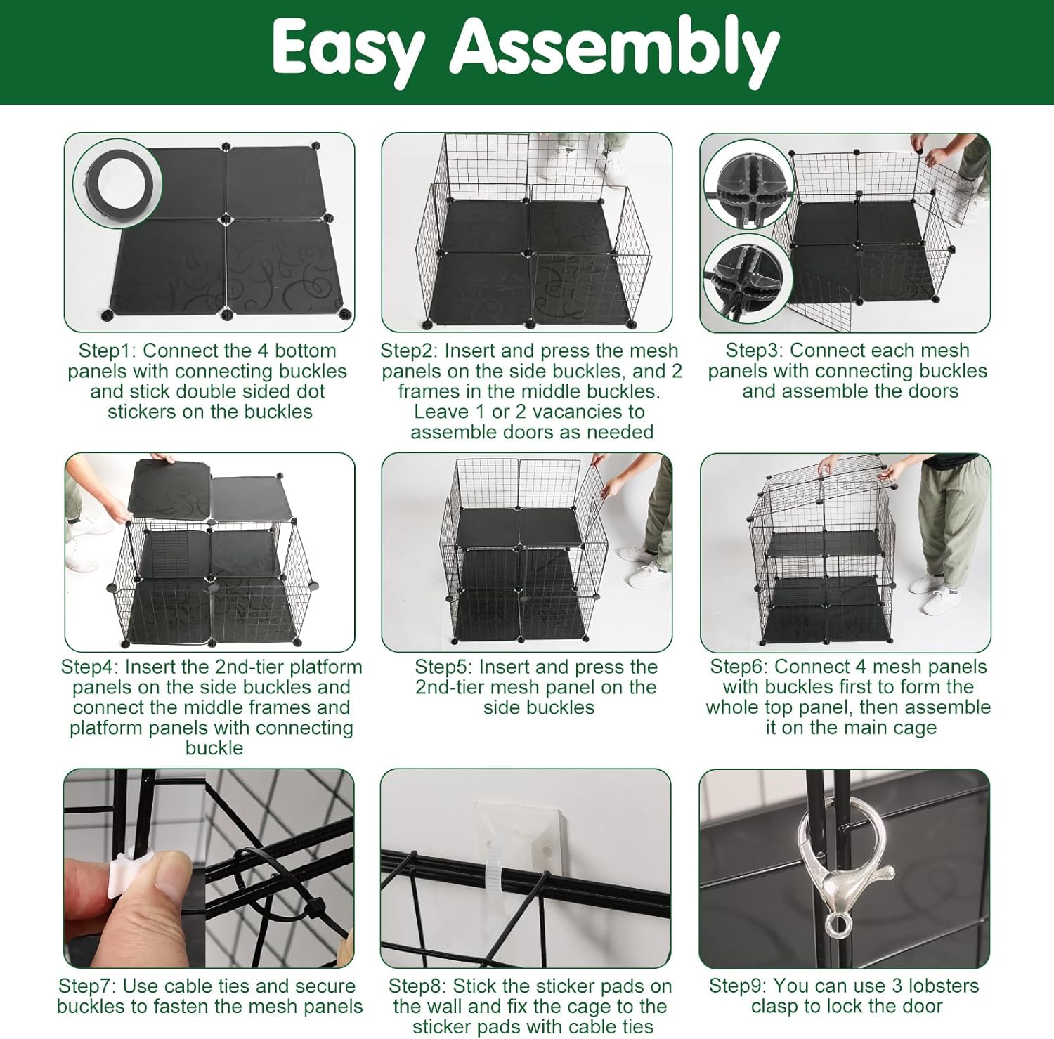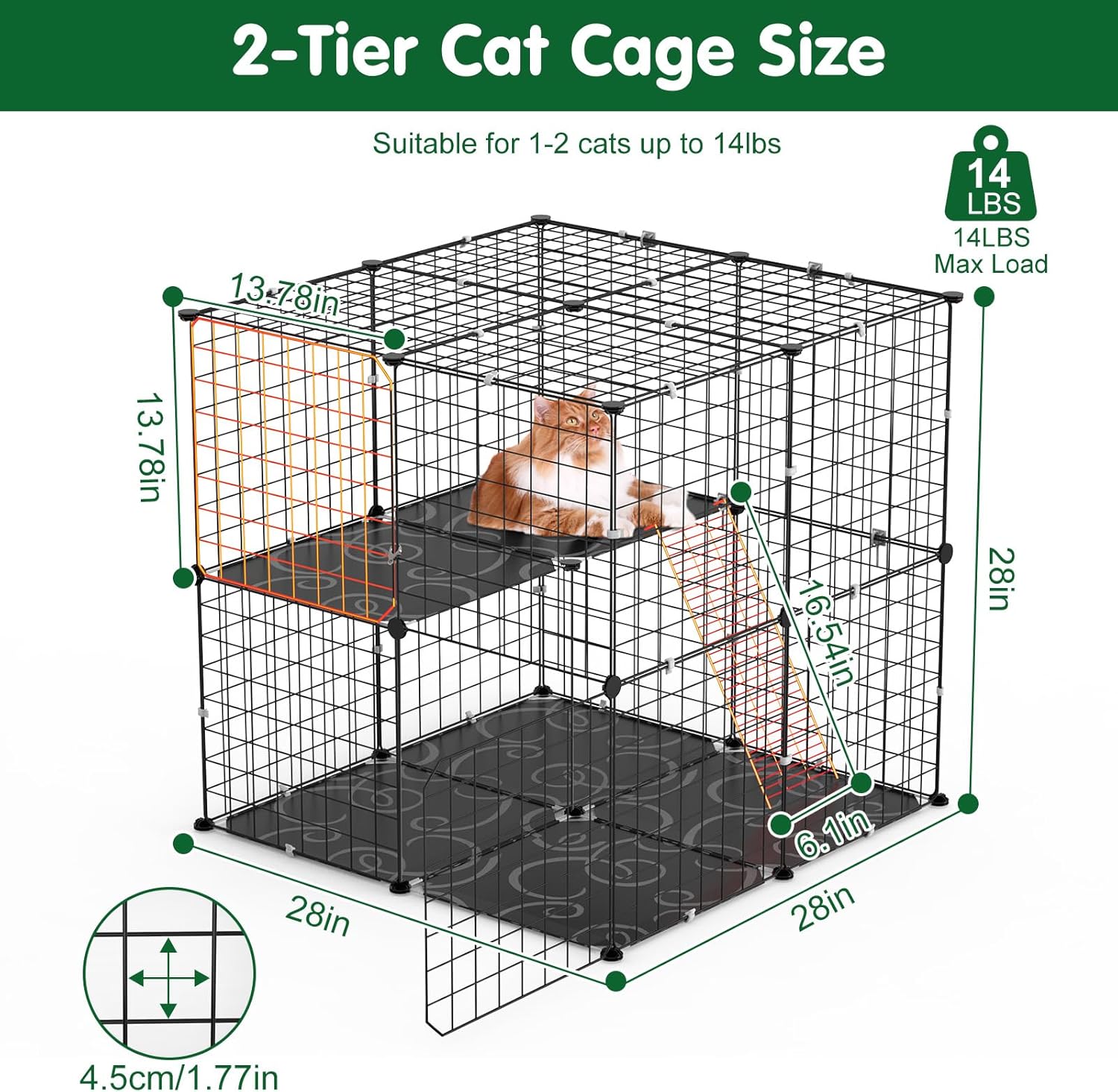 About this item 【2-Tier Cat Cage with Ladder】This cat cage measures 28 x 28 x 28 inches and is perfect for one or two cats. It features a ladder for easy climbing, providing a comfortable space for your cat to rest and play. This cat cage is suitable not only for cats, but also for other small animals like guinea pigs, ferrets, and rabbits. 【Thoughtful Double Door Design】 Our cat enclosure features double doors for convenient feeding, drinking, and daily interaction. Additionally, we provide three lobster clasps to securely lock the doors, ensuring your cat can play safely inside. 【Heavy-Duty Wire Mesh Cage】 Made from advanced, durable, and safe materials, this cat house can support cats weighing up to 14 pounds. Its smooth surface and edges prevent injuries, and the sturdy metal frame ensures stability. 【Easy Assembly】This cat cage enclosure can be easily assembled in 30 minutes using the included hammer; no other tools are required. Additionally, it comes with 24 safety buckles and 12 small safety ties to secure the entire frame, ensuring a secure connection and a strong structure. Twelve double-sided dot stickers and four sticker pads with tie-ties enhance the cage's stability. This two-tiered, enclosed indoor cat enclosure provides a safe and stimulating environment for your cat or kitten to play and rest. 【Easy to Clean】 This two-tiered cat playpen is constructed of thickened iron with a rust-resistant coating and is easy to clean with a soft cloth. The internal ladder and platform are easily removable for quick and easy cleaning. › See more product details