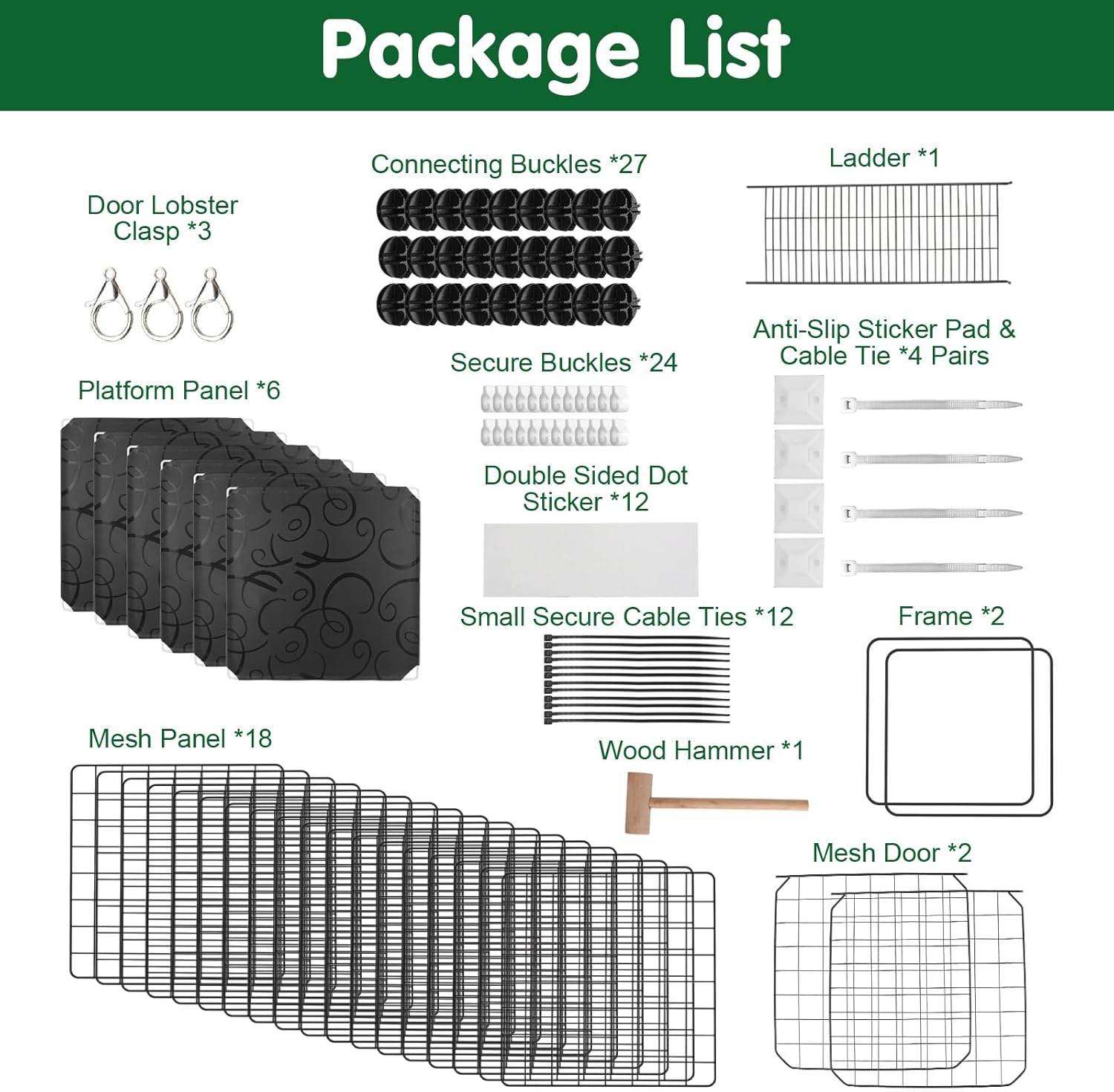 - Included Components: 1 x Cat Cage Playpen, 1 x Wood Hammer, Mesh Panel *18; Frame *2; Mesh Door *2;Ladder *1; Connecting Buckles *27; Secure Buckles *24; Door Lobster Clasp *3; Double Sided Dot Sticker *12; Anti-Slip Sticker Pad & Cable Tie *4 Pairs; Small Secure Cable Ties *12; 1 x User Manual, Platform Panel *6