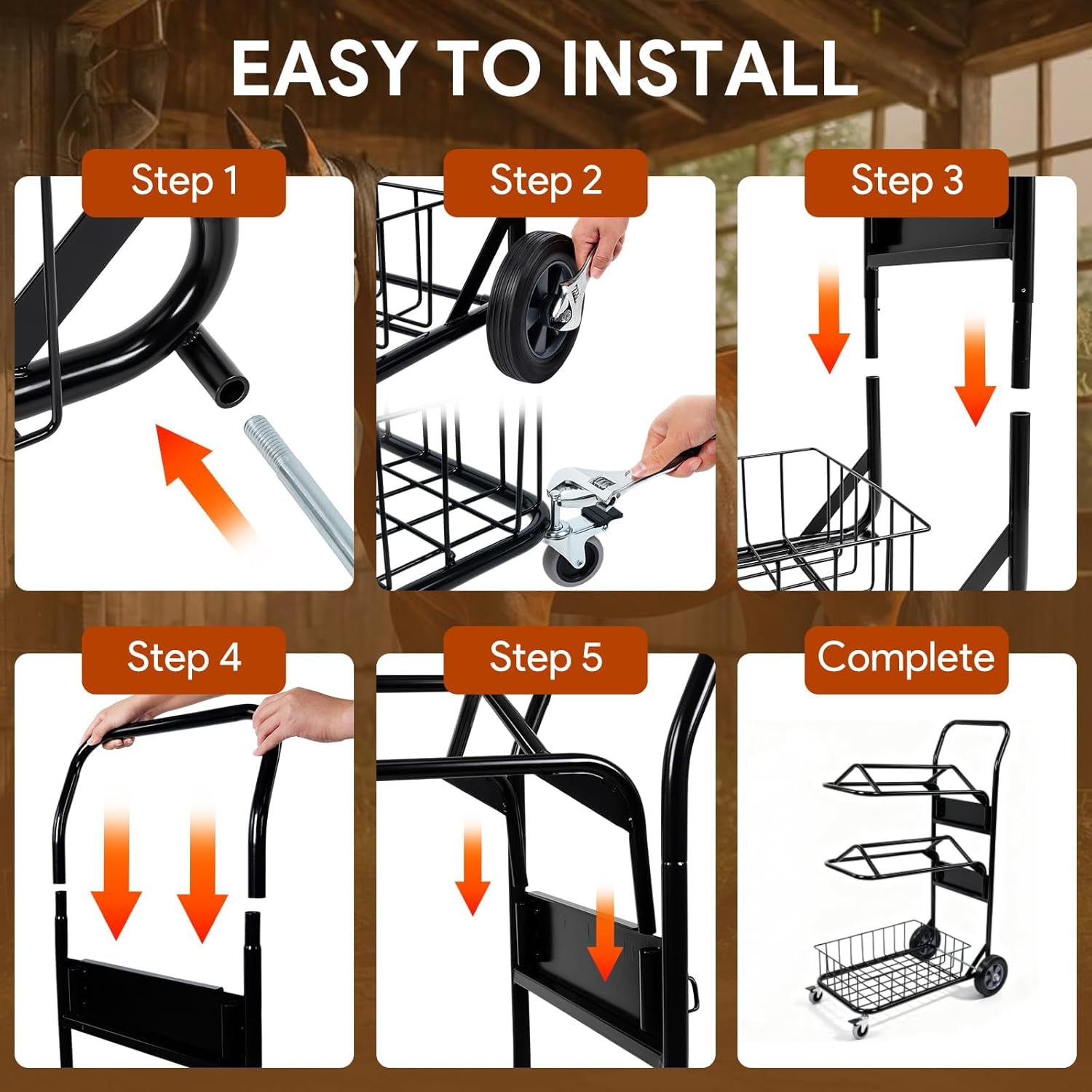 Why Choose Our Heavy-Duty Saddle Cart?An upgraded stable solution that combines superior maneuverability with rugged construction for professional equestrian needs.Key Features:Improved Maneuverability Four-wheel design with front-wheel locking switches for precise controlHeavy Duty Construction Reinforced steel tubing provides increased load capacityAll Weather Protection Durable powder coated finish prevents rust from outdoor exposureQuick Assembly Design Sets up in minutes with collapsible structure for easy storageVersatile Stable Solution Suitable for barns, arenas, trail rides and equestrian eventsWhy It's Essential:Provides stable transportation for heavy tackWithstands demanding equestrian environmentsProtects investment from weather damageSaves time with easy setup and storageOrganizes tack efficiently anywhereIdeal for professional equestrians and stable managers needing a reliable, weather-resistant saddle cart that combines heavy-duty construction with superior mobility features.