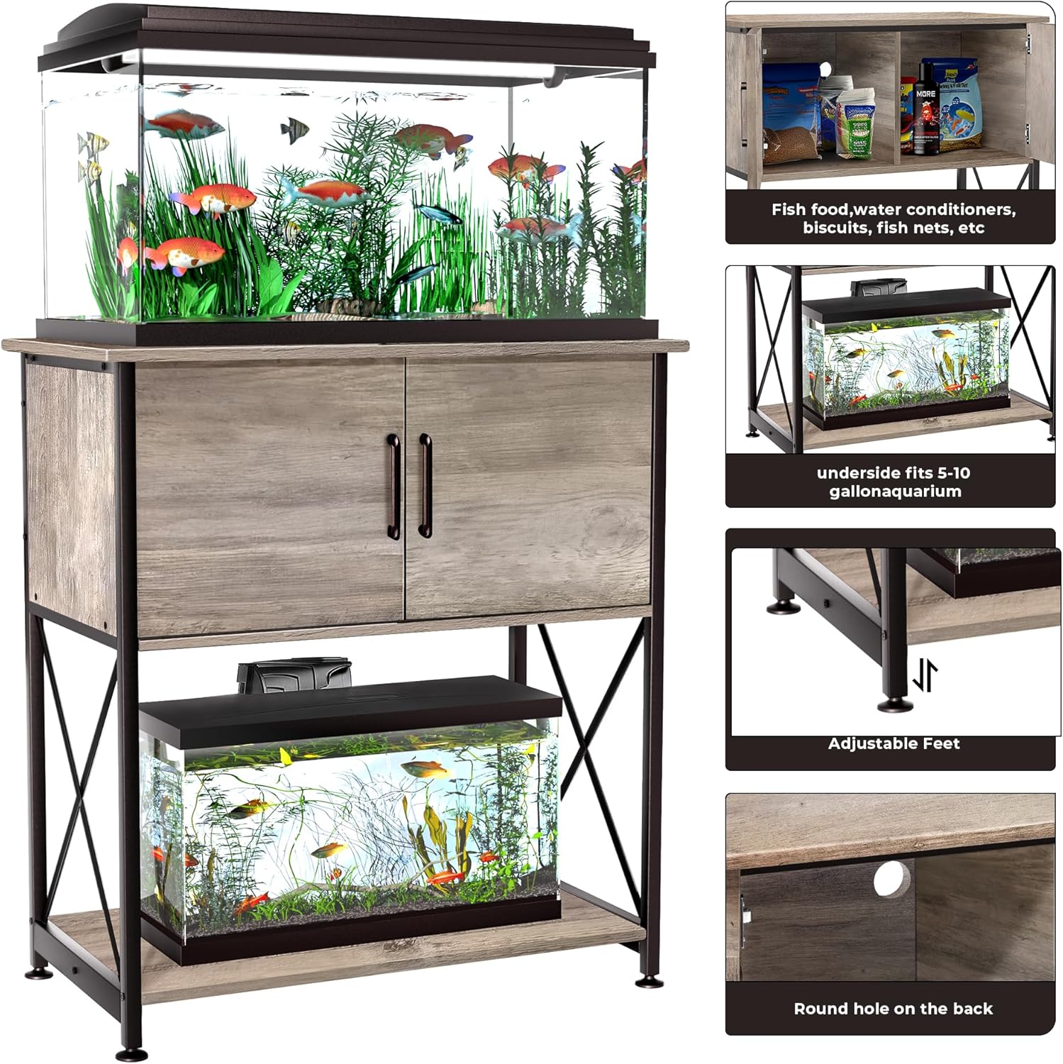 About this item Wide Fish Tank Stand: Fish tank stand is suitable for 20-29 gallon fish tanks, including 20-gallon long tanks, with a desktop size of 30.7 inches * 16.5 inches, which can accommodate most standard size fish tanks. However, to ensure a perfect match, we recommend measuring the dimensions of your fish tank before purchasing. 2 in 1 Space Design: Stand is designed with two levels for fish tank placement, the desktop can accommodate differently shaped 20-29 gallon fish tanks, and the bottom can also hold small 5-10 gallon fish tanks. This structure raises the height of the fish tank to a more comfortable viewing height while maximizing the use of limited space. It keeps your fish tank storage neat and tidy. Sturdy and Stable: Stability is crucial for a fish tank. Therefore, our stand is made of thick steel with powder coating and sturdy MDF board, ensuring a weight capacity of 330 pounds for the desktop and 110 pounds for the bottom, to ensure durability, moisture resistance, and prevent shaking or instability like other products on the market. Convenient Storage: Stand features a spacious storage cabinet in the middle, making it easy to store fish food, nets, gravel cleaning agents, and more. The storage cabinet keeps your fish tank area clean and tidy and allows you to access the items you need easily. Modern Appearance: Aquarium stand features a modern Grey design that matches various home decor styles. This design is not only practical but also beautiful, making it the perfect decoration for your home. Tanks not included. Support dimensions: 30.7" x 16.5" x 31.88". 2-Year Support - We attach great importance to product quality and customer service. If you experience any quality problems, please feel free to contact us. › See more product details