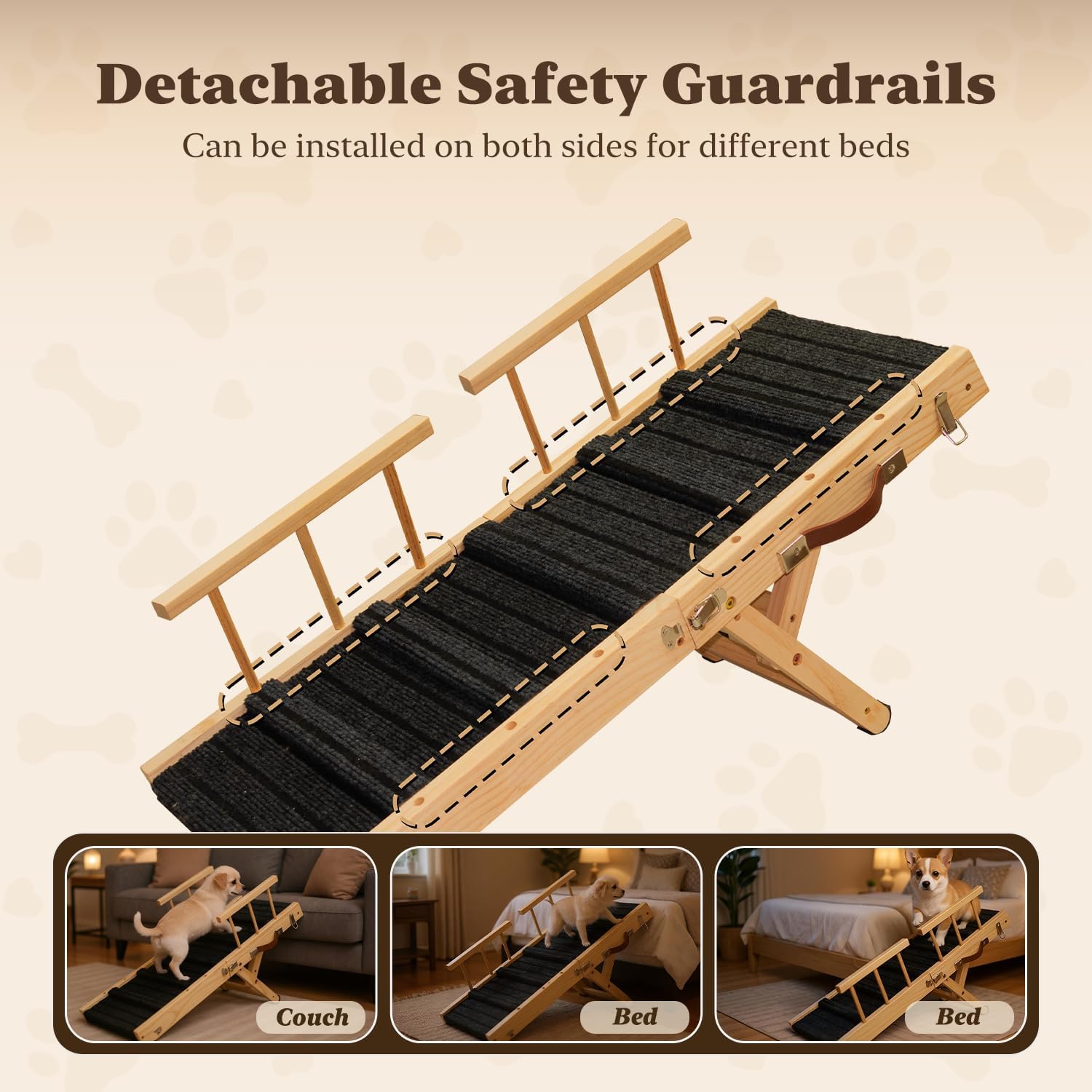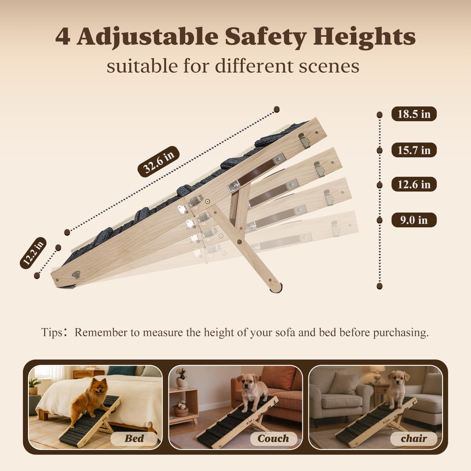 About this item Tips - Please measure the height of your low bed before purchasing, as this product is not suitable for high beds. 【Four Adjustable Heights】This compact 32.6-inch foldable dog ramp is designed for small to medium-sized dogs and cats, featuring four adjustable height settings ranging from 9 inches to 18.5 inches (please verify these measurements meet your needs before purchase). It provides easy access to elevated surfaces such as beds, sofas, and chairs at corresponding heights. 【Safety Features】1) Comes with two removable guardrails to prevent pets from falling off the sides; 2) The ramp surface is made of anti-slip fabric and includes five raised anti-slip strips for secure climbing; 3) Non-slip pads are attached to the bottom for stability; 4) Side safety buckles are included to ensure the ramp remains firmly in place. 【High-Quality Solid Wood】Despite its compact size, this dog ramp is crafted from high-quality solid wood, ensuring excellent weight capacity and durability. Its scientifically engineered structure guarantees stability during use, with no shaking or wobbling. Having passed over 1,000 independent safety tests, it supports up to 200 lbs. 【Portable & Easy Storage】Weighing just 8.8 lbs, this dog ramp is designed for easy storage and portability. Its foldable design, combined with a leather handle, allows you to conveniently take it anywhere. It can be stored unfolded under the bed or folded compactly in a corner or car trunk—maximizing space efficiency wherever you go. 【Worry-Free After-Sales Support】Should you have any questions, please feel free to contact us at any time. We guarantee a response within 24 hours to ensure you receive a 100% satisfactory shopping experience. › See more product details