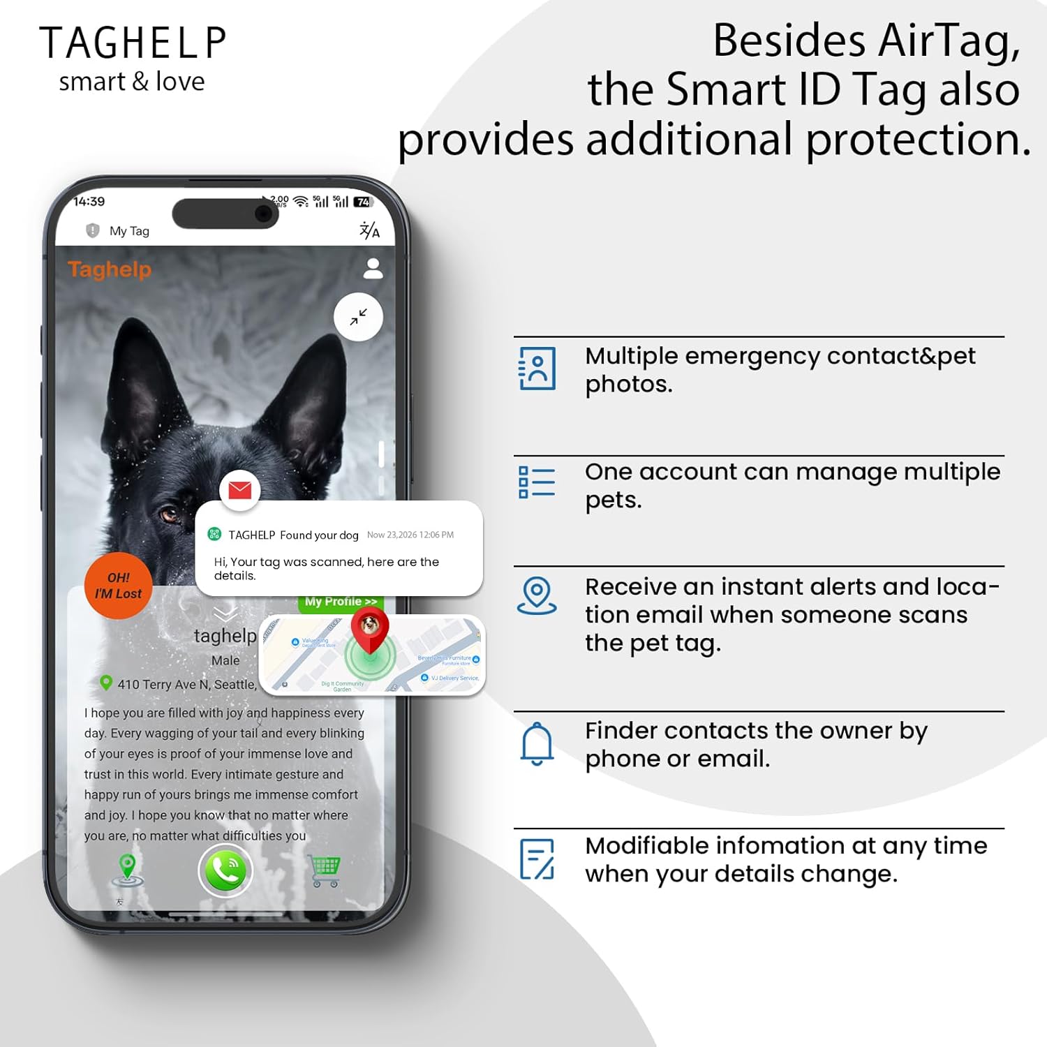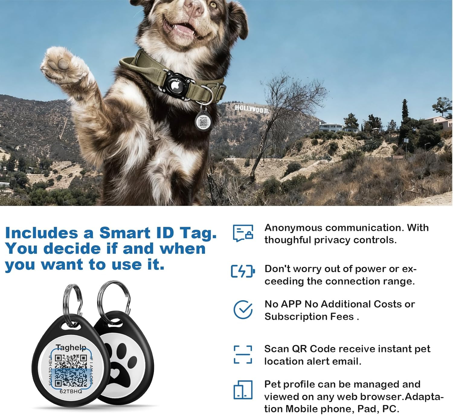 About this item 1.Integrated Design: TAGHELP integrated Air Tag dog collar holder is not only perfectly compatible with Apple Air Tags, but also engineered for strength and durability, the design eliminates issues with dangling, movable, and flimsy plastic or silicone Airtag dog collar holders 2.Ultra-Durable: Air tag dog collar combining premium hardware, material, craftsmanship, durable air tag holder and is military grade with long durability. Metal sides that attaches to the collar will never breaks 3.IPX8 Waterproof and Dustproof: Rain, swimming, or rolled around in the dirt? No prob,em! Fully enclosed dog collar with Air tag holder is fully shielded from water, dust and damage. Air tag dog collar offers durable, fully sealed protection for your pet's Airtag.(AirTag is NOT INCLUDED) 4.Control Handle : Military Training Nylon Dog Collar has special control handle,can efficiently control your dog when training, patrol,hiking, jogging, camping, working, running, jumping, traveling, camping.fits lots of medium and large dogs like German Shepherd, Border Collie, Rottweiler, Great Dane, Doberman, Golden Retriever, Husky, Labrador, Alaskan Malamute,etc 5,Anti-Lost Function: You will receive an real-time scanned location alert email or a phone call When someone scans the pet id tag's QR code; It is not a GPS tracker, only GPS until the finder scans the QR code and chooses to send a location to you › See more product details