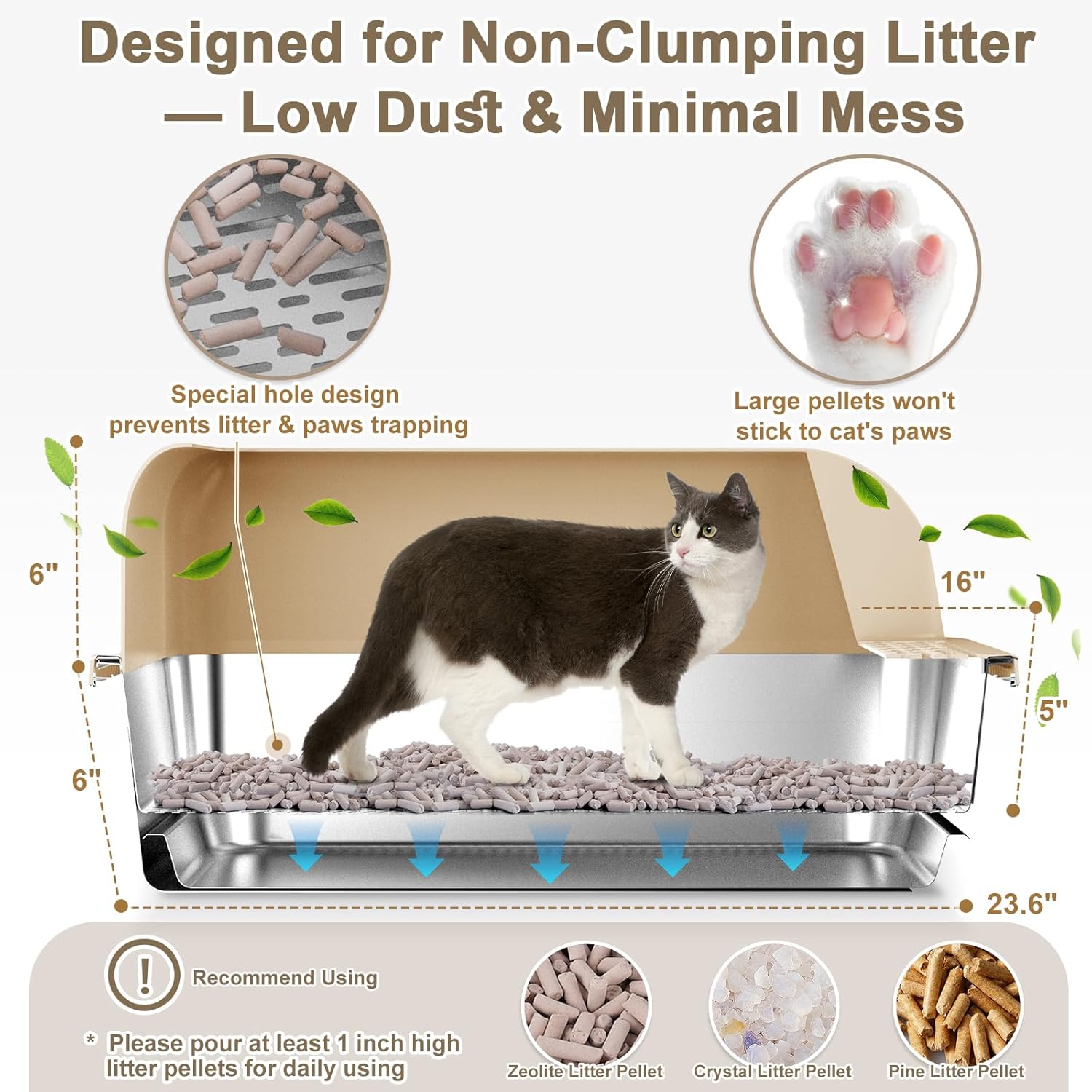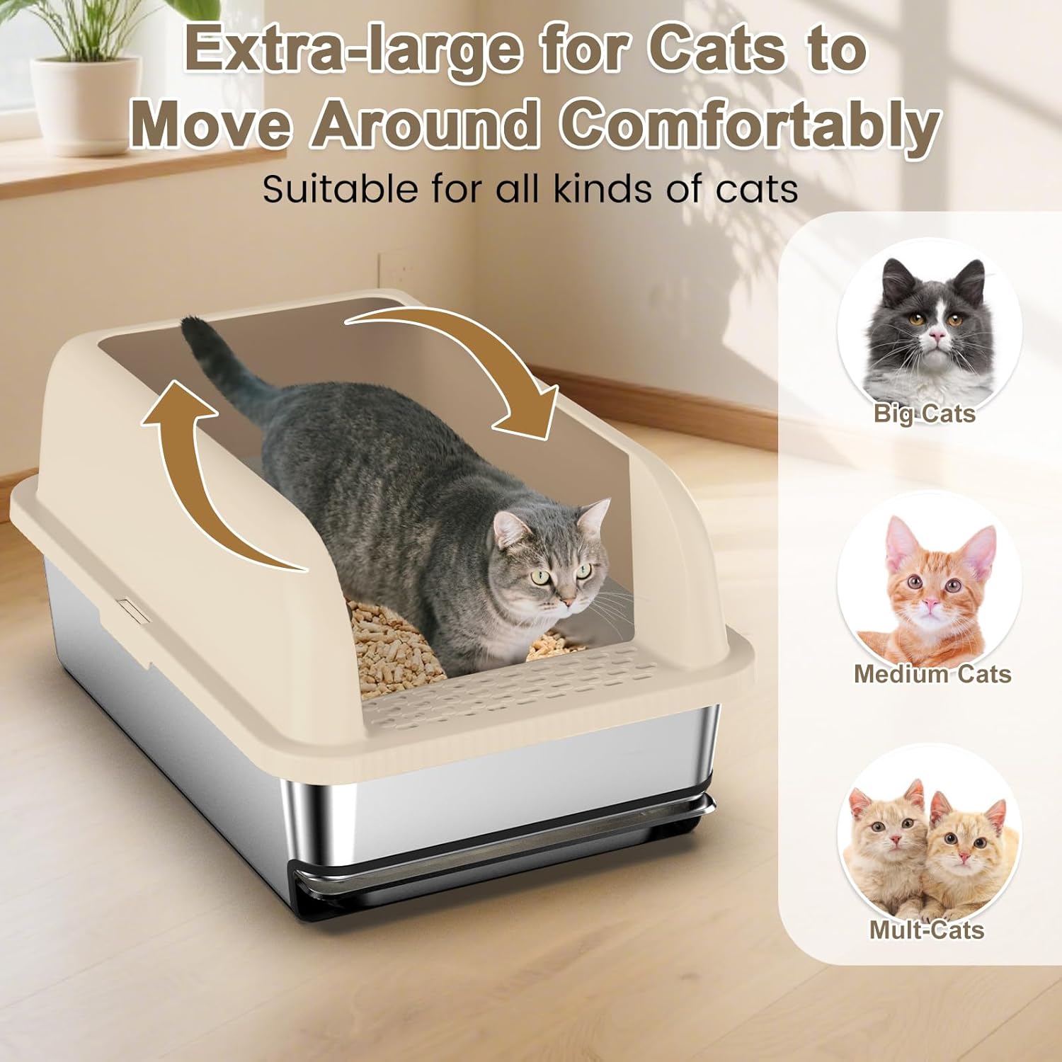 About this item Drawer Design for Easy Waste Cleanup: When your cat uses this sifting cat litter box, urine flows through the sifting holes, and pine litter debris falls into the drawer. This litter box stainless steel reduces dust for a healthier space. Cleaning is effortless—simply pull out the drawer to dispose of waste, making daily maintenance quick and hassle-free, no more struggling with traditional litter boxes Sturdy Stainless Steel for Odor Control & Long Term Use: Compared to plastic litter boxes, this premium cat litter box stainless steel model offers durability. The sturdy surface prevents litter sticking and odor buildup even with long-term use. The specially designed oval holes work with non-clumping litter to allow liquid waste to drain into the lower tray, you only need to scoop solid waste for effortless daily maintenance 6-Inch High Lid Design for High-Peeing Cats: This high sides enclosed steel cat litter box comes with a 6" high splash-proof lid, effectively preventing urine from splashing out by cats that pee at the edges or have heavy urination, minimizing odor dispersion and simplifying cleanup. Meanwhile, the semi-enclosed structure provides a private toilet space for cats, especially suitable for those with heavy urination, fond of digging litter, or active by nature, making them feel more secure Extra Large Designed for Your Beloved Cats: This extra large sifting cat litter box measures 23.6" long by 16" wide, with an extra large capacity of 37 L to hold litter. Even during your travels,there's no need to stress about running out of litter and disrupting your cat's routine. With a spacious 16" width, this litter box gives Maine Coons, Ragdolls, and other large breeds ample room to turn and move around comfortably, reducing the cramped feeling of traditional boxes Easy Maintenance: This cat litter box metal with lid is designed to work exclusively with non-clumping, water-insoluble litter (crystal, pine pellets, or zeolite) for optimal drainage efficiency. Liquid waste percolates rapidly to base tray, minimizing waste and simplifying cleanup. The larger pellet size minimizes litter tracking, as it doesn’t cling to your cat's paws as much. Just scoop solids daily for hassle-free maintenance. The naturally absorbent material is reusable: rinse and air-dry between uses. An eco-friendly solution that enhances convenient cat care › See more product details