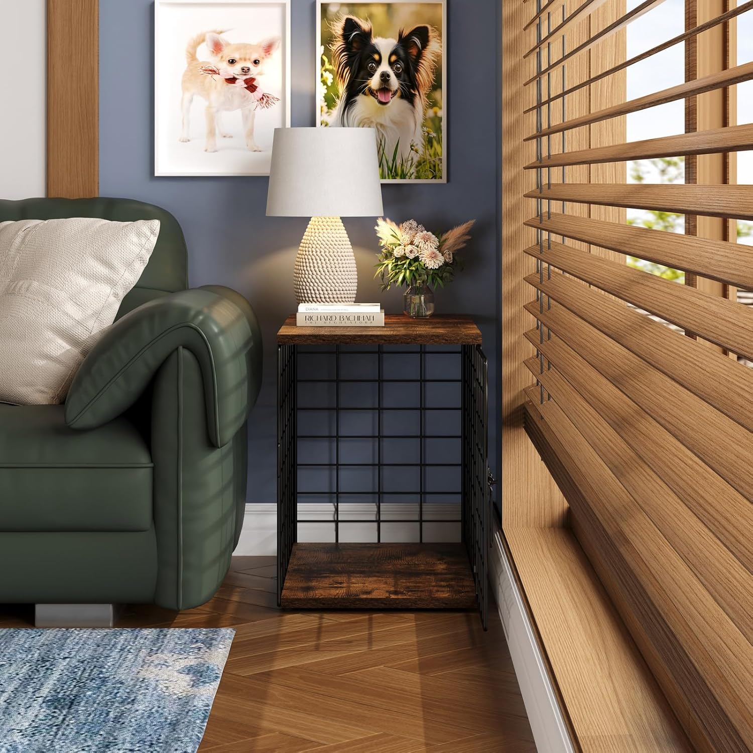 About this item Multi-Functional: Innovative 24 inch Dog Crate transforms into an end table, decorative shelf, nightstand, or stool—perfect for living rooms, bedrooms, balconies, or hallways. The reinforced top offers ample storage for dog food, pet clothes, photo frames, medium-sized plants, magazines, or night lights. Sturdy enough to support an adult’s weight! Stylish Design: Say goodbye to ugly metal cages! Our small dog kennel indoor features modern furniture design, blending seamlessly into your home décor. Its elegant look complements any style, making unsightly pet crates a thing of the past. Pet-Friendly & Durable: Crafted with premium wood panels + 3.0mm thickened chew-proof metal mesh, this dog crate for small dogs includes a solid wood base to protect pets’ paws and heavy-duty wire to resist biting. Ideal as a puppy crate or small dog cage, it ensures comfort and long-lasting durability. Designed for Small Dogs/Puppies:Designed specifically for small dogs 5-10 pounds (or puppies under 5 lbs), this 24 inch dog crate provides a spacious, safe retreat. Perfect for style-conscious pet owners who prioritize safety. Lightweight & Easy Assembly: Weighing just 13.3 lbs! All parts are clearly labeled (A-H) with illustrated instructions for quick assembly. Enhanced G-H lock clasps ensure stability while maintaining the sleek look of a dog crate end table › See more product details