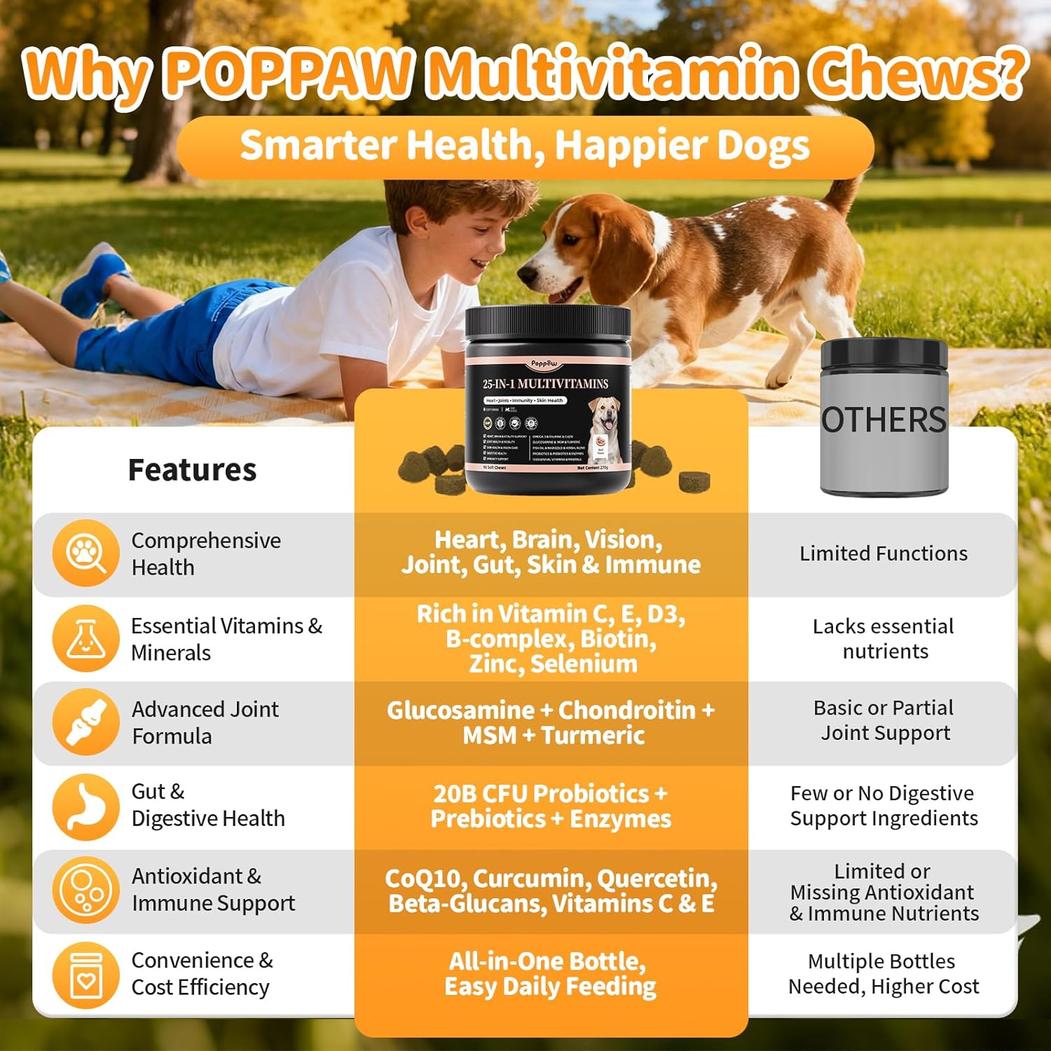 About this item 25-in-1 Daily Dog Multivitamin Chews: Comprehensive dog vitamins and supplements for skin & coat, joint health, heart, brain, digestion & immunity. Rich in Omega-3 fatty acids (DHA/EPA), vitamins, minerals & CoQ10 for daily vitality. Convenient, tasty soft chew for all breeds & life stages. Ideal daily multivitamin for dogs of all breeds and ages. Best results with continued daily use. Heart, Brain, Eye & Vitality Support: Advanced dog vitamins with polyunsaturated fish oil (DHA/EPA), Taurine, L-Carnitine & CoQ10 to support heart function, cognitive health, vision, and energy metabolism. Unique multi-nutrient blend for all-day vitality and overall well-being. Joint Health & Mobility: Premium dog joint supplements with Glucosamine, Chondroitin, MSM & Turmeric (95% Curcumin) to maintain cartilage resilience, flexibility & comfortable movement. Ideal for active dogs and seniors to improve mobility and prevent stiffness. Skin, Coat & Allergy Support: Enriched with Omega-3, Biotin, Zinc, Marigold (Lutein & Zeaxanthin), Quercetin, and Nettle Leaf, these POPPAW dog multivitamin chews help maintain soft, shiny fur, reduce shedding, support skin moisture, and promote eye health. Ideal for sensitive or itchy skin, providing gentle itch relief for dogs while nourishing coat and vision. Digestive, Urinary & Immune Support: Supports gut balance, nutrient absorption, and urinary tract wellness with prebiotics, probiotics (2 Billion CFU), digestive enzymes & cranberry. Trusted dog probiotics for daily digestive comfort and immune support. A complete digestive supplement for dogs for daily comfort. Essential Vitamins & Minerals: Complete dog vitamins and supplements including B-Complex, Vitamin C, D3, E, Biotin, Zinc & Selenium to complement daily diet. Promotes overall health, energy, and well-being from puppies to senior dogs. Tasty & Easy to Give – Available in chicken or beef flavor, these soft dog Multivitamin treats are loved by dogs of all sizes and breeds, and can be safely given long-term according to the recommended dosage to support overall health. › See more product details