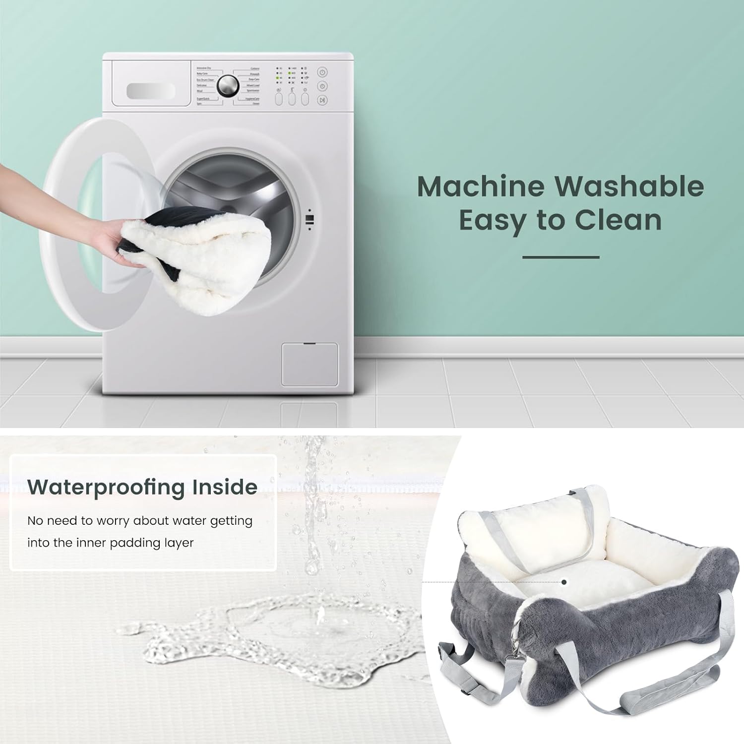 About this item Calm Dogs On The Ride:Filled with memory sponge, this puppy car seat contours to your dog's body, providing plush and supportive cushioning. It offers ample space for small to medium dogs, ensuring they can stretch out and relax comfortably during car rides, reducing anxiety and discomfort for a restful journey.The convenient side pocket allows you to store snacks and calming toys right beside your pet, enhancing their travel experience and keeping them content throughout the journey Safety Journey for Your Furry Friends:Wrapped in memory sponge, this dog car seats for small dogs from road bumps, ensuring a smooth ride. Two adjustable straps fasten the dog bed for car securely to car seats, while the anti-slip bottom pad prevents sliding. A built-in dog leash attaches to your pet's collar, restricting movement and eliminating driving distractions. This thoughtful design safeguards your pet and offers you peace of mind on the road, making it ideal for journeys Perfect Size for Small Pets Up to 25 lbs and Various Vehicle: Measuring 29.5"x19.7"x9.8", our dog booster car seat design for the long-bodied dogs, like Dachshunds and Beagles. This car dog bed for dogs and cats gives your pet a cozy place to sit, lay down, and relax in the car while easily enjoying the outside view without climbing around for enhanced safety. This car dog seat is compatible with various size cars like SUV, truck and other common vehicle types to better support you and your pet Cozy Dog Seat with Ease of Movement: Not only can be placed in the passenger seat, it also a good car seat dog placed in the back seat thanks to the flexible straps. The simple install & remove design allows this dog bed for car to serve as a handy carrier to carry your dog when get off the car. With a cute bone shape on the front, this dog booster seat is also versatile as a cute dog bed or cat bed to keep your beloved pet stay cozy and warm Water Resistant & Washable for Long-lasting Use: Pet car seat designed with waterproofing lining which fully protects the foam from pet urine or moisture for long-lasting use. The dog car seat cover for back seat is removable and machine washable, just unzip and put it into the washing machine, your beloved pet always have a brand new dog bed car with the effortless cleaning process Attention: Due to the compression packaging, it may appear slightly flat when first opened. Simply pat it to fluff it up and it will gradually recover over 24-48 hours › See more product details