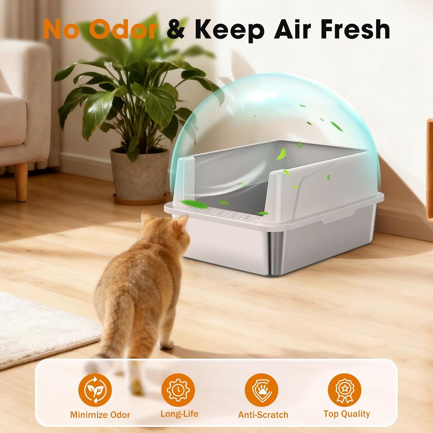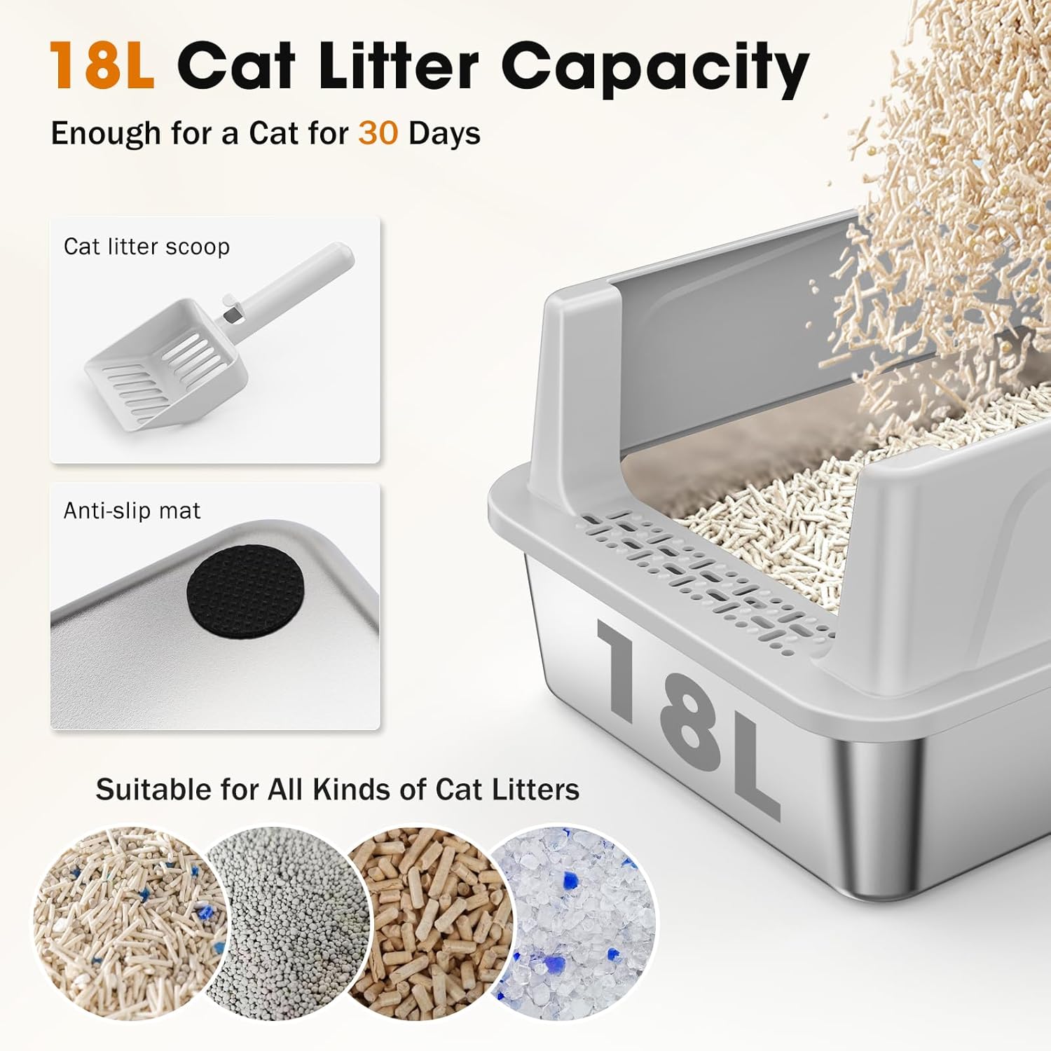 About this item 2PACK KITTEN STAINLESS STEEL LITTER BOX: The M-size (17.5*13.5*8.5in) is perfect for cats or small pets, providing private space. It is also very suitable for placement in small or limited areas. The XL-size (23*15*11in) can accommodate cats of various sizes, providing a more spacious and comfortable experience. Whether you have a mischievous kitten or an adult cat, MIXJOY different sizes litter box would meet your needs and offer your pets a comfortable experience. URINE LEAKPROOF &GREAT FOR HIGH PEEING CAT: The 8.5" high wall design can protect your cat's privacy and prevent urine leaking and litter spilling when the cat digs, MIXJOY xlarge stainless steel cat litter box help you save time in keeping maintenance. NEVER ABSORB ODORS & NON-STICK BOTTOM: MIXJOY metal litter box is made of high quality ABS closed, high wall enclosure and stainless steel litter pan. Unlike plastic litter boxes that produce unpleasant odors and stains after only a few uses, our large metal litter box does not absorb any residue or odors, and the smooth surfaces are non-stick, non-staining, and your cat will love it DURABLE STAINLESS STEEL CAT LITTER BOX: The MIXJOY Stainless Steel Litter box for cats is made of high-quality stainless steel metal and can be used for UP TO 5 YEARS, so as your kitten grows, you don't need to replace the litter box. REDUCED LITTLE TRACKING & EASY TO MAINTAIN: The high sided litter box has a filter pedal at the entrance to effectively filter litter from cat's paws, with a litter scoop makes cleaning easier, also high quality stainless steel bottom is non-stick, rust-proof. This Stainless Steel Litter Box holds up to 18L of litter, enough for small cats to use for 30 days. No more worrying about changing litter while working or traveling. AFTER-SERVICE SUPPORT: If you have any dissatisfaction with the product, please contact us at any time. We are eager to help you to solve the problem. Thanks for your time. › See more product details