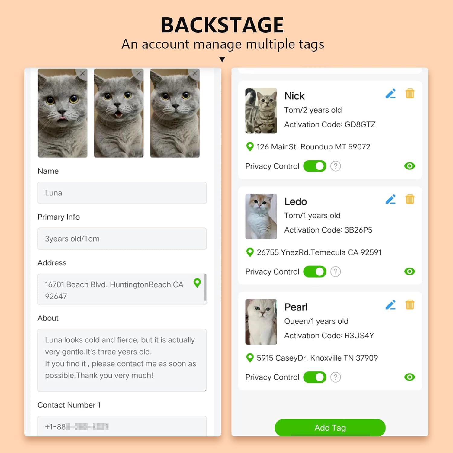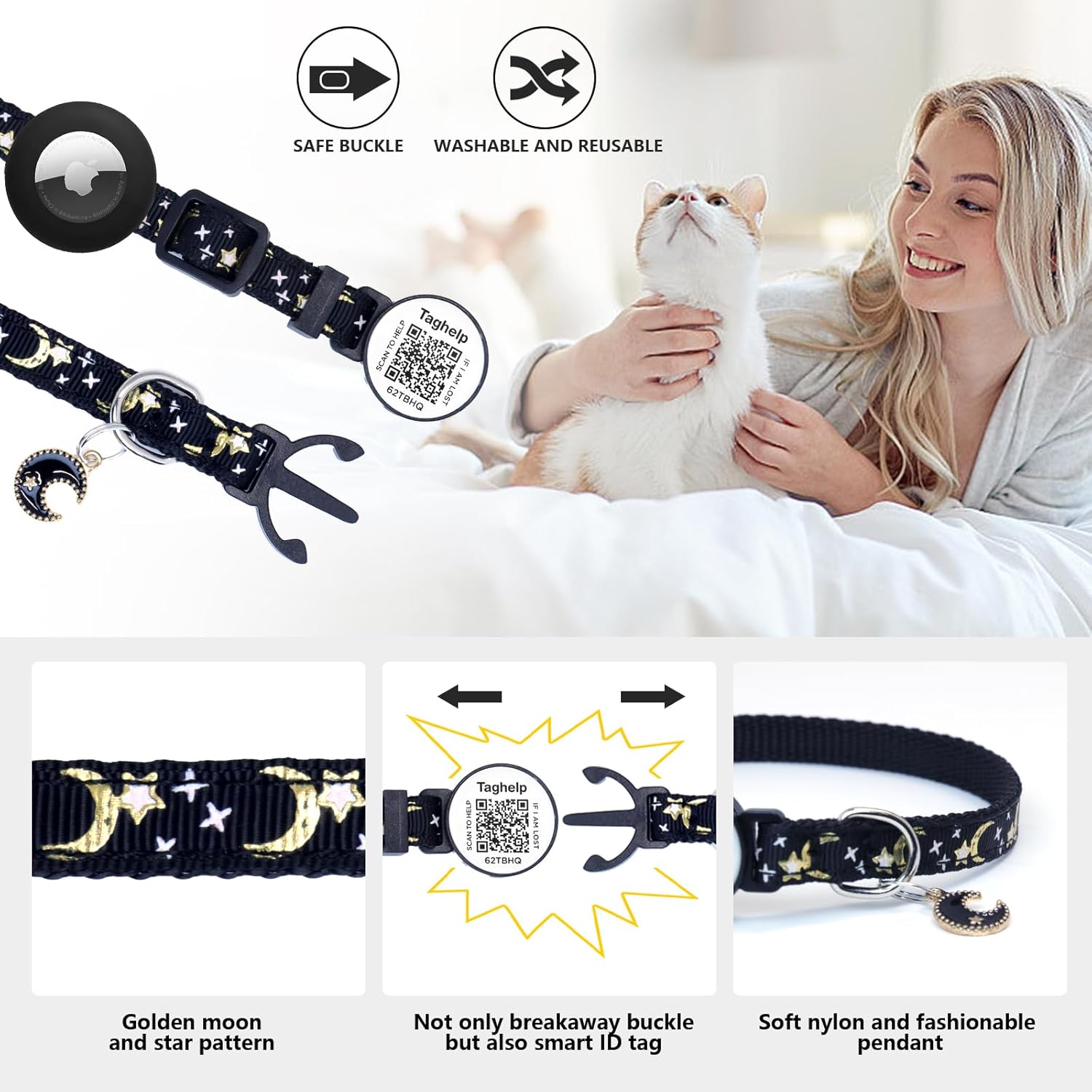 About this item 1.Reflective Cat Collar with QR Code Tag : The design of the reflective cat paw print pattern can improve the visibility of the cat in low light;The difference between this kind of collar and traditional collar is that the design of the safety button with a QR code ID tag, which is beautiful, convenient and practical, no need to wear a separate pet ID tag 2.2. Airtag holder is made of soft silicone, non-toxic and eco-friendly.And collar is made of soft nylon that won't scratch your cat's skin or cause any allergies. The holder can protect your device for Air Tags from dust, dirty, scratch and drop. You can wash&clean this silicone cover with water, it won't deform no matter how you knead it.With the lightweight Air Tag holder, your cat won't feel any discomfort even when wearing it for a long time.This AirTag holder comes with a metal keychain is offered so that you can easily hang the airtags everywhere 3,【Double anti-lost】Taghelp Airtag Cat Collar is designed specifically for apple airtag.The smart QR code is another way to provide location of pet.If someone scan the QR code,you will receive an email with pet location and you can find it on Google Maps.The more improtant things is the finder can call you directly if your pet is loosing.They are a perfect match to keep you aware of your pet's location at all times ; Note: AirTag is not included 4.【Setup & Use】 Scan the QR code to activate the tag.Link to profile page containing important information about pet, you can edit emergency contact,name, photos,home address and medical history . It is easy to manage and update the information stored on it when your address and phone number changed 5.A pulling force of approximately 2.5-3 kilograms can open the release buckle, which is roughly equivalent to the weight of an adult cat. That is to say, once a cat is caught by something, if it is a traditional collar, the cat will be strangled to death, but TAGHELP's cat collar can sacrifice itself to save your cat's life. So if one day you find that the collar is suddenly missing, please be happy about it, because Taghelp's collar saved your beloved cat's life › See more product details