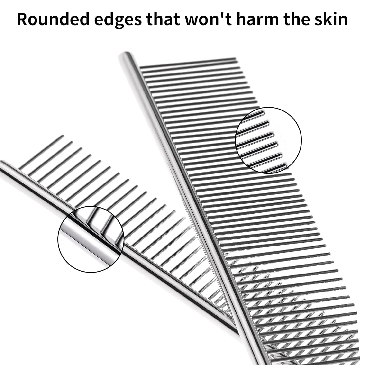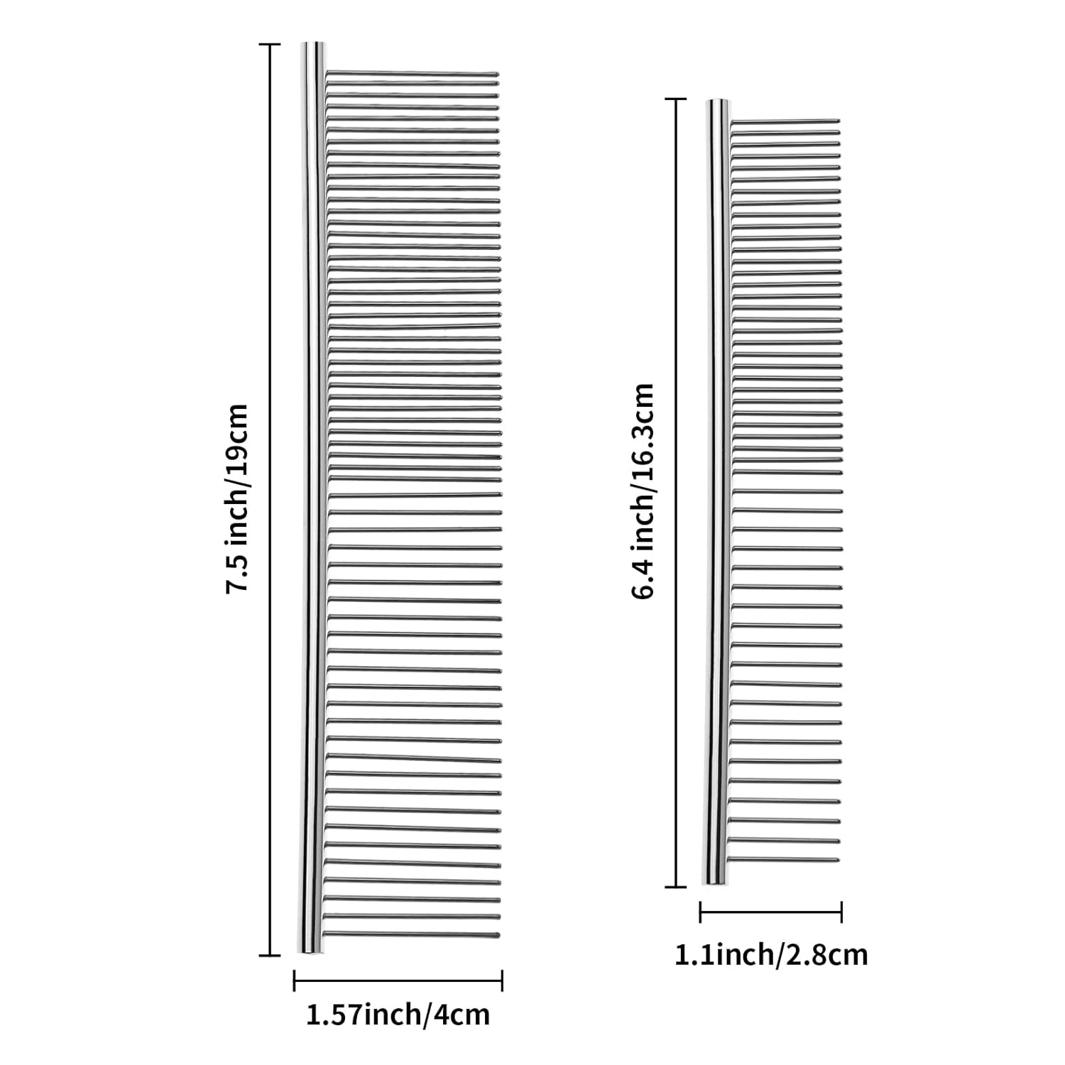 About this item Different Sizes: The deshedding dog brush is available in different sizes to meet the needs of pets of various sizes and hair types. The dog brush measures 7.5x1.57 inches and weighs 66g, suitable for large dogs. The cat brush measures 6.4x1.1 inches and weighs 47g. With a moderate weight, it provides a satisfying grooming experience for both pets and owners, even during extended grooming sessions. Premium Material: The metal comb is made of high-quality stainless steel, meticulously polished with a rounded handle for a smooth and comfortable grip. The treated steel comb can prevents static during use, making grooming a more pleasant experience for your beloved pets. Thoughtful Design: The dog grooming brush teeth are carefully crafted with rounded ends, ensuring that they won't harm your pets. Additionally, the comb offers multifunctionality by promoting blood circulation and massaging the skin while effectively handling tangles, mats, and loose hair. The teeth have two different densities - the dense part is suitable for grooming soft hair around the pet's eyes, ears, and legs, while the sparse part untangles hair. Convenient Portability: The cat hair brush set includes two compact combs of different weights, perfect for carrying in your car or bag, allowing you to groom your pets anytime, anywhere. Whether you're on an outing or camping with your beloved pets, they often bring back debris like burrs and pollen. With the combination of wider and narrower spaces, the dog hair brush can quickly navigate through small tangles and remove debris, restoring their smooth and glossy coat. Perfect Gift: These greyhound comb for dogs are suitable for long-haired and short-haired dogs, cats, and other furry pets, making them the perfect gift for pet parents or pet groomers on occasions such as Valentine's Day, Father's Day, Mother's Day, Thanksgiving, Christmas, and more. This practical gift will surely surprise and touch them. › See more product details
