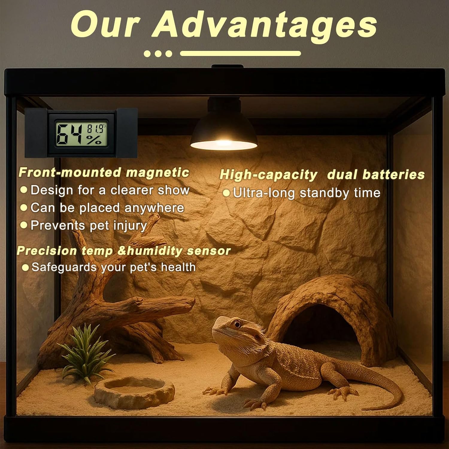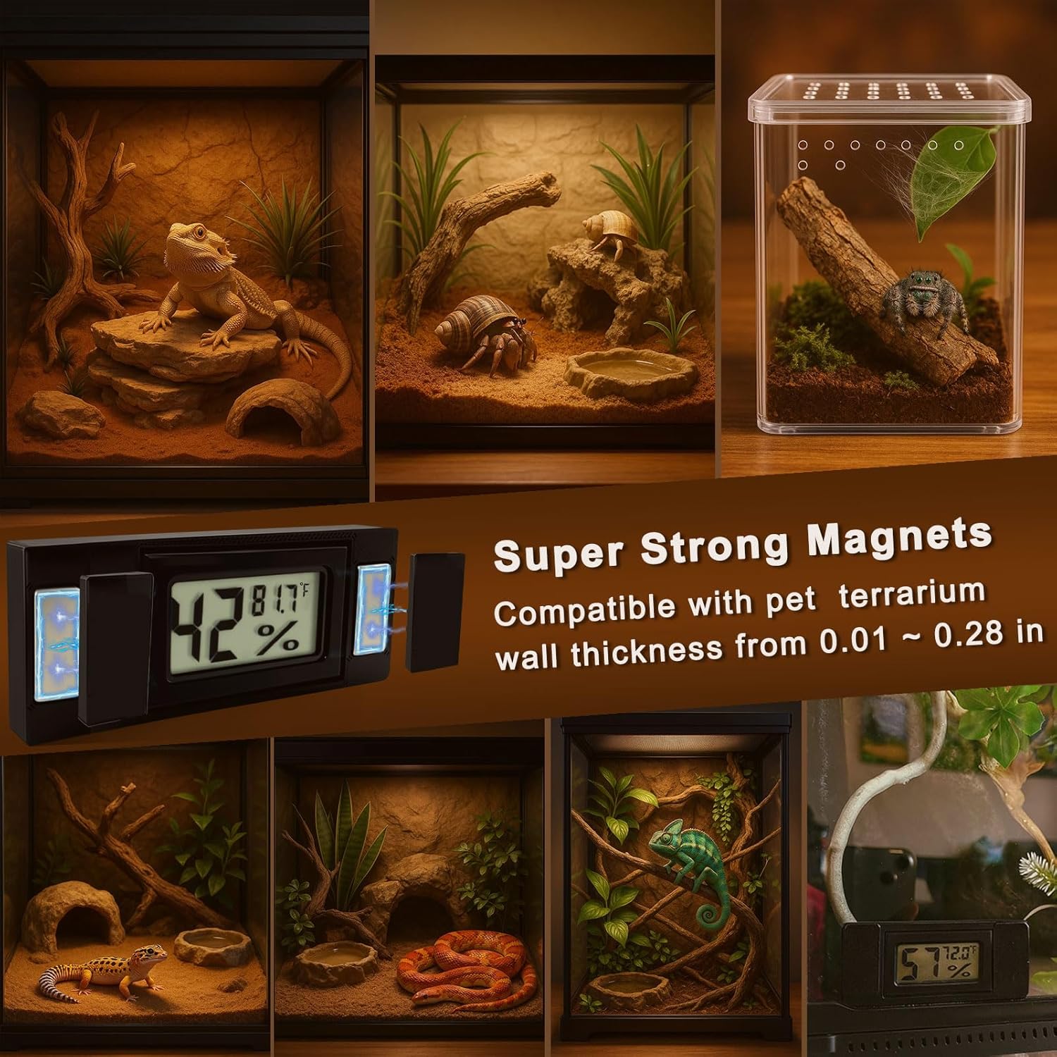 Keep Your Reptile's Habitat Perfect!Our Reptile Magnetic Thermo-Hygrometer makes monitoring temperature and humidity effortless. The front-mount magnetic design attaches securely to glass or plastic surfaces, giving you a crystal-clear LCD display right where you need it. No more reaching inside the tank – check accurate readings at a glance!Why You’ll Love It:High-precision temperature & humidity sensors for reliable dataOne-button control to switch between ℉ and ℃Dual batteries and low-power chip ensure long-term performanceBright LCD screen – easy to read day or nightPerfect for bearded dragons, geckos, snakes, tortoises, and moreMonitor smarter, stress less – your reptile deserves the best care!