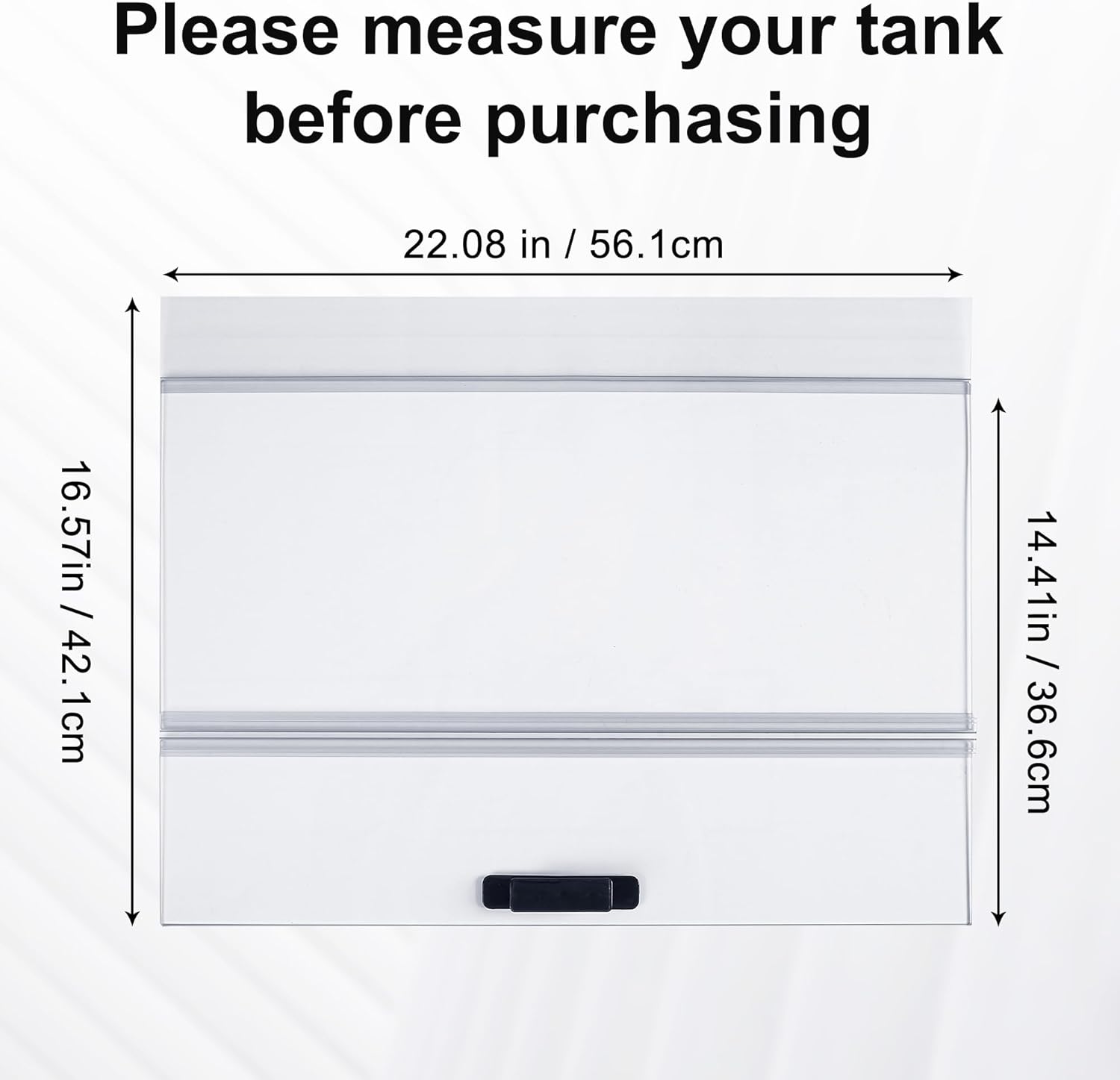 1. This Tank Hood will NOT FIT for Marineland, Perfecto, and Deep Blue tanks! It is only applicable to 75/90/110 Gallon Aqueon fish tanks. Please check the size carefully before purchasing and make sure it fits your tank. 2. Dimensions: 22.08 x 16.57 x 0.16in/56.1x42.1x0.4cm(Each Piece) The handle uses thin double-sided tape. Clean the glass fish tank cover first, keeping it dry and dust-free. Do not use immediately after pasting. Let it sit for over 24 hours for a firmer bond with the glass. 3. Clear Plastic back strip that can be cut to fit your Aquarium 4. Please measure your Tank opening to the closest millimeter before purchasing! There are different Aquarium manufactures. 5. Provides the area for your Lighting to sit while allowing simple access to your Aquarium 6. If you find any missing accessories or if the size does not meet your expectations, please feel free to contact us at any time, and we will handle it properly for you. › See more product details