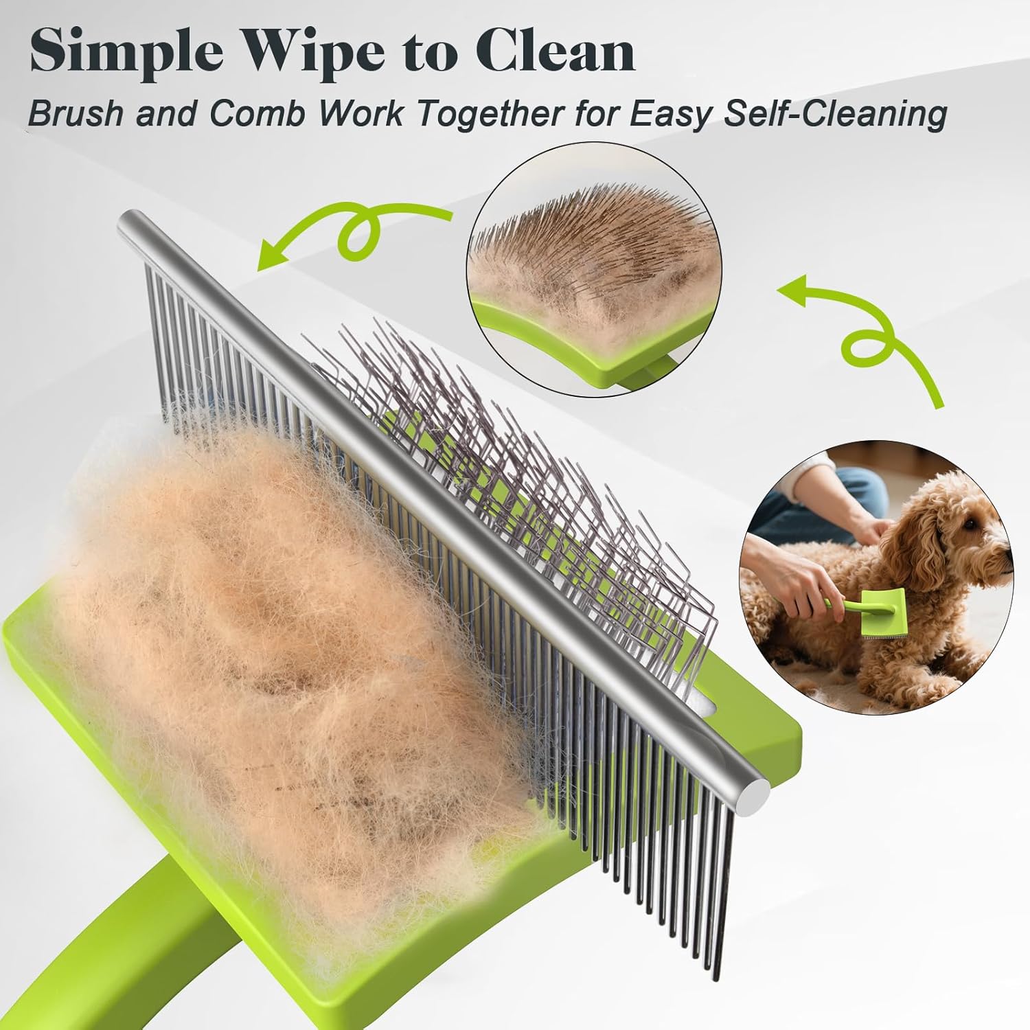 About this item 【Premium Dog Grooming Kit】Owning a professional dog slicker brush and a comb, you can effectively remove tangles, knots, and mats, significantly reducing brushing and drying time. Let you, as the groomer, give your furry companion a shiny, healthy coat - Goldendoodle Must Haves 【Professional Slicker Brush for Dogs】Designed for medium-length and curly-haired pets with thick, difficult-to-manage coats, our slicker brush features extra-long angled pins that penetrate deeply to remove dead hair and loose undercoat. It is the best choice for deep combing undercoat for Goldendoodles, Poodles, Labradoodles, etc.Ergonomic handle minimizes hand and arm fatigue during grooming sessions, making it an essential tool for shedding season 【High Quality Dog Comb】Made of high quality stainless steel, this comb is durable, corrosion resistant and will not fade, good for avoiding static electricity.Rounded pin ends are gentle to the skin.it’s perfect to promote blood circulation and massage skin 【Optimize Combing Function】Pin Length ≈ 1in,Tilt Angle ≈ 45° Extra-long pins effortlessly reach through dense coats, while the angled design protects sensitive skin. This innovative structure simplifies detangling by effectively accessing the undercoat.Ideal for Poodles, Bichons, Labradoodles, Goldendoodles, and Other Doodle Breeds 【2-Year Warranty & Support】As a professional pet care brand, we are committed to providing safe, practical, and affordable solutions. Enjoy peace of mind with our 7*24 customer support and 2-year quality guarantee covering any manufacturing defects › See more product details