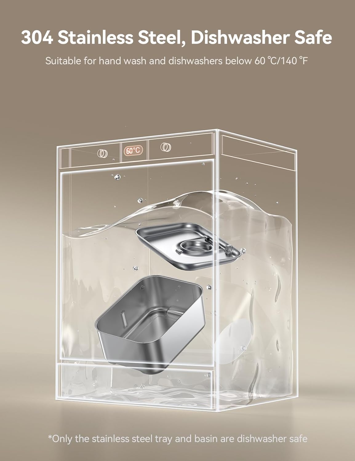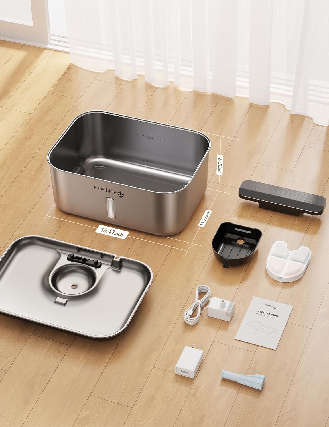 About this item 3.2Gal/406oz/12L Large Capacity: This dog water fountain is ideal for large dogs, cats, and multi-pet households, reducing the need for frequent refills. The water level window allows you to check the water level at a glance, so you don't need to lift the lid as often Swirling Water Flow & Embedded Water Tray: The low-water outlet and the tilted tray design create two circles of swirlings, which wash away impurities such as hair in the tray, and the flowing water also attracts the attention of pets. The embedded tray is also less likely to be knocked over by your dog No Splashing Deeper Tray: The water tray of this pet water fountain is 1.2 inches deeper, which is more in line with the dog's drinking method. The tilted design of the water tray allows the dog to drink easier without splashing, no matter how big the dog or pet is. The floor is cleaner Ultra Silent Design & Multi-Layers Filtration: This pet water fountain operates quietly, with a noise level <25 dB, making it barely noticeable in daily life. The fountain features a 4-layer filtration system that includes activated carbon, ion exchange resin, non-woven fabric, and a high-density pump sponge. This combination ensures fresh, clean water. We recommend replacing the filter every 2 weeks for the pet's health 304 Stainless Steel Material: Crafted from 304 stainless steel, the water tank and tray are safer and more durable than plastic. This material ensures clean, healthy pet water and helps prevent feline acne. Plus, it's suitable for dishwashers below 60 ℃/140 ℉. Note: Only the stainless steel water tank and water tray are dishwasher safe Pack Contents: Pet water fountain, water pump, filters*2, user manual, power adapter. For technical issues, please contact customer support—we value your experience › See more product details
