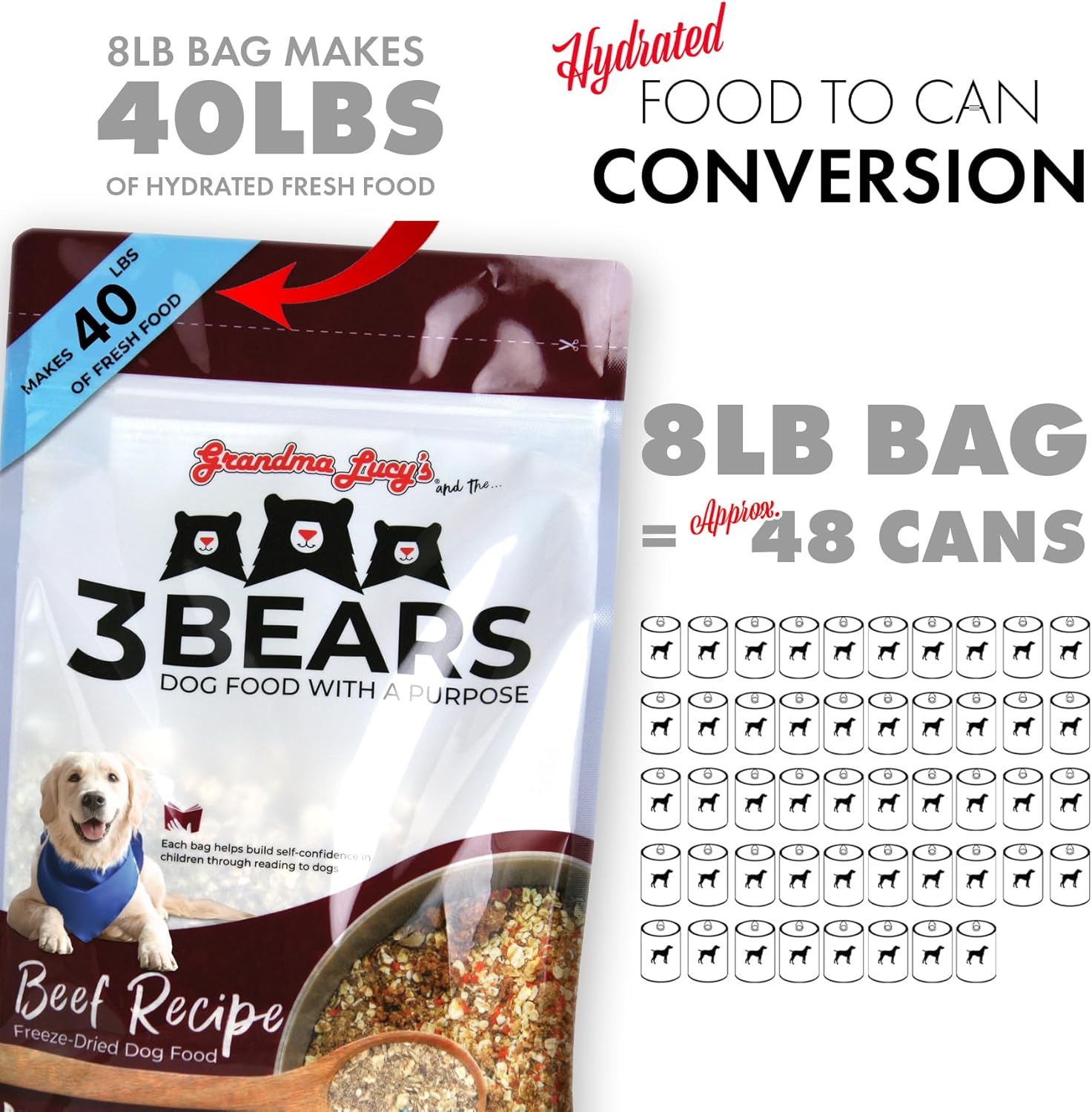 Fresh, freeze dried dog food easy to prepare, nutritious, complete and balanced meal or a great snack for your pup. Just add water to our grain-inclusive Grandma Lucy's 3 Bears Beef and watch it transform into a hearty, oatmeal-like consistency within minutes. Packed with USDA beef and beef liver and featuring a blend of super food ingredients including flax, coconut, kale, and cranberries. Shelf stable, lightweight, and preservative free. Fresh, wholesome nutrition made simple that will keep your pups bowl licked clean! Fresh, premium all natural, freeze-dried beef dog food: minimally processed, grain-inclusive recipe featuring human-quality, gently cooked USDA meat and meat organs as the number one primary ingredient, paried wtih whole foods like carrots, coconut and kale. Delivers complete and balanced nutrition suitable for all dog breeds and life stages. Highly digestible recipe helps support skin and coat. This premium quality USA-made freeze-dried dog food features small-batch crafting with advanced freeze-drying technology that locks in essential nutrients and delivers superior taste, texture, and aroma without preservatives. The convenient lightweight design creates a shelf-stable dog food that needs no refrigeration or freezing, offers quick preparation by adding water, and provides exceptional value. Serve as a complete meal, tasty topper, mix-in, or with lick mats and interactive toys - just add water to create this protein-packed, wholesome recipe. Great for road trips, hiking excursions, camping adventures, and vanlife. Grandma Lucy's is proudly Family Owned and Operated and dedicated to giving back for over 25 years. Each bag of 3 Bears Recipe sold helps build self-confidence in children through reading to dogs.